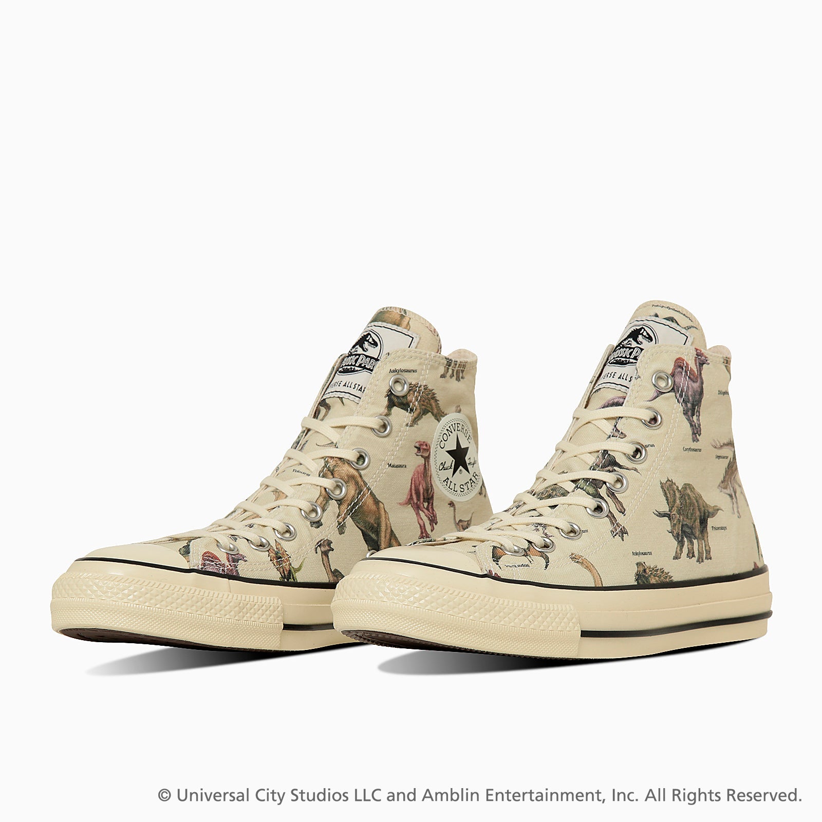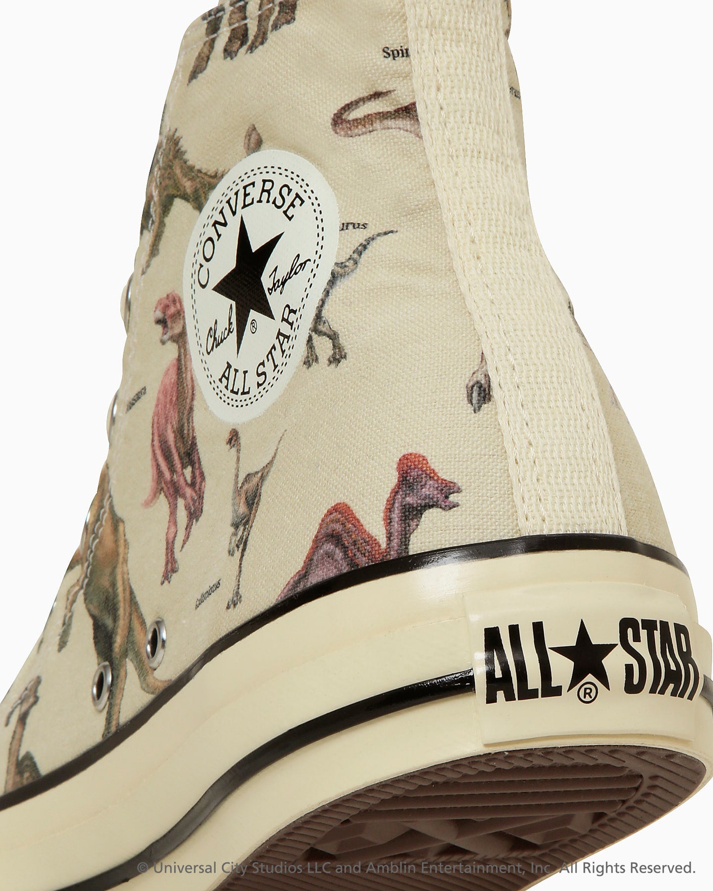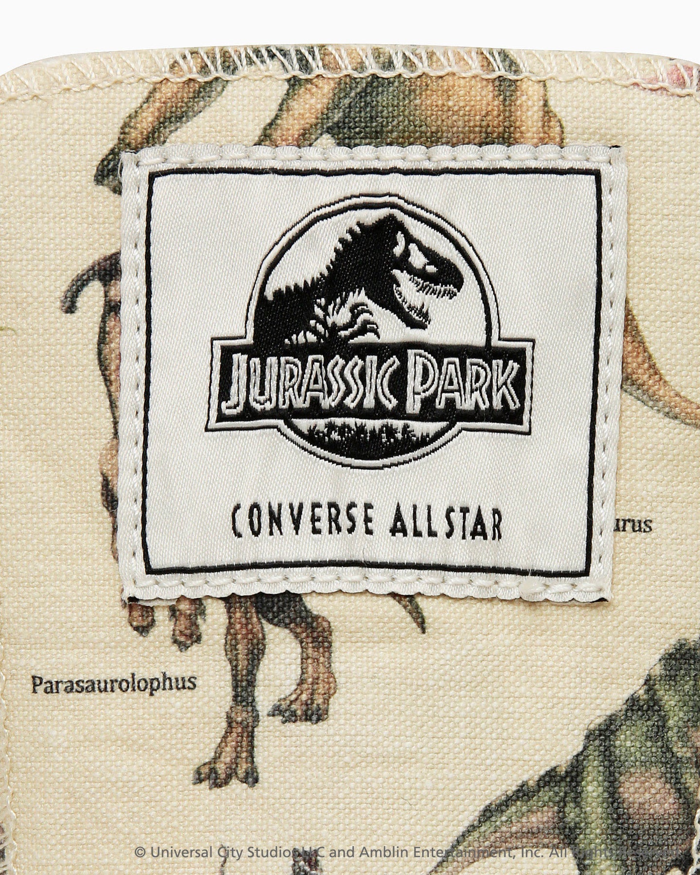 All Star Aged 與 1993 年上映、享譽全球的經典電影侏羅紀公園的聯名款式,以人氣恐龍圖案為靈感,將電影中登場的各種恐龍繪製成原創圖案,並印製在鞋面上,鞋舌上附有仿古著戶外夾克標籤設計的布標,透過水洗加工、深米色的鞋帶與側邊飾帶,營造出如在古著般的復古氛圍。