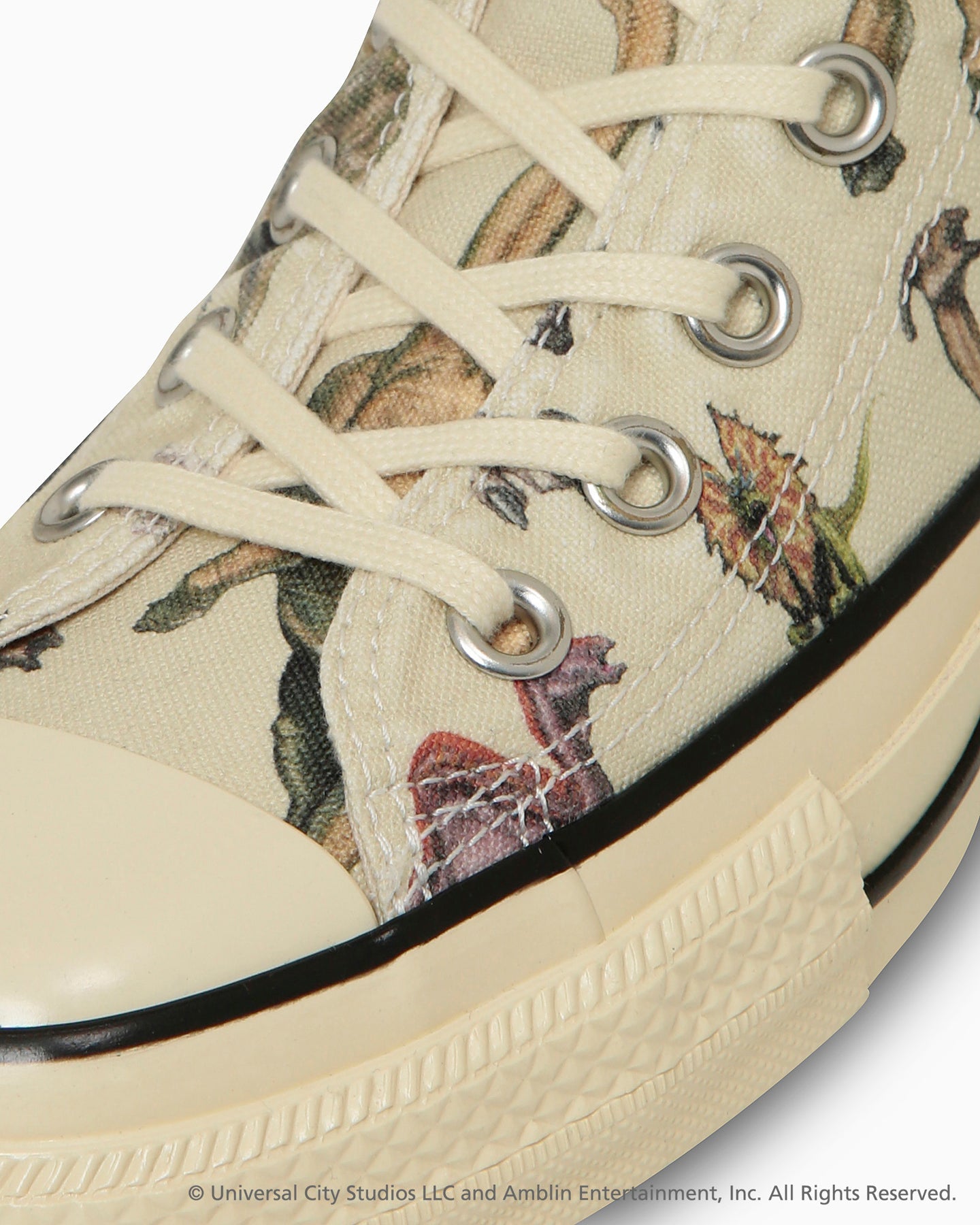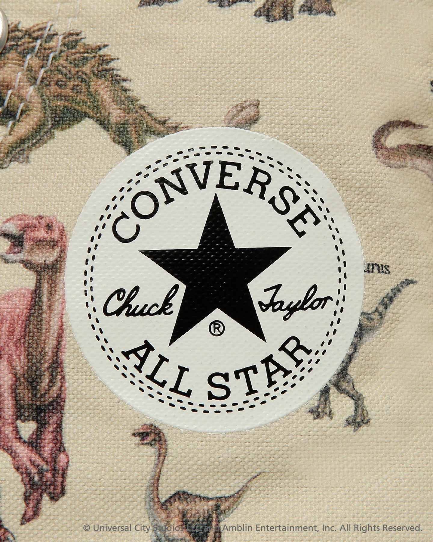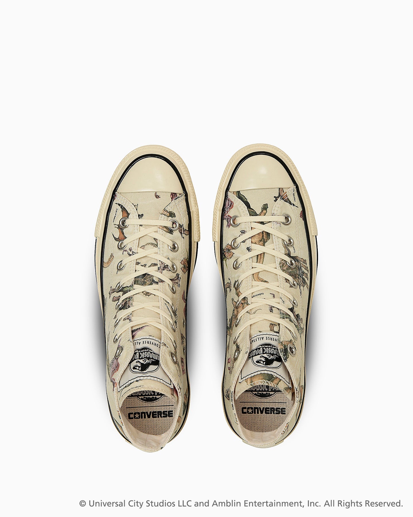 All Star Aged 與 1993 年上映、享譽全球的經典電影侏羅紀公園的聯名款式,以人氣恐龍圖案為靈感,將電影中登場的各種恐龍繪製成原創圖案,並印製在鞋面上,鞋舌上附有仿古著戶外夾克標籤設計的布標,透過水洗加工、深米色的鞋帶與側邊飾帶,營造出如在古著般的復古氛圍。