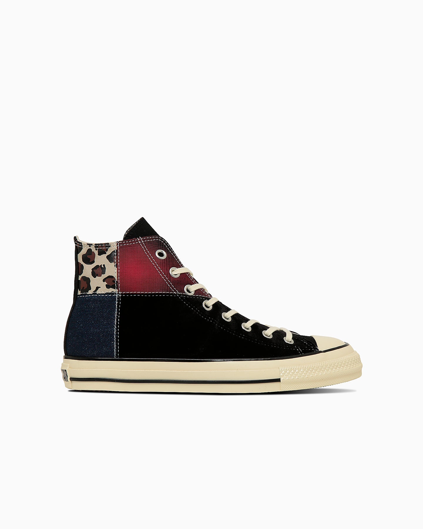 以「Neo Grunge」為主題的 All Star Aged 細節改良款,融合四種異材質:暈染格紋、豹紋、丹寧與絲絨,展現出混搭衝突感十足的經典 Grunge 風格,搭配深米色的鞋帶,增添整體的復古氛圍。