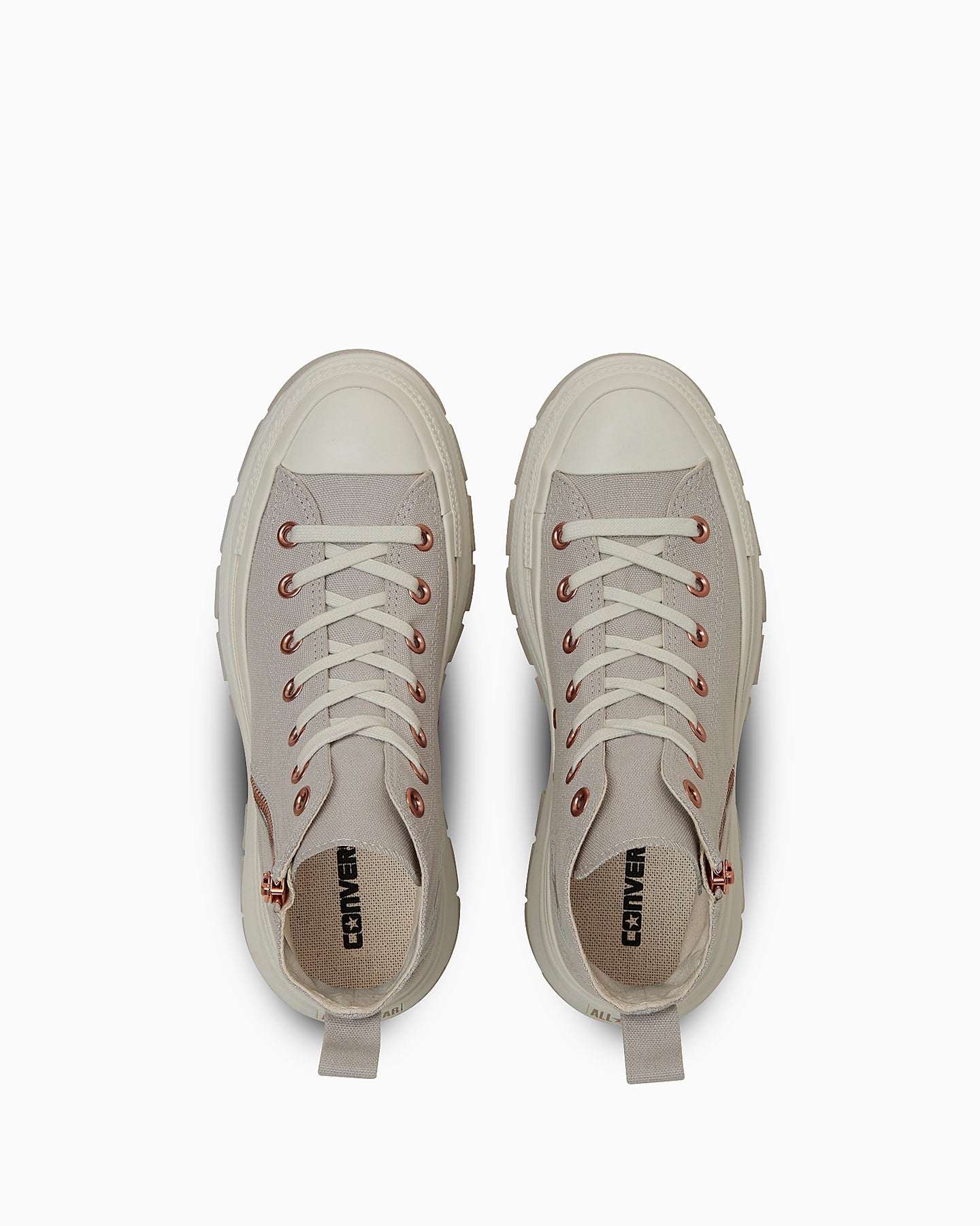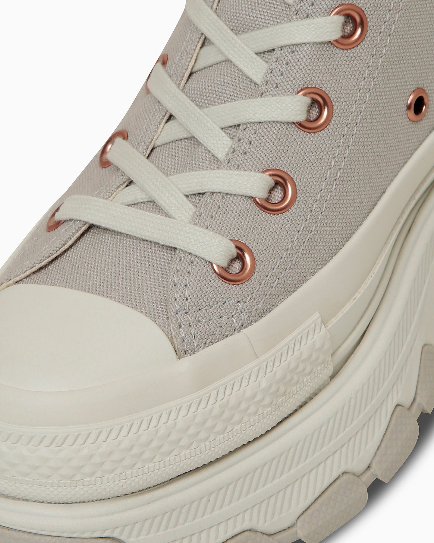 以經典的ALL STAR款式融合了登山鞋風格、擁有厚底的TREKWAVE系列,推出了限定的改版款式。在鞋側增加了拉鍊設計,提升了穿脫的便利性,鞋面採用沉穩的暖灰色帆布,外側拉鍊則搭配了玫瑰金配色,鞋面同色系的標誌與鞋底設計,讓整體呈現出柔和的氛圍。厚實的E.V.A.鞋底與考量防滑性的紋路設計,提升了緩衝性與防滑性,鞋墊則使用了高密度聚氨酯泡棉及橡膠海綿,提供舒適的腳感。
