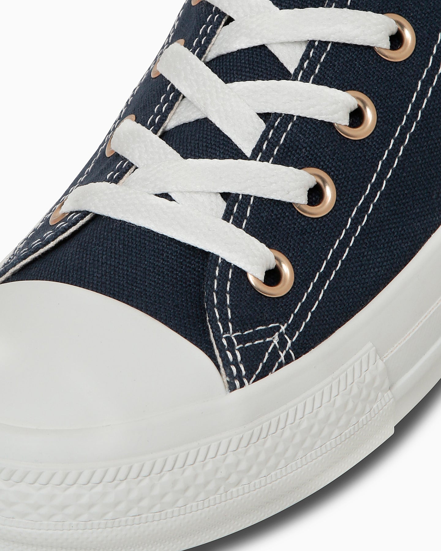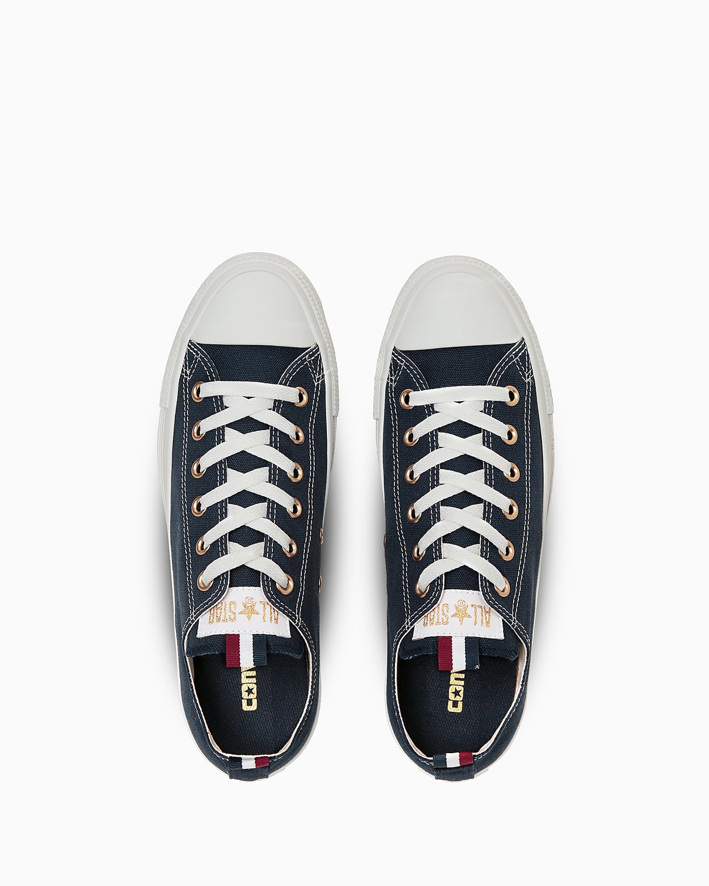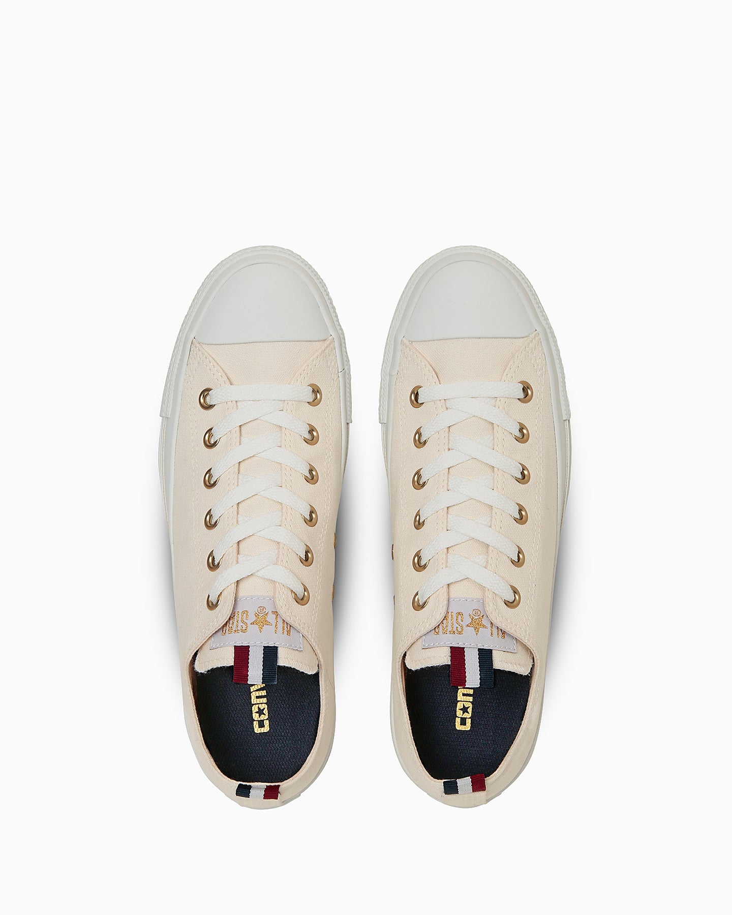 以海洋為主題的 All Star 系列鞋款,採用帆布材質鞋面,在鞋舌與後跟處點綴了經典水手風配色「藍白紅三色」作為設計亮點,鞋舌與後跟標籤的 LOGO 以及鞋眼孔統一使用金色,打造出復古典雅的氛圍。
