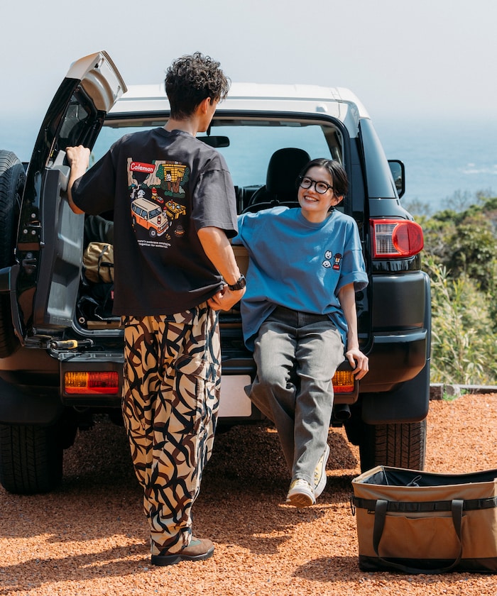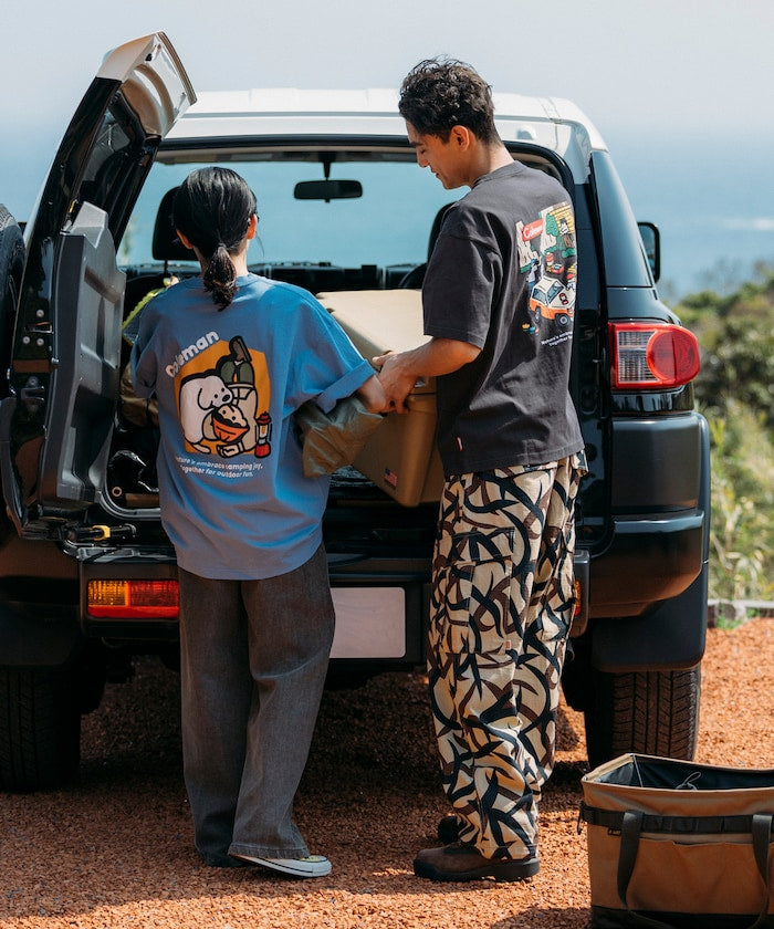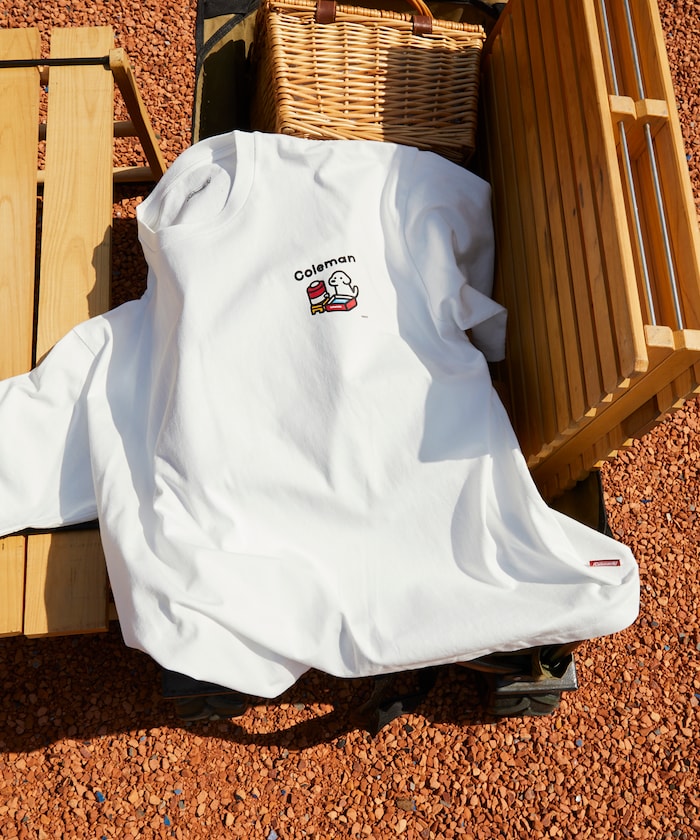 此款為 Coleman 與日本人氣插畫家 Matsui 推出的聯名限定單品,由插畫家 Matsui 親自繪製設計,正面胸口處以戶外常見的水壺與可愛狗狗的插畫作為點綴,展現溫馨氛圍,背面則印有描繪被岩山環繞的露營地景色,悠閒於小木屋中的狗狗、享受大自然的人們,以及手寫風格的標語,左下擺繡有 Coleman 專屬的布標,採用手感柔軟、耐穿不易變形的 8 盎司中厚磅純棉材質,搭配標準版型,無論是露營或日常穿搭都實用又吸睛。