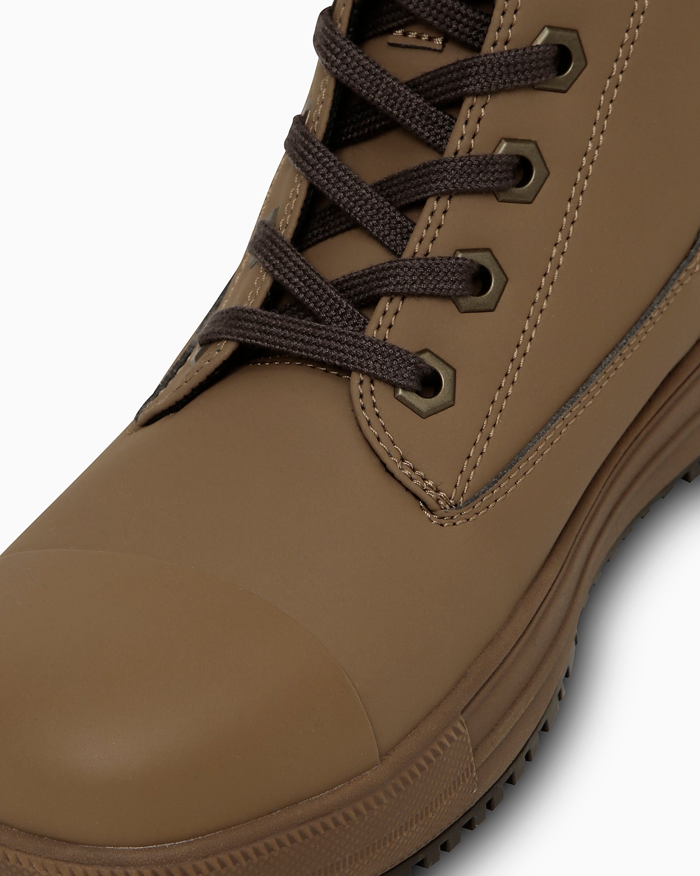 兼具安全性、耐穿性以及 CONVERSE 獨有設計感的 ALL STAR PS 進階機能款,以 ALL STAR PS 為基礎,新增防潑水機能,即使在容易弄濕的環境中也能舒適工作,腳踝內側襯裡使用柔軟且帶有絨毛質感的保暖材質,有效阻隔冷風侵入,隨鞋附有一組絨毛觸感柔軟的保暖鞋墊,可防止地面寒氣傳導,鞋面以工裝靴為靈感重新設計,搭配六角形鞋眼,展現硬派風格。