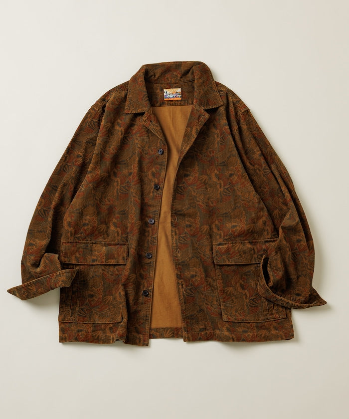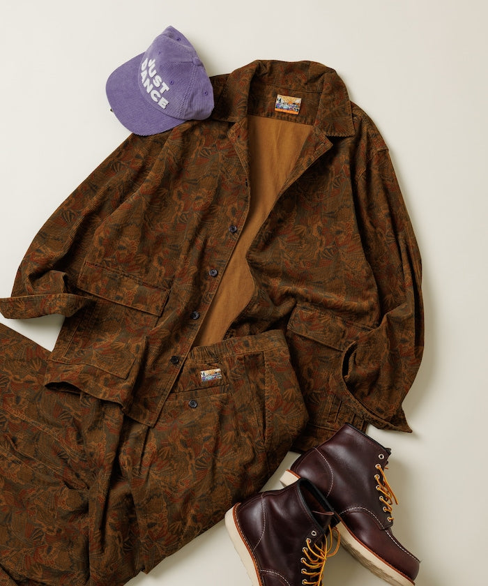 採用細條燈芯絨布料,搭配全版印花設計,經過特殊處理,營造獨特的復古質感,融合襯衫與外套細節,打造百搭實用的襯衫外套,寬鬆休閒的版型,方便進行層次穿搭,標籤與背標由插畫家佐藤薰親筆設計,是一款單穿即是造型主角,散發濃厚復古氣息的燈芯絨襯衫外套。