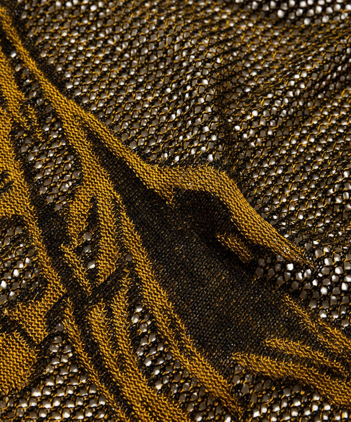 使用透氣的網眼針織面妙,採用雙色紗線,運用德國製高精度針織機精細編織出原創花卉圖案,展現高質感細節。特殊的編織技術呈現細膩、複雜且層次分明的圖樣效果,輕盈的透膚感設計,不僅適合日常穿搭,也能輕鬆融入度假、戶外活動等多種場合。