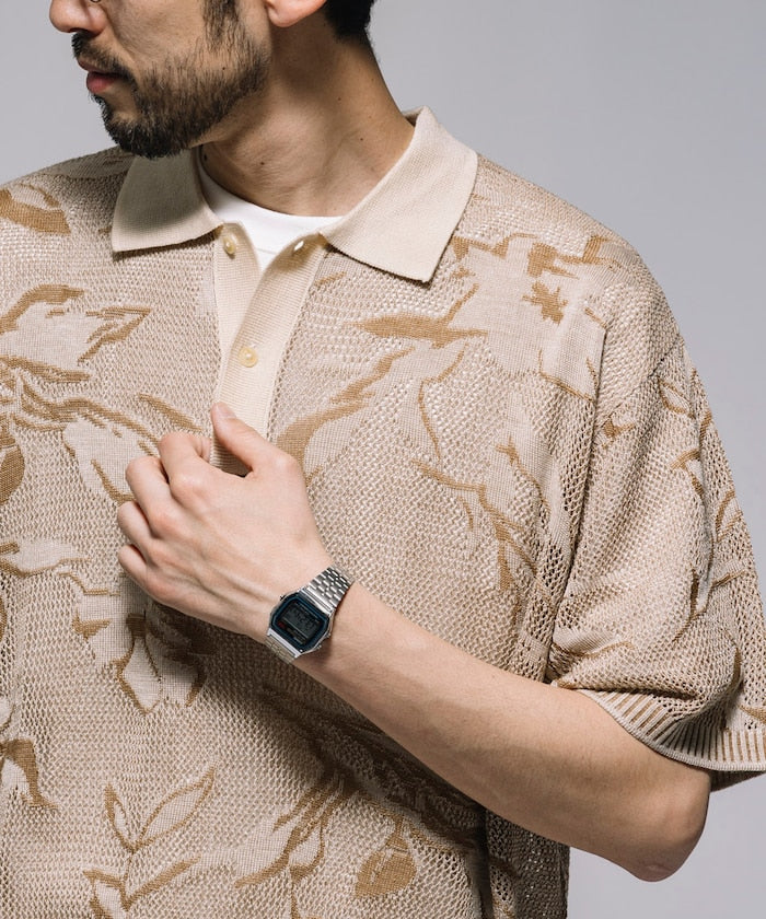 使用透氣的網眼針織面妙,採用雙色紗線,運用德國製高精度針織機精細編織出原創花卉圖案,展現高質感細節,特殊的編織技術呈現細膩、複雜且層次分明的圖樣效果,帶有適度透膚感的針織POLO衫設計,是夏日穿搭的理想選擇,不僅適合日常穿搭,也能輕鬆融入度假、戶外活動等多種場合。