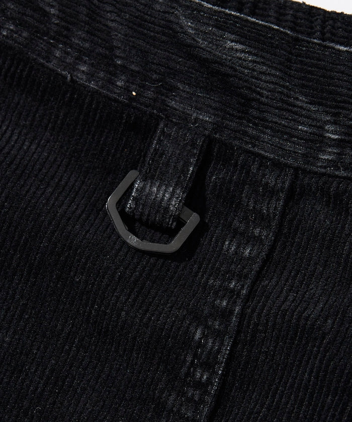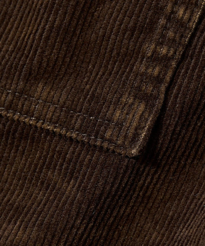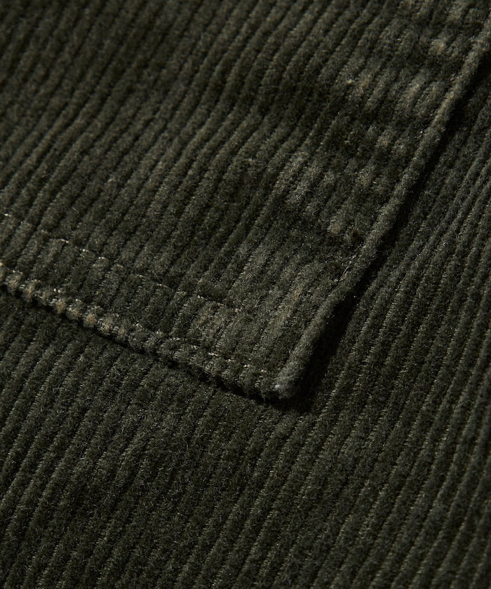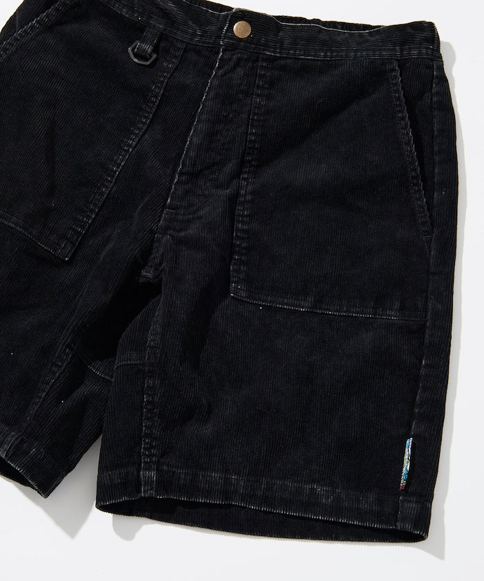 採用特殊加工(Powder Bleach)打造的夏季燈芯絨短褲。使用標準寬細比例燈芯絨面料,不會過粗或過細,並經過特出加工處理,呈現出獨特的仿舊褪色感與微微刷毛質感,氛圍感十足,採用工裝口袋設計,結合經典與仿舊細節,營造出復古視覺效果。腰部有抽繩設計,穿脫方便、可自由調整鬆緊,附有可掛扣具,增添戶外機能細節,寬鬆剪裁搭配及膝褲長,適合多種造型搭配,穿著舒適又自在。標籤部分採用插畫家 Kaoru Satou 親筆設計的圖案,細節也充滿藝術氣息。