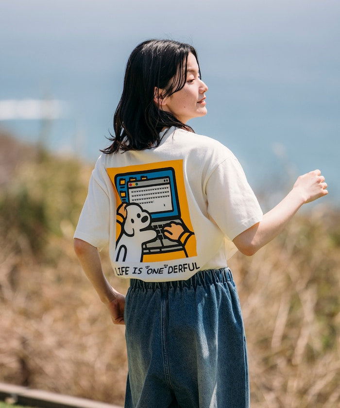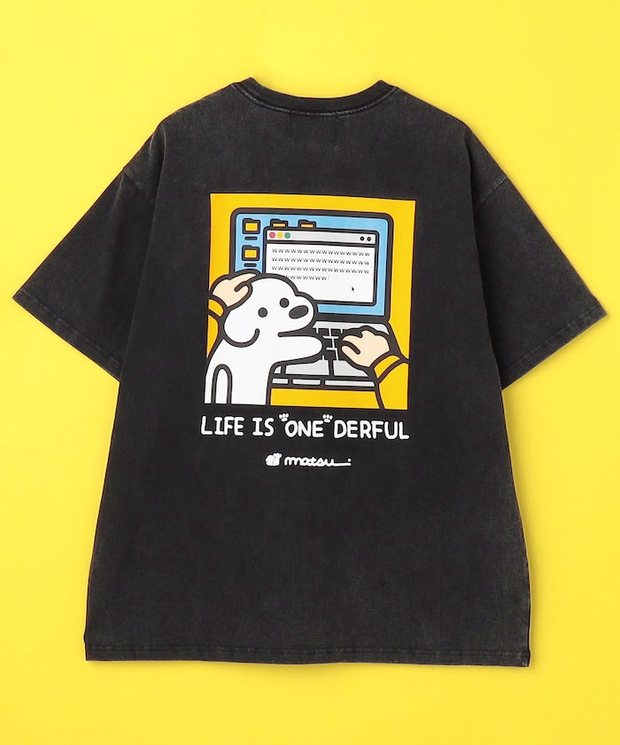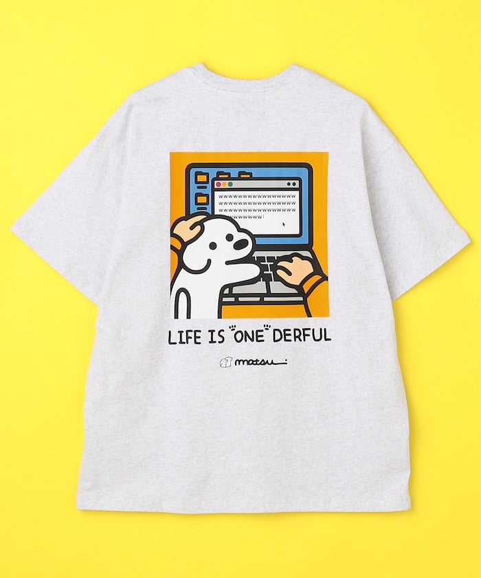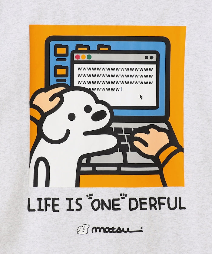 FREAK'S STORE 與日本人氣插畫家 Matsui 推出的聯名限定單品,由插畫家 Matsui 親自繪製設計,正面胸口以緊緊依偎的狗狗插畫作為低調可愛的點綴,背面則描繪出正對電腦工作的飼主投以炙熱視線的狗狗,搭配手寫風格的標語「LIFE IS ‘ONE’DERFUL」與藝術家簽名圖樣,「ONE」DERFUL 結合了英文中的 "Wonderful" 與日語中「狗叫聲=ワン」的諧音,傳遞出與愛犬共度美好時光的主題。