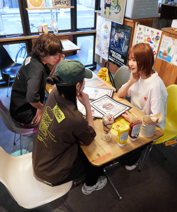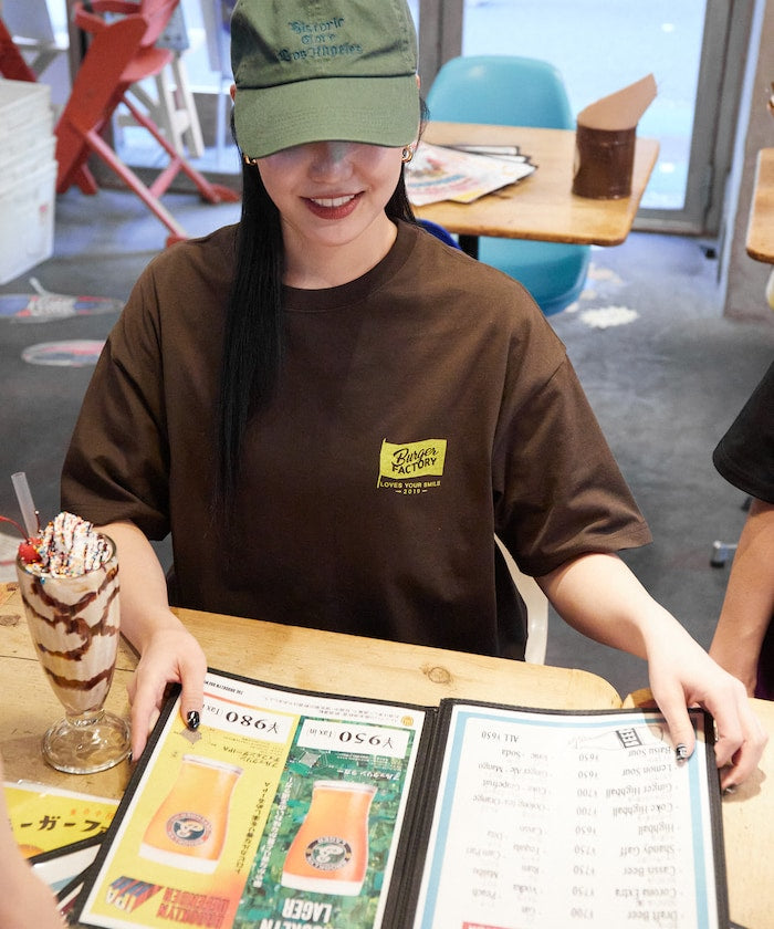 與日本的漢堡專賣店【Burger Factory】聯名推出的限定單品,背面印有店內人氣菜單的原創圖案,正面則為簡約的圖案設計,採用單色印刷,更凸顯圖案設計的精緻與質感。適中的寬鬆剪裁,男女皆能搭配各種造型穿出自我風格。