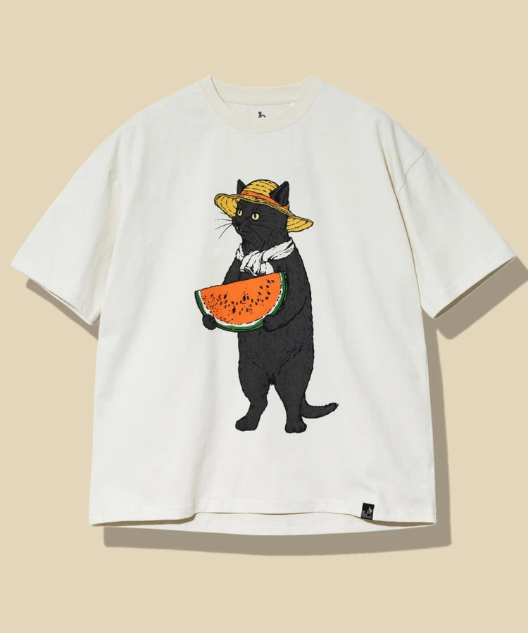 正面為戴著草帽的貓咪、拿著的西瓜種子為字母造型,細節中還藏有巧思,寬鬆的版型設計,衣長為基本長度,穿起來輕鬆舒適。材質選用經典的美國棉,保有特有的乾爽質地與柔軟觸感,非常適合作為日常穿搭,布料紮實耐穿,給人十足的安心感。