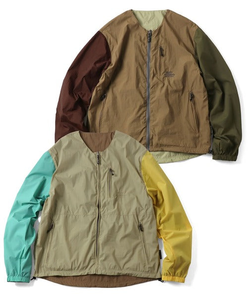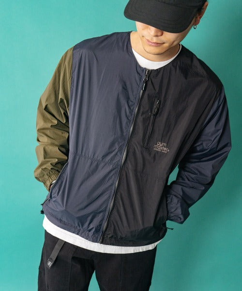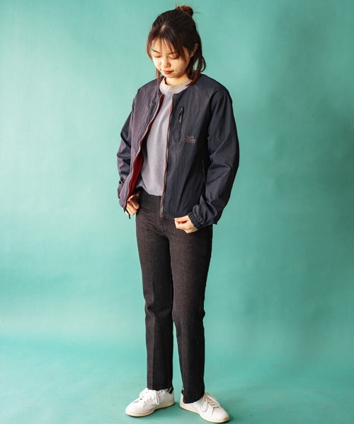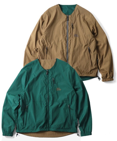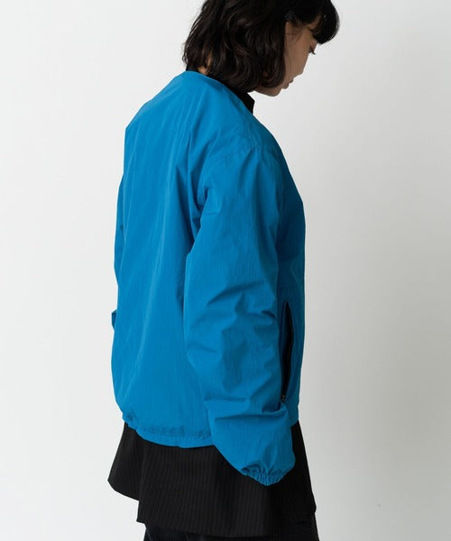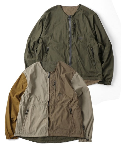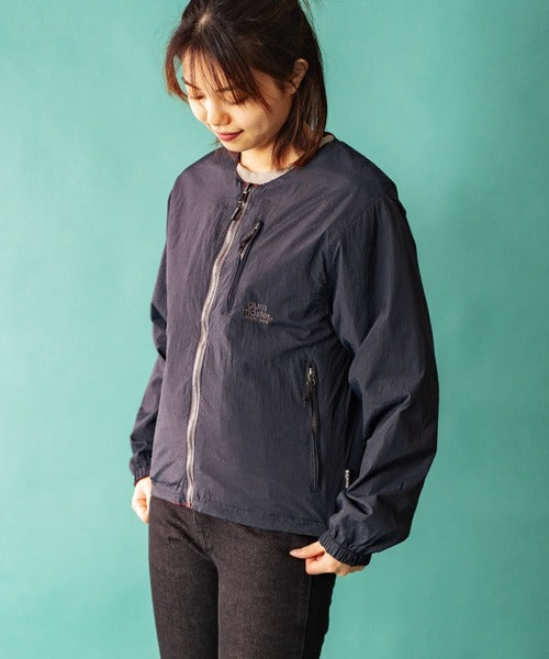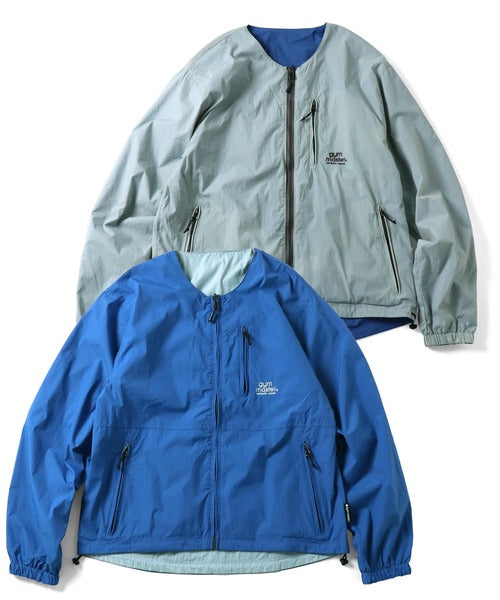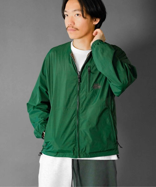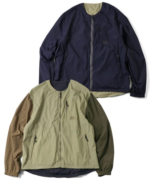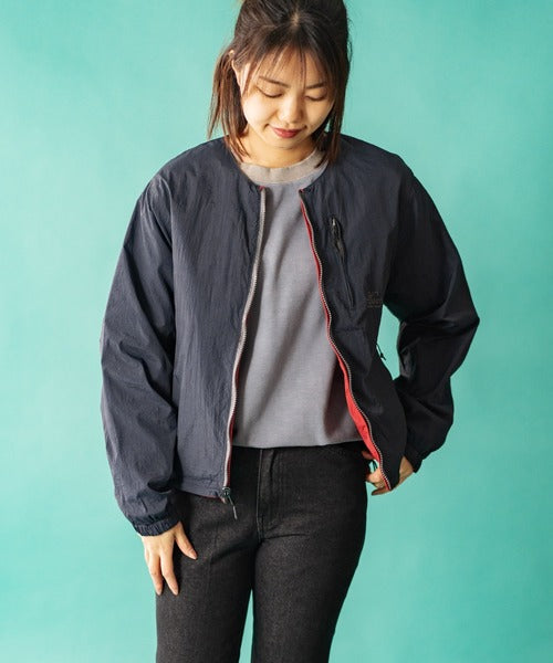 採用堅挺又輕盈的尼龍材質,可雙面穿搭的輕量無領夾克外套,隨著多種頸部造型的興起,