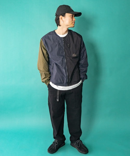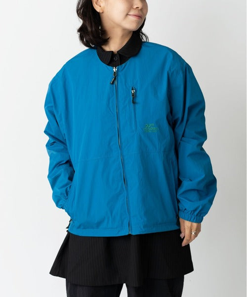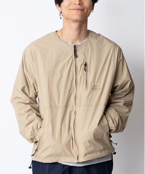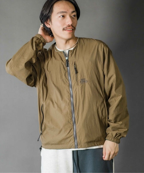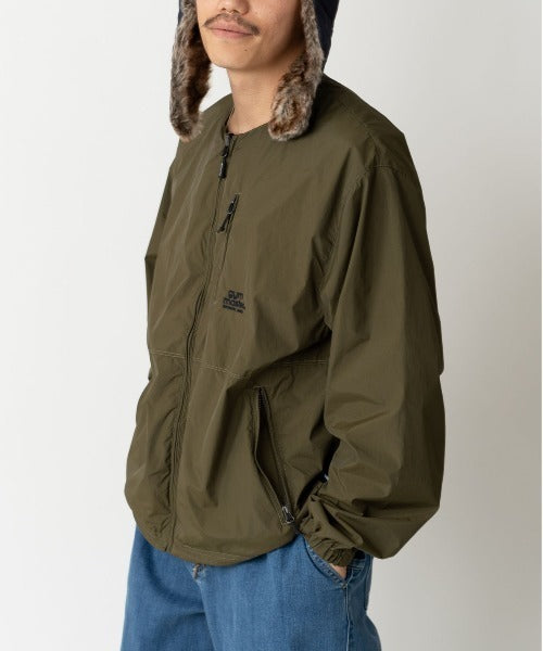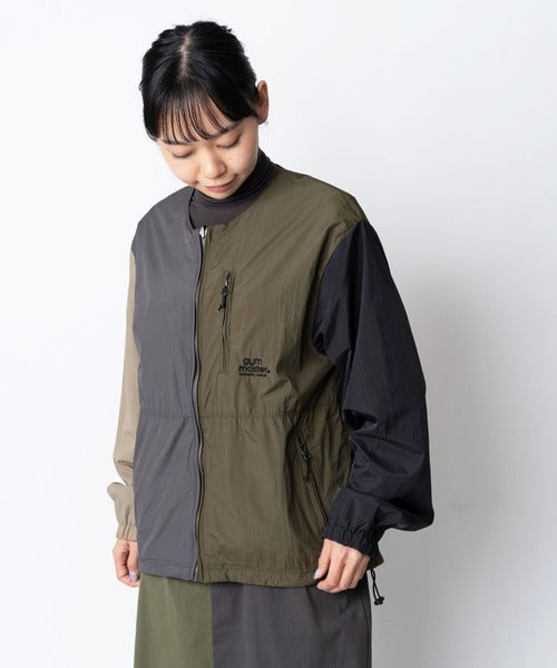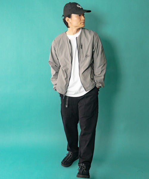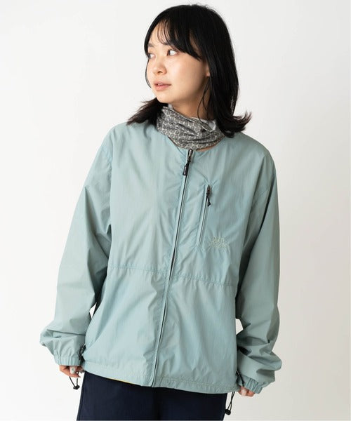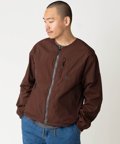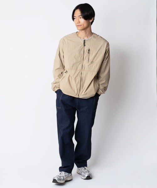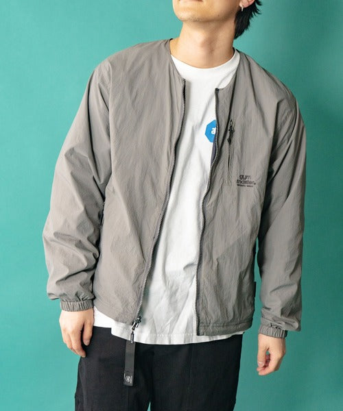 採用堅挺又輕盈的尼龍材質,可雙面穿搭的輕量無領夾克外套,隨著多種頸部造型的興起,