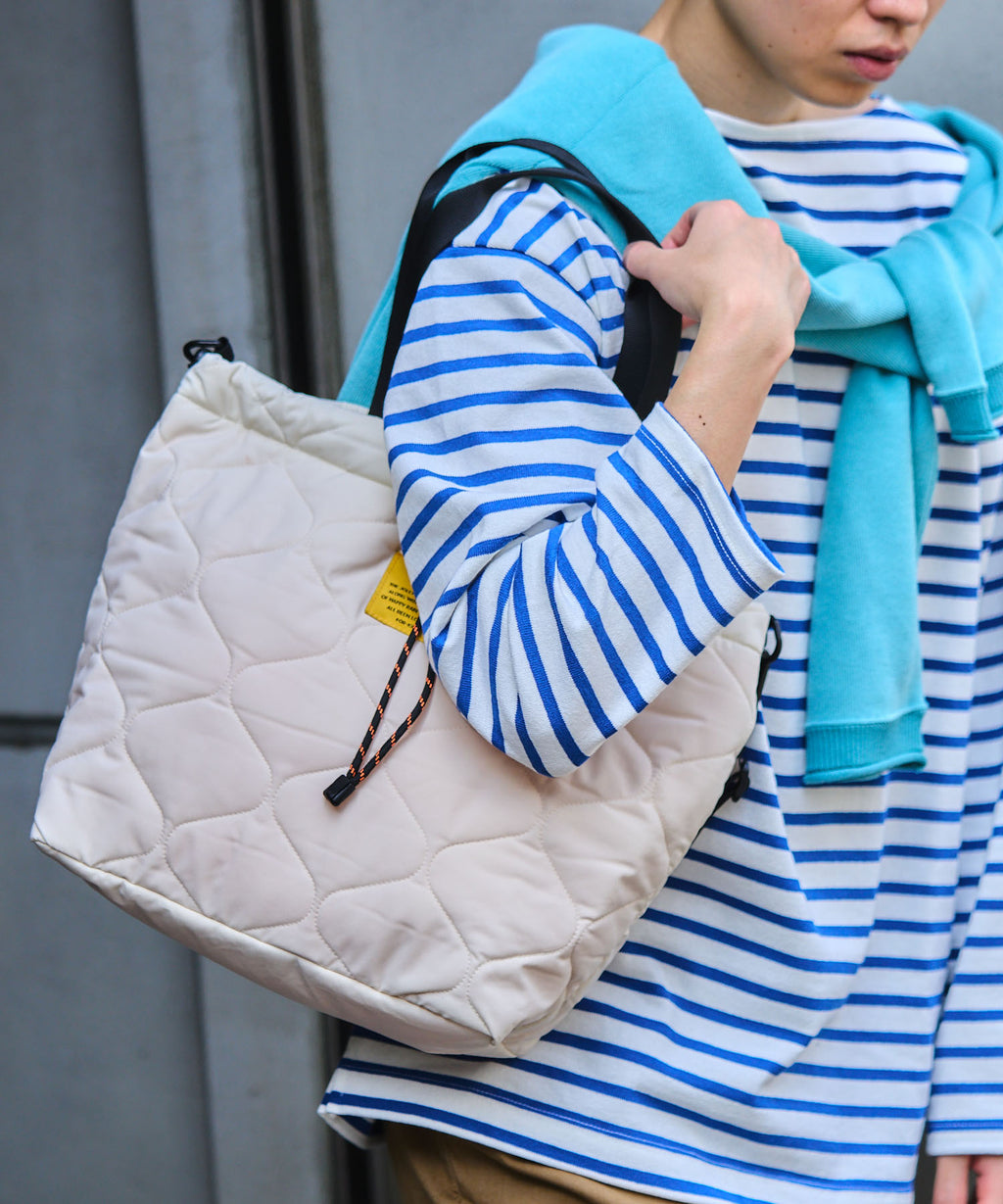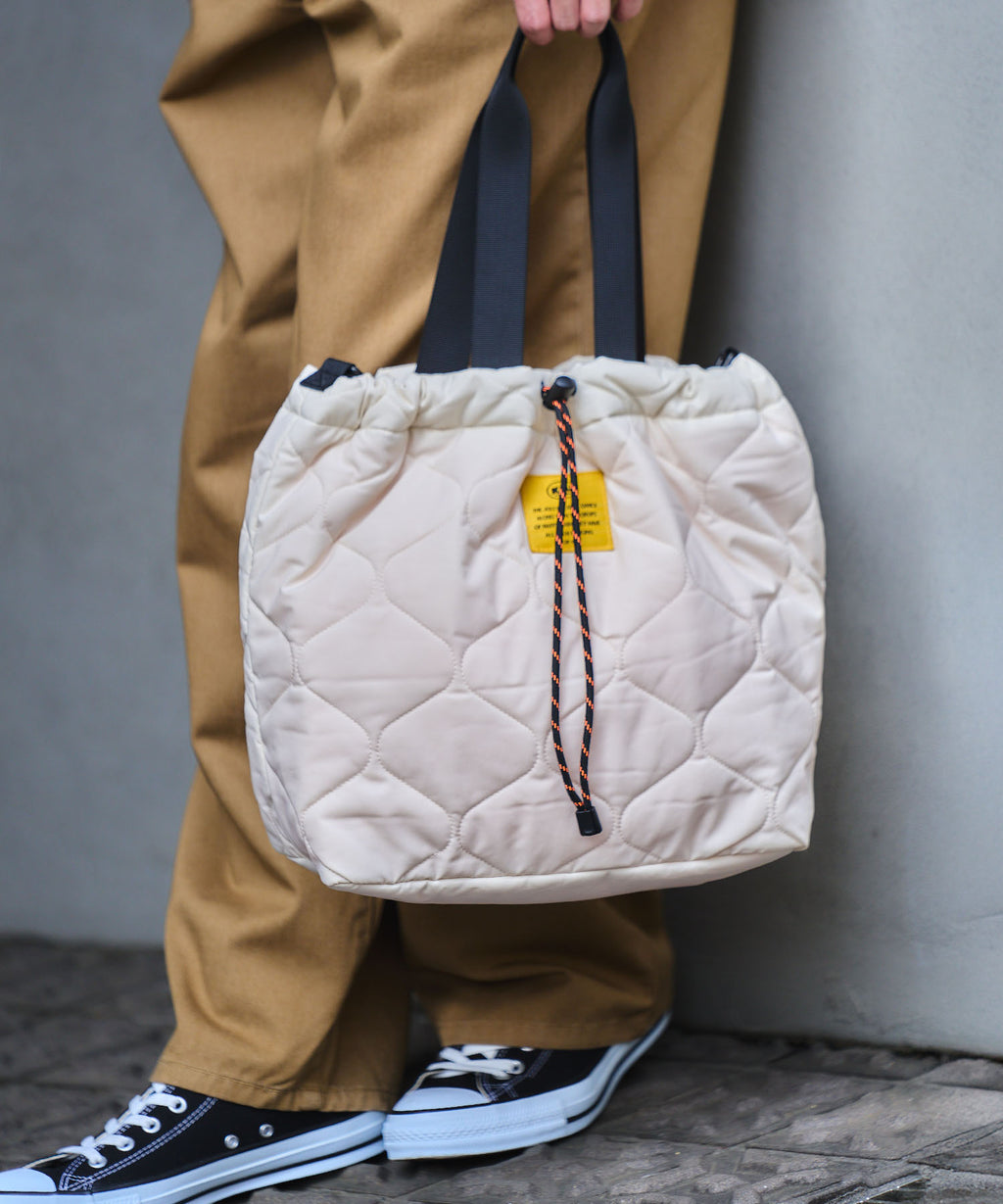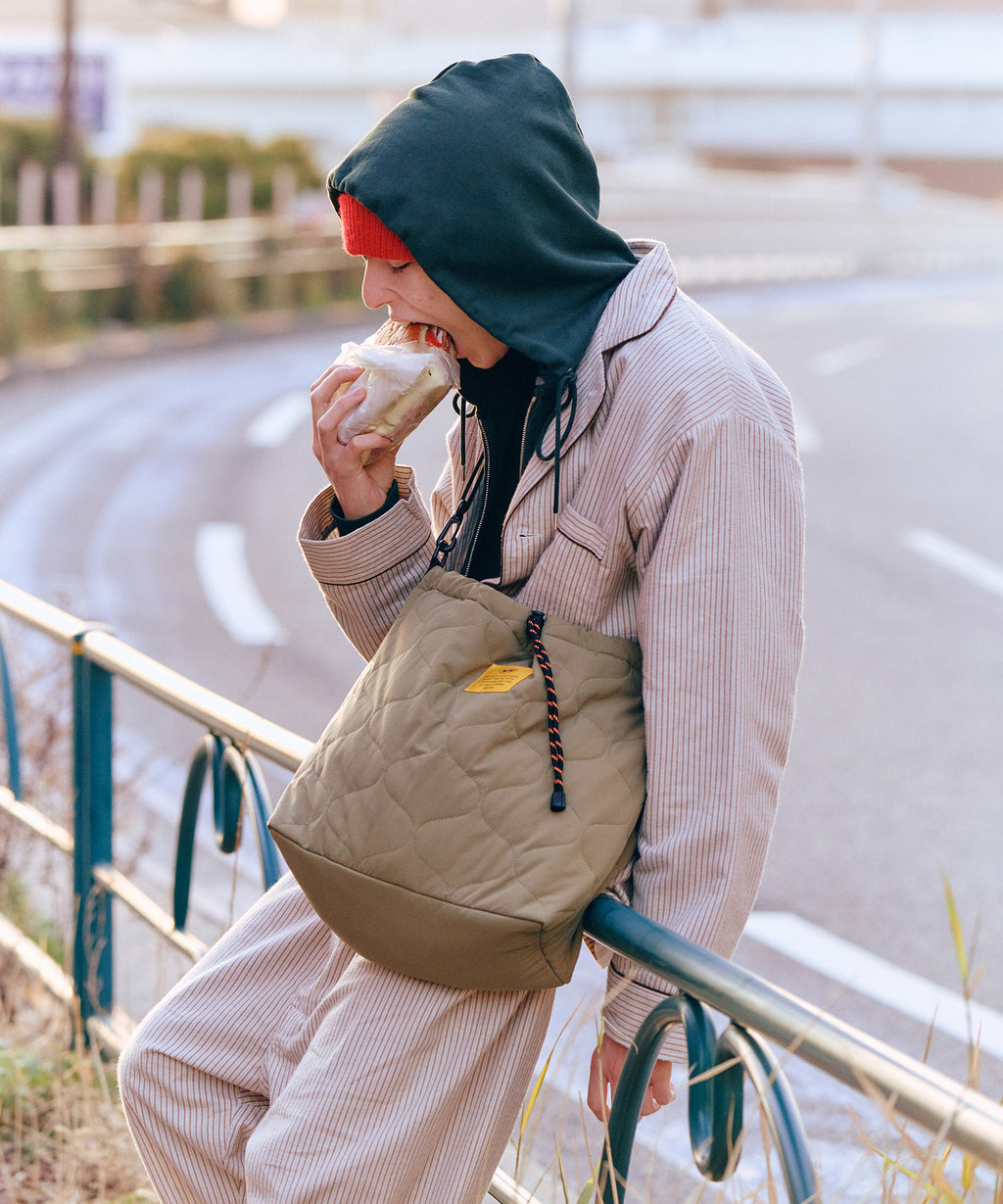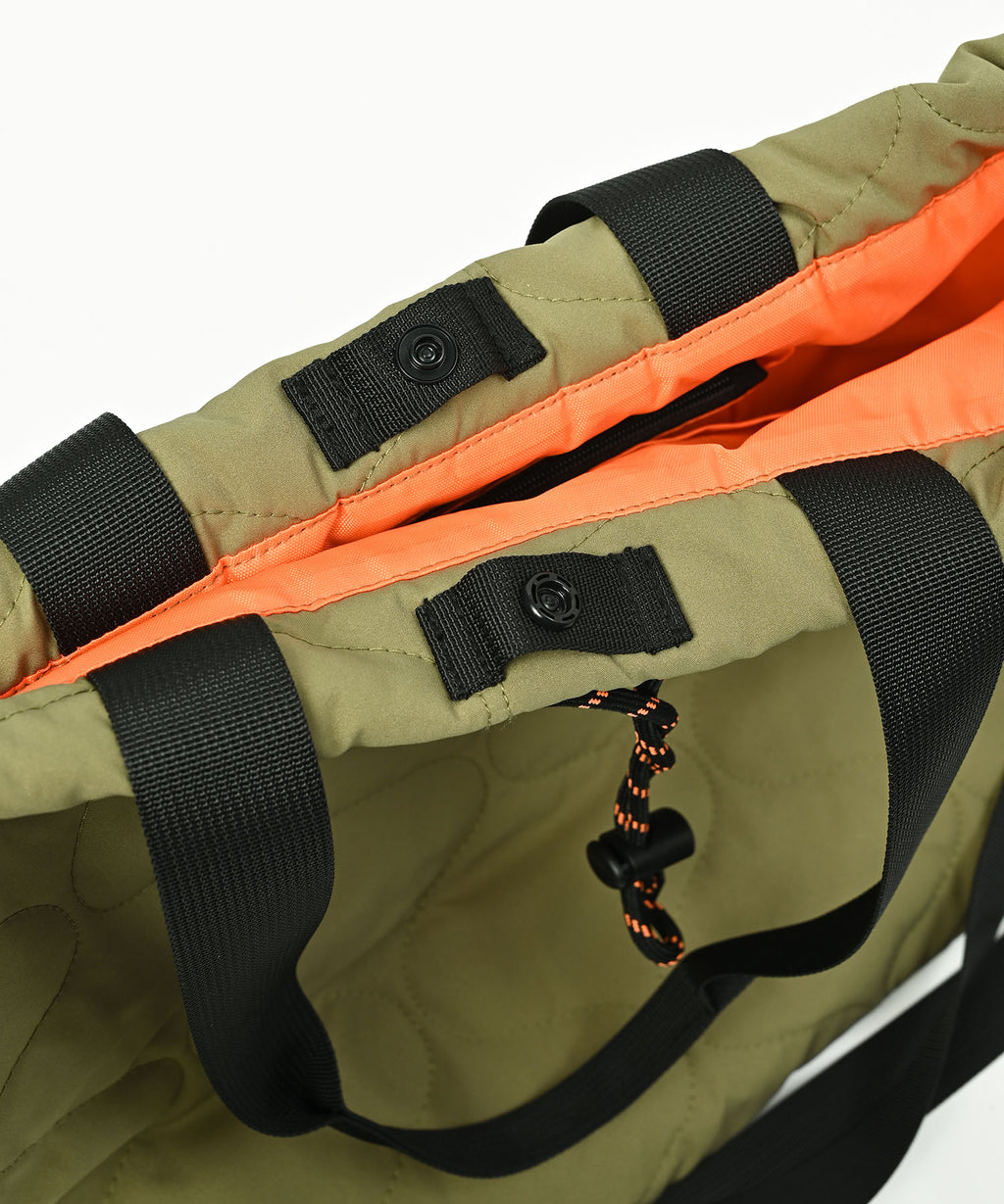 使用防潑水加工的高機能絎縫布料,可肩背或手提的兩用設計,提把長度設計恰到好處,肩背也非常舒適,內部附有 2 個拉鍊口袋,收納分類更方便,開口處有抽繩設計,可自由調整成 束口造型,隨心變換包型,讓日常造型更具玩味。配色選用沉穩大地色系,自然融入秋冬穿搭,內裡則是鮮豔的橘色,呼應工裝元素,不僅時尚有型,還能讓內容物更容易看清、取用更便利。