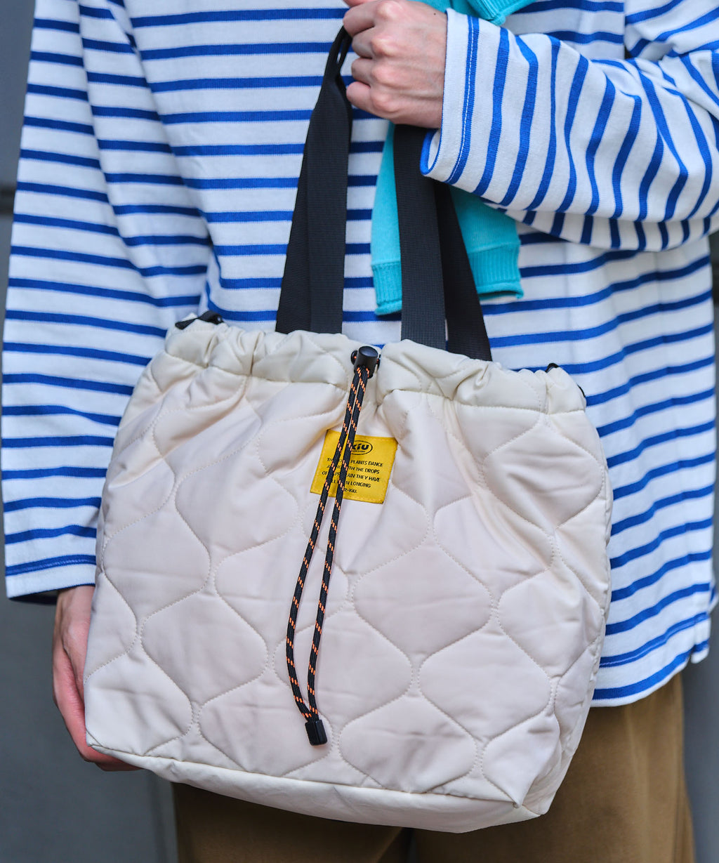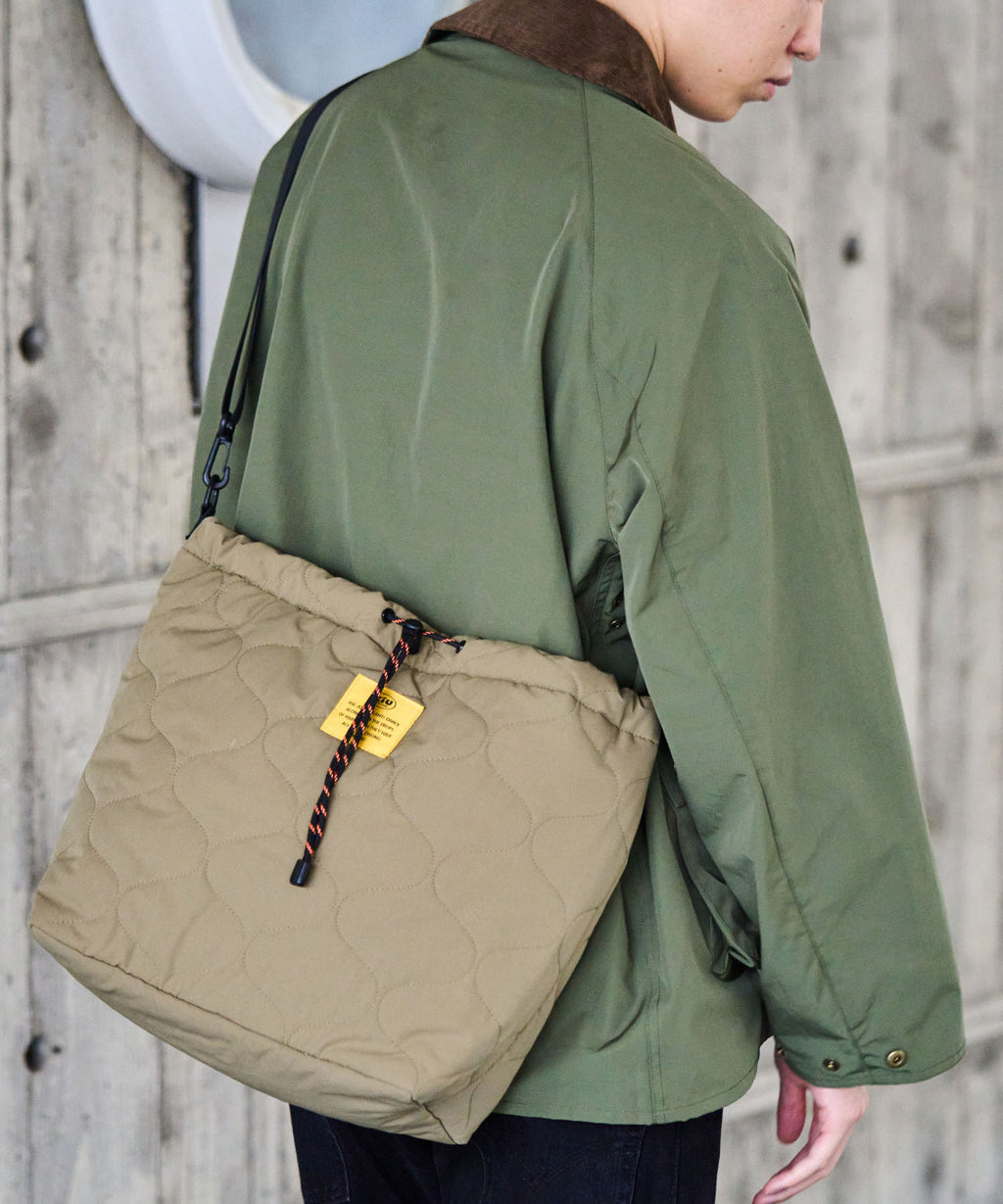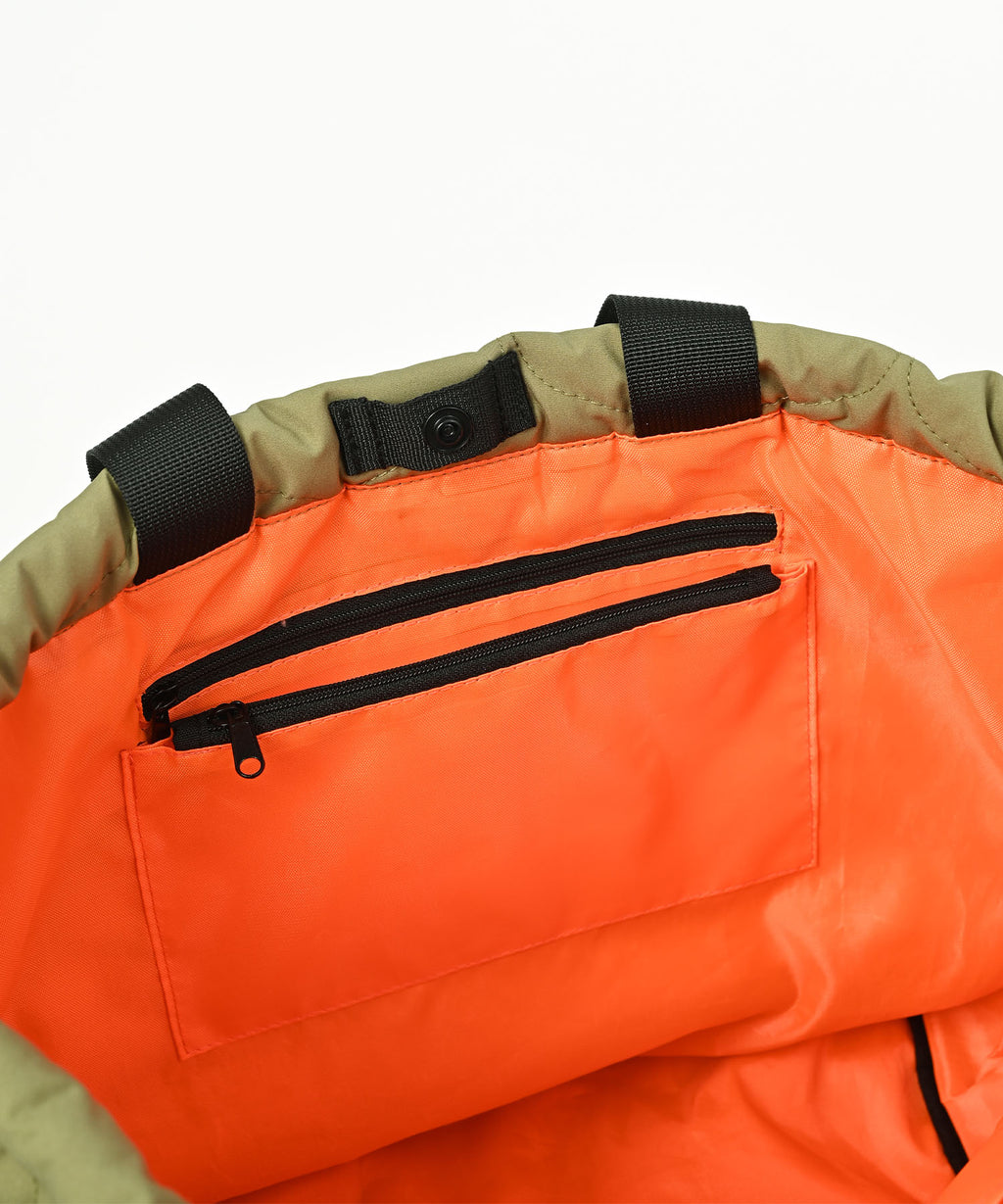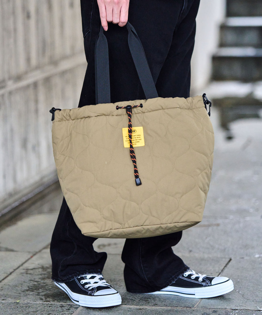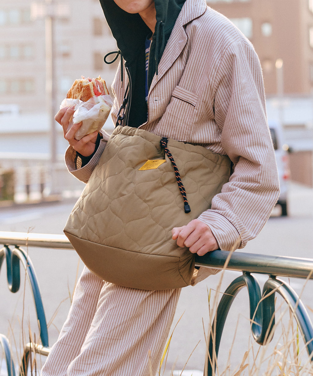 使用防潑水加工的高機能絎縫布料,可肩背或手提的兩用設計,提把長度設計恰到好處,肩背也非常舒適,內部附有 2 個拉鍊口袋,收納分類更方便,開口處有抽繩設計,可自由調整成 束口造型,隨心變換包型,讓日常造型更具玩味。配色選用沉穩大地色系,自然融入秋冬穿搭,內裡則是鮮豔的橘色,呼應工裝元素,不僅時尚有型,還能讓內容物更容易看清、取用更便利。