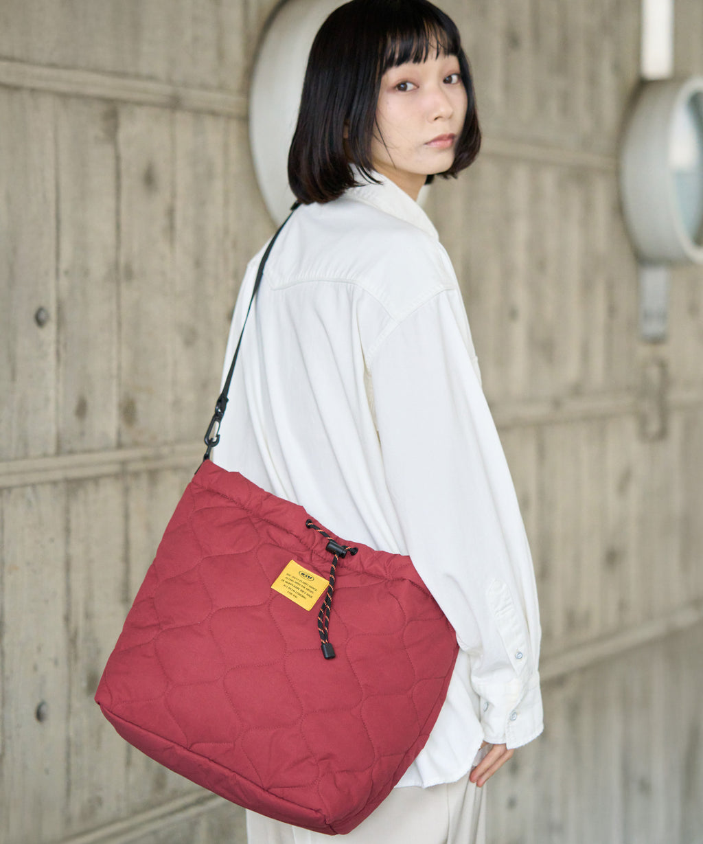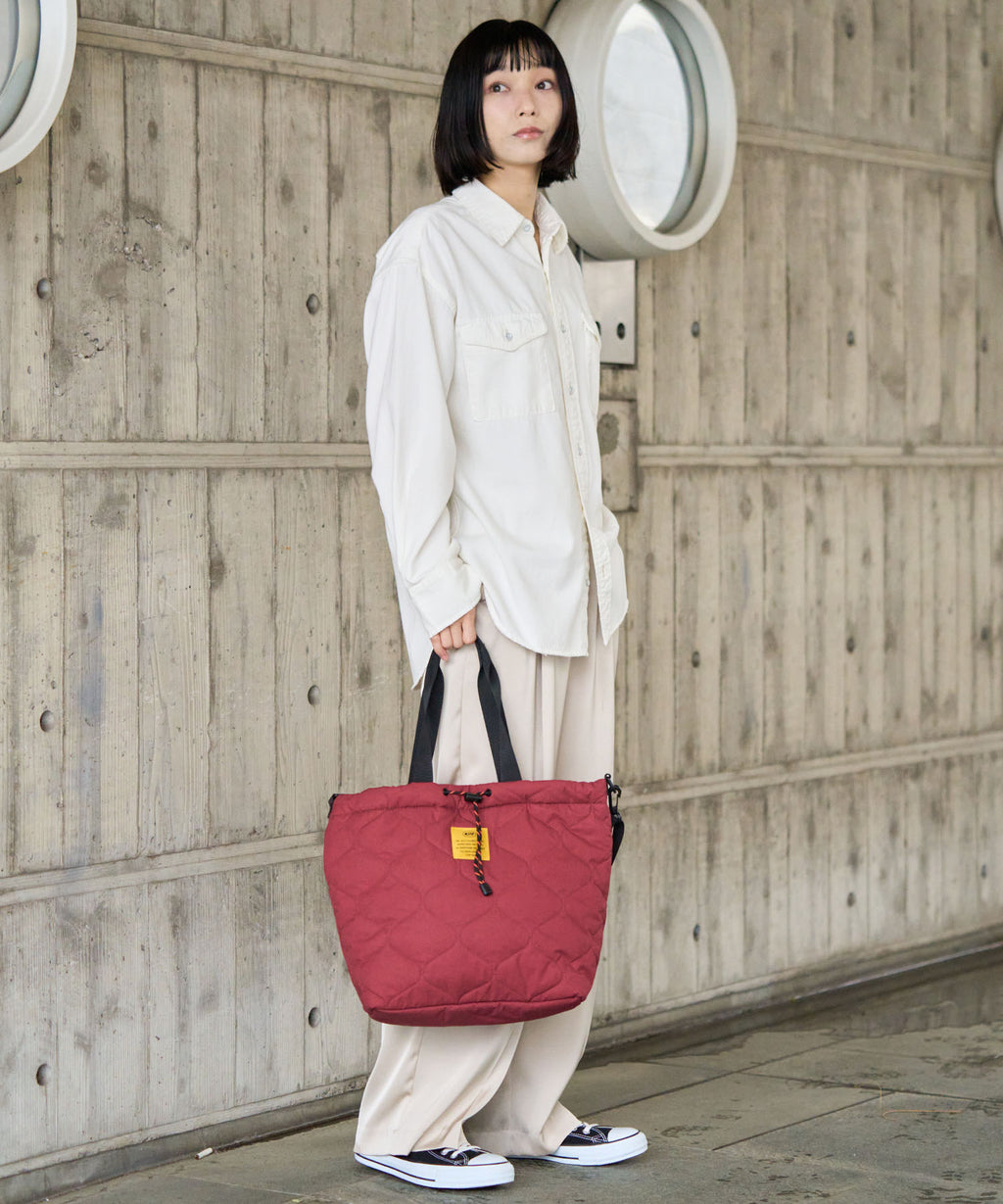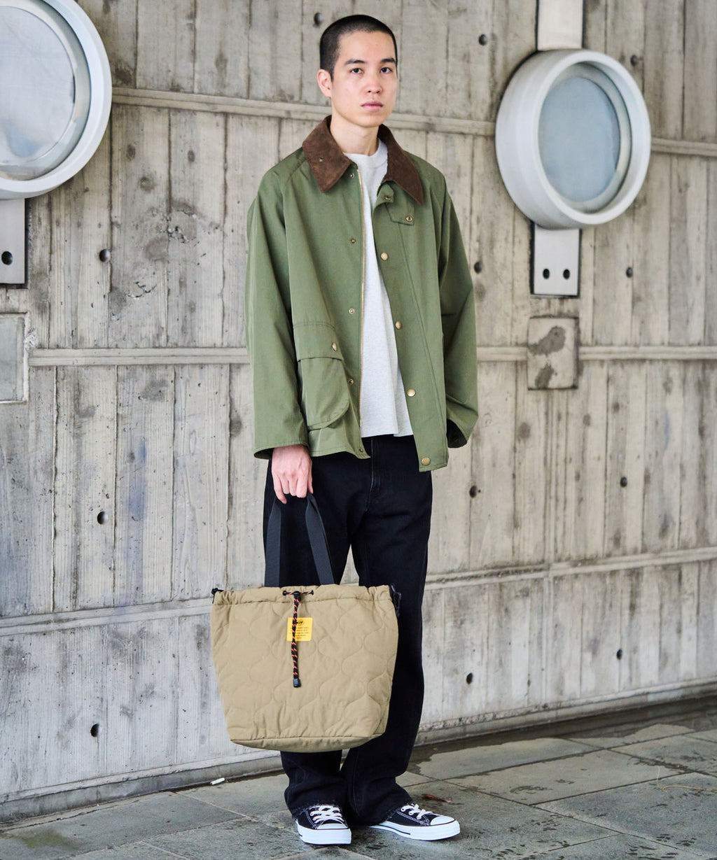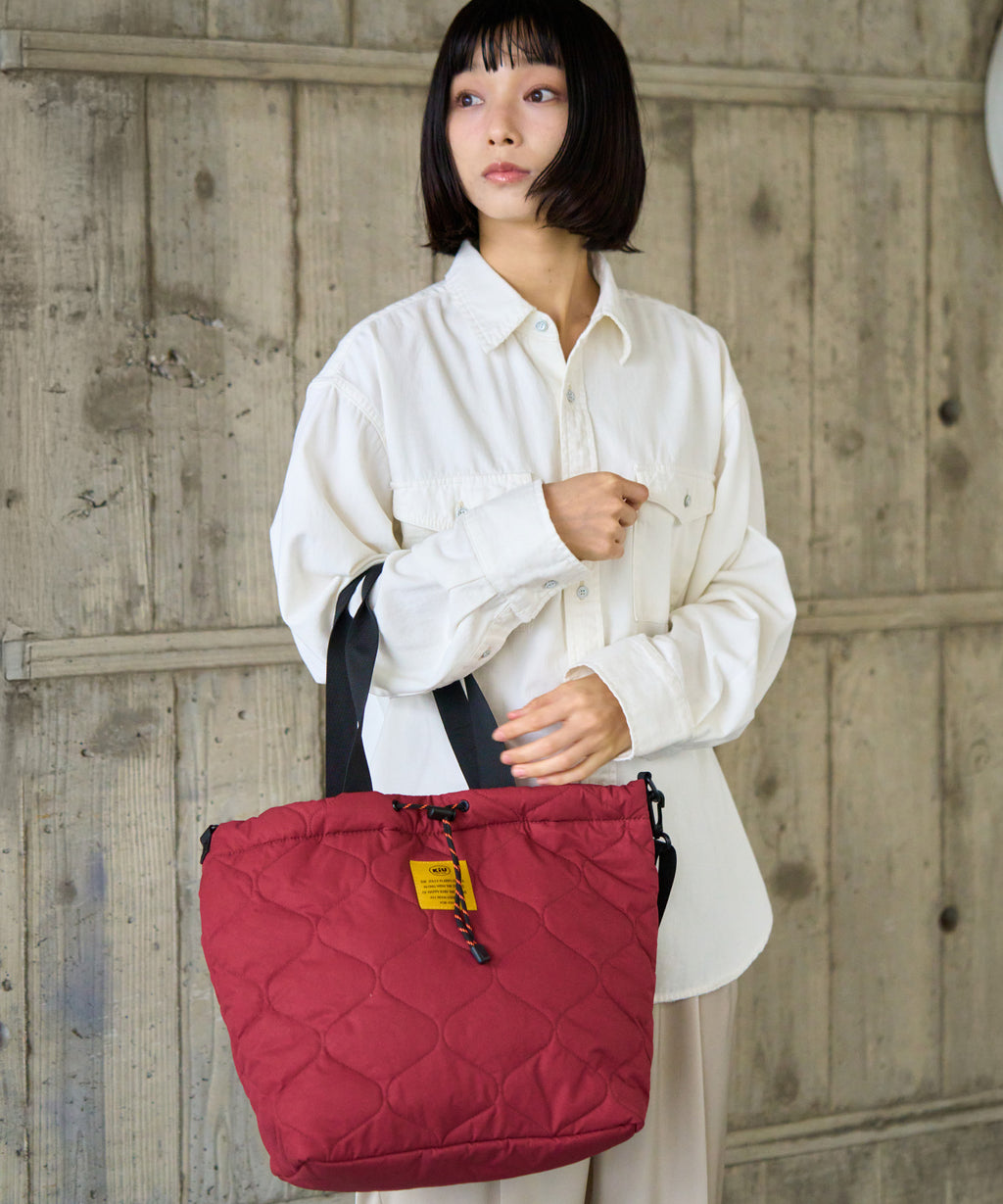 使用防潑水加工的高機能絎縫布料,可肩背或手提的兩用設計,提把長度設計恰到好處,肩背也非常舒適,內部附有 2 個拉鍊口袋,收納分類更方便,開口處有抽繩設計,可自由調整成 束口造型,隨心變換包型,讓日常造型更具玩味。配色選用沉穩大地色系,自然融入秋冬穿搭,內裡則是鮮豔的橘色,呼應工裝元素,不僅時尚有型,還能讓內容物更容易看清、取用更便利。