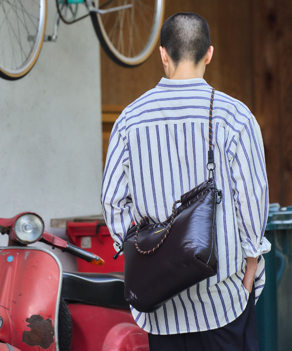 以全新的布料將經典的 PUFFY 系列全面升級,推出的兩用包款。包身擁有如羽絨外套般蓬鬆柔軟的觸感與細緻光澤的材質感,可作為托特包或束口袋包使用,內層填充柔軟又富有彈性的棉質墊層,觸感輕盈舒適,表面經防潑水加工,小雨也能安心使用。雖然是大容量設計,但重量僅約 260g,輕巧又方便攜帶,無論是短暫外出還是購物都能完美應對。設計風格簡約,可融入各種穿搭風個,為造型增添低調個性。