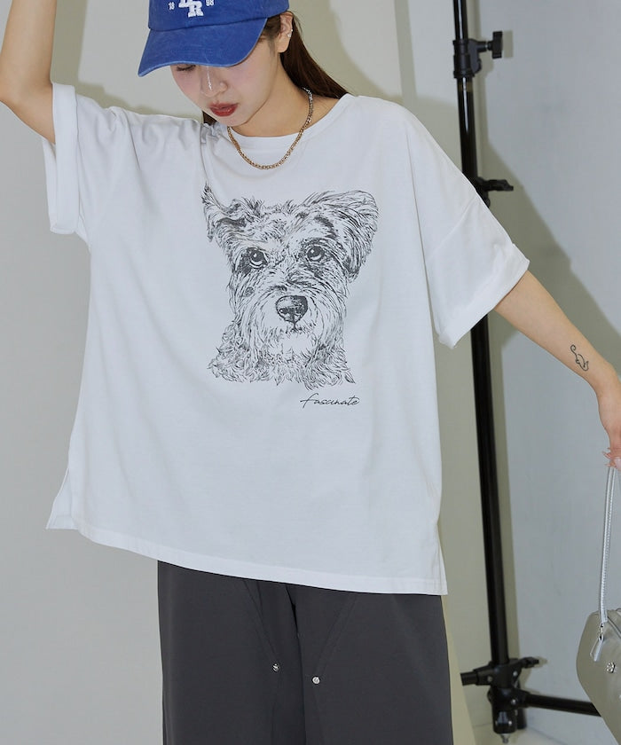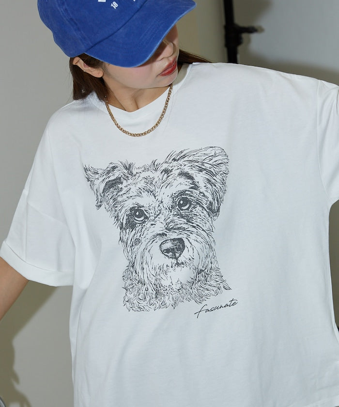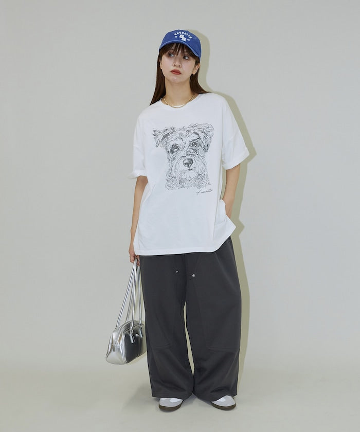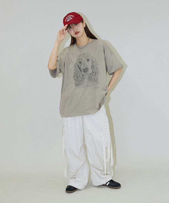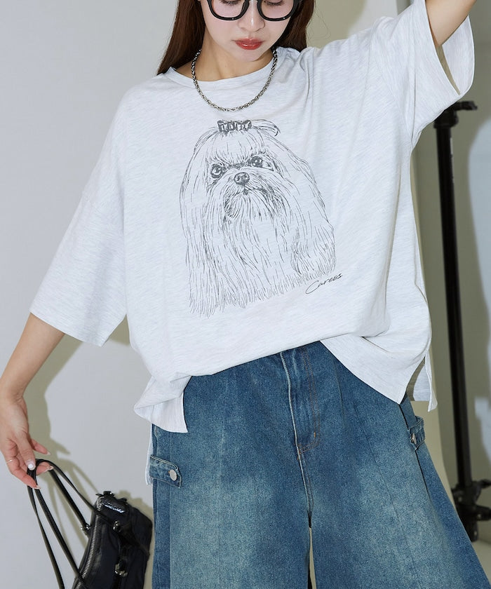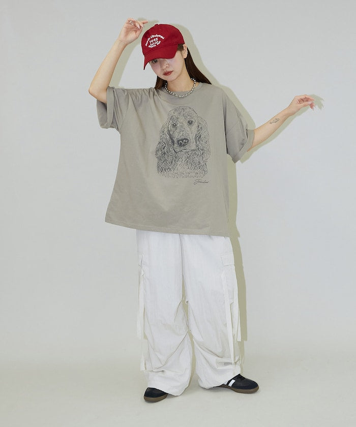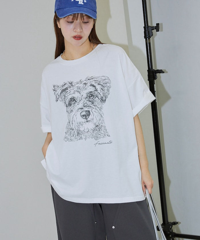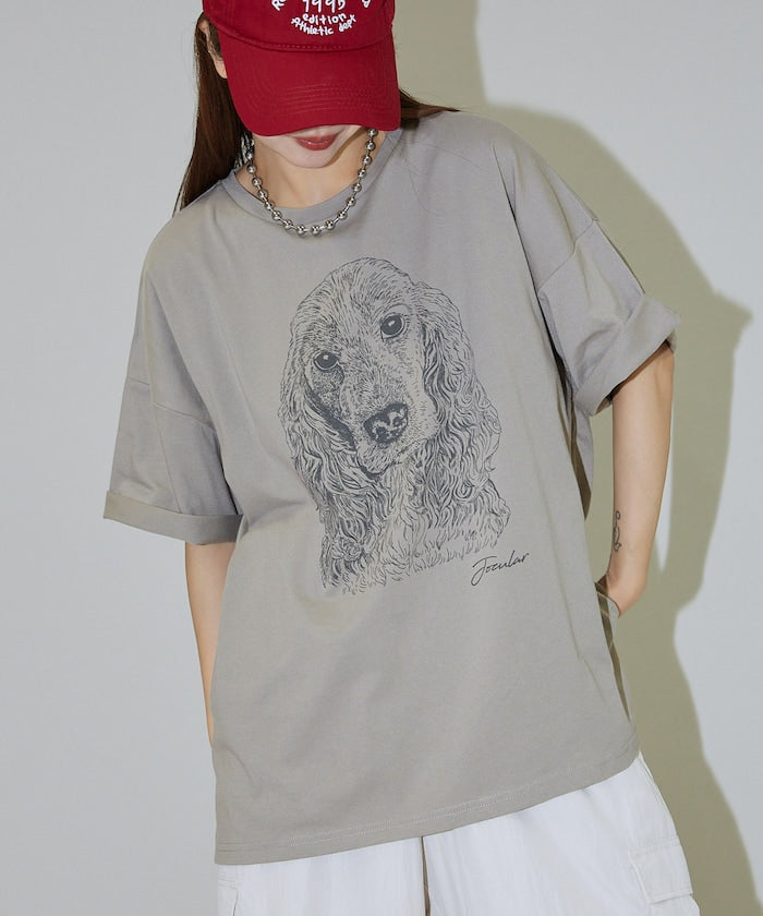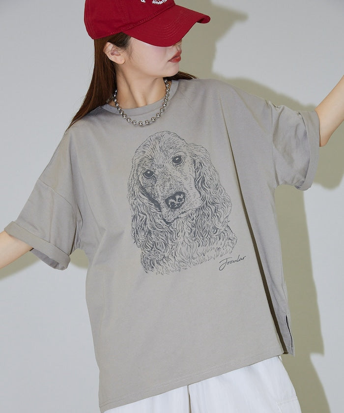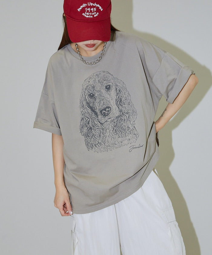 擁有強烈存在感的可愛動物圖案寬版T恤,胸前印有寫實風格的狗狗插畫,視覺效果搶眼,使用纖細線條描繪的插畫,帶有復古舊衣般的氛圍,遮住臀部的寬鬆版型,穿著舒適、休閒感十足,單穿也非常有型。