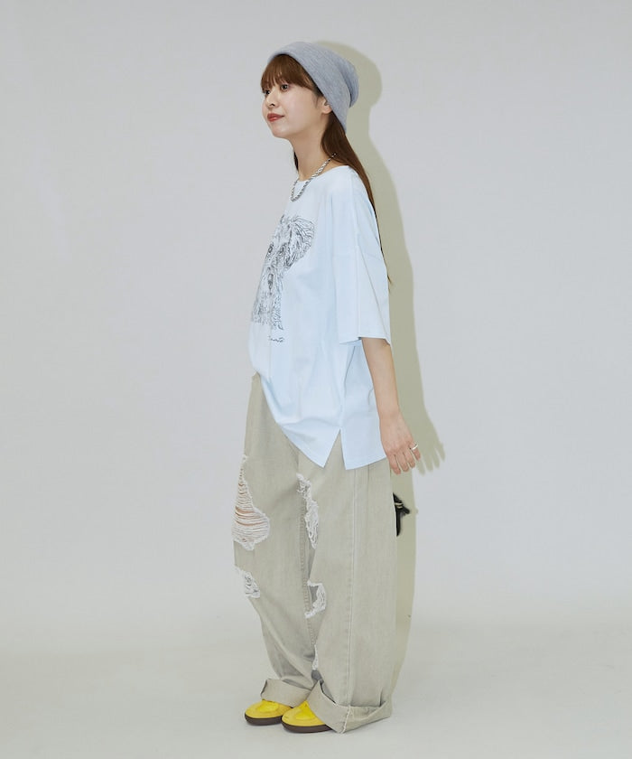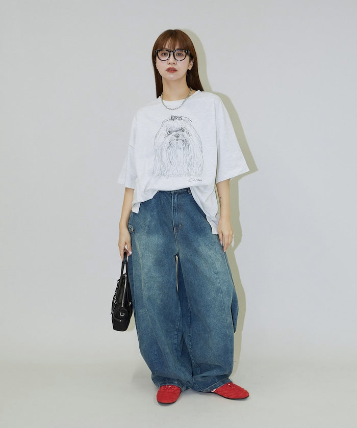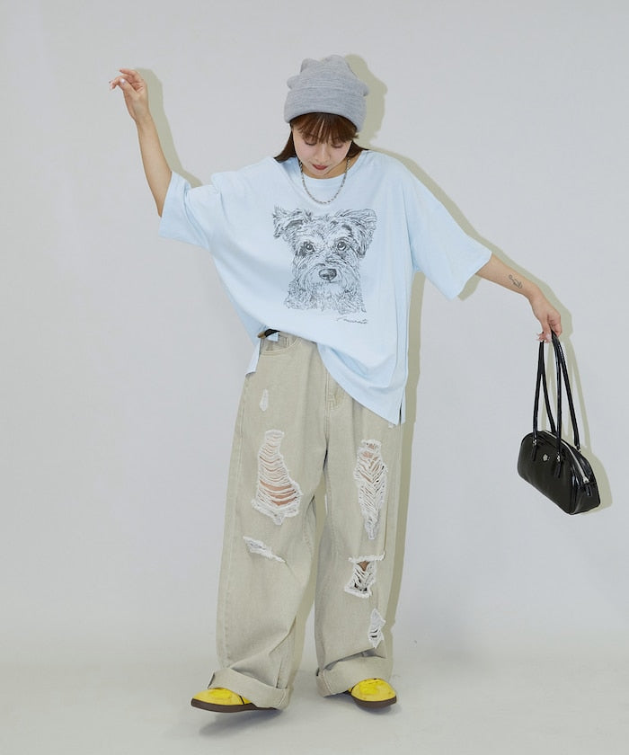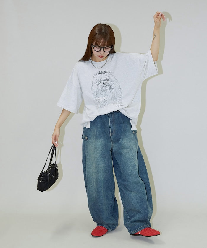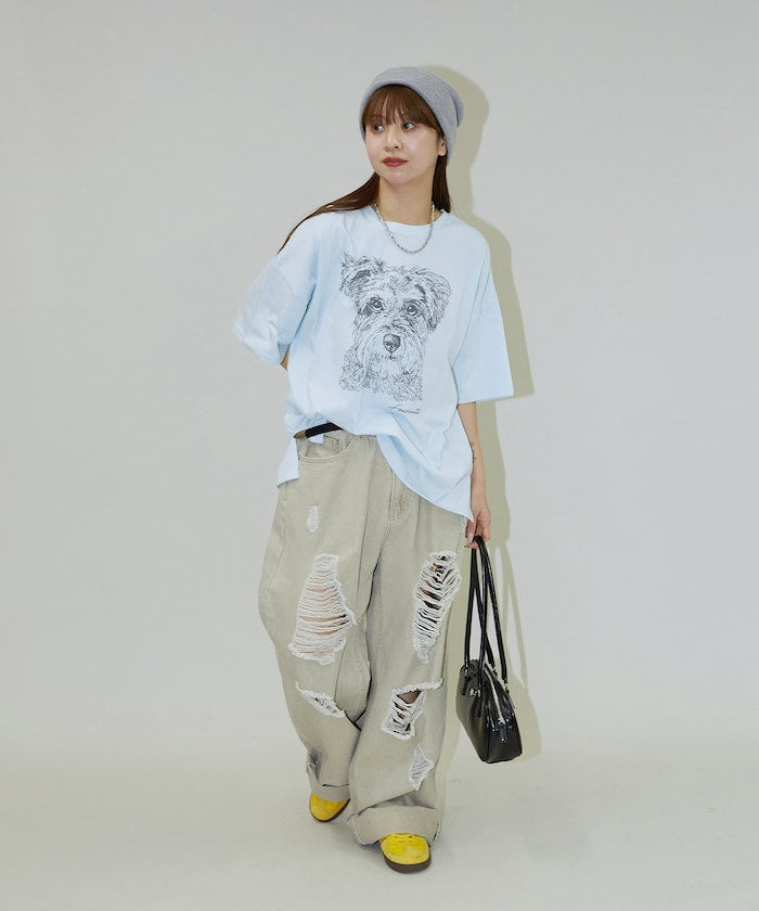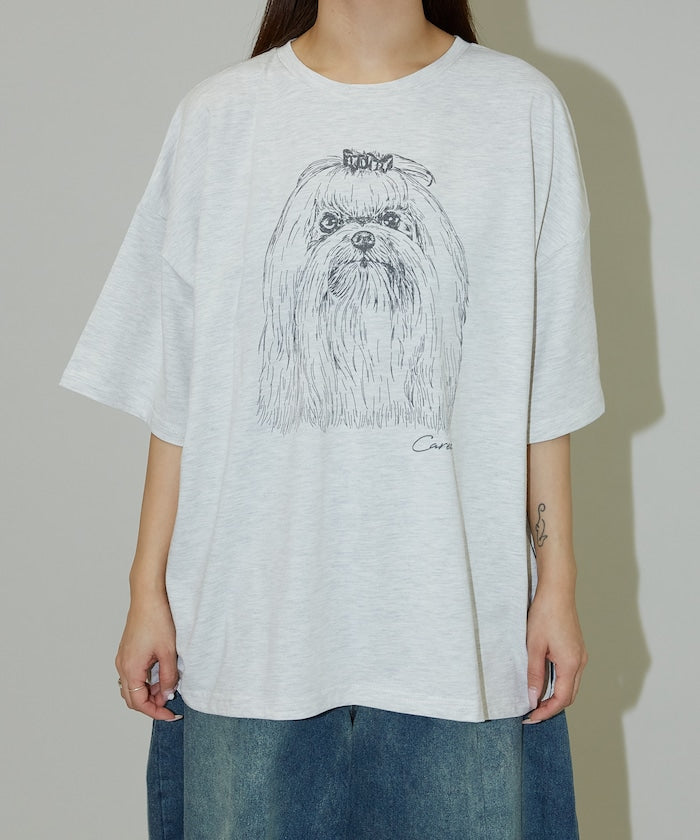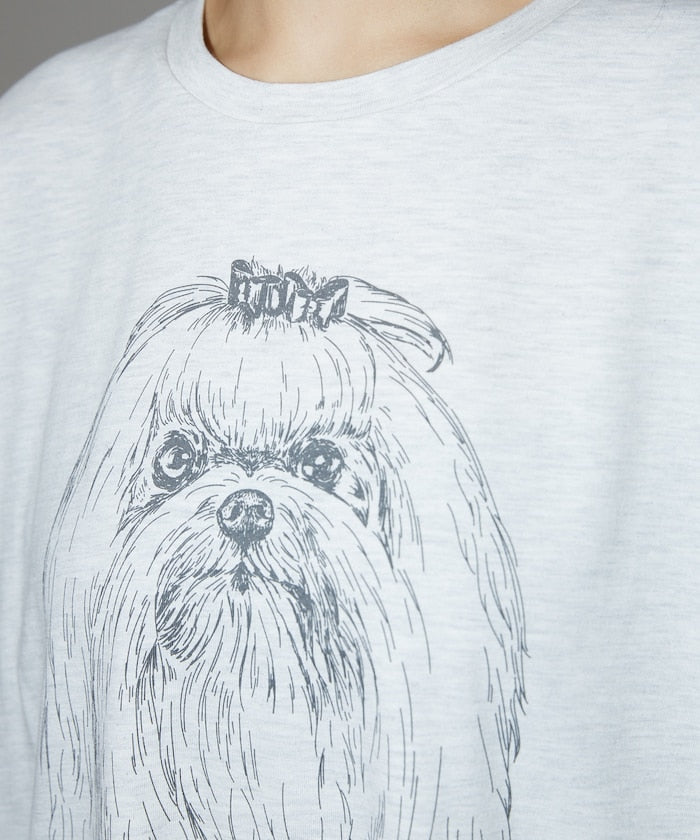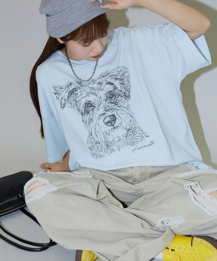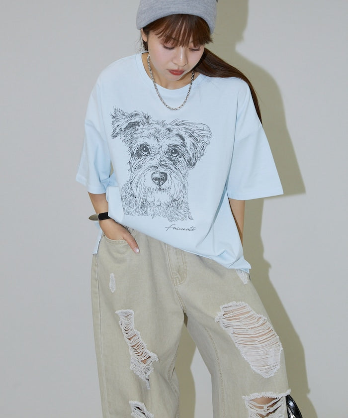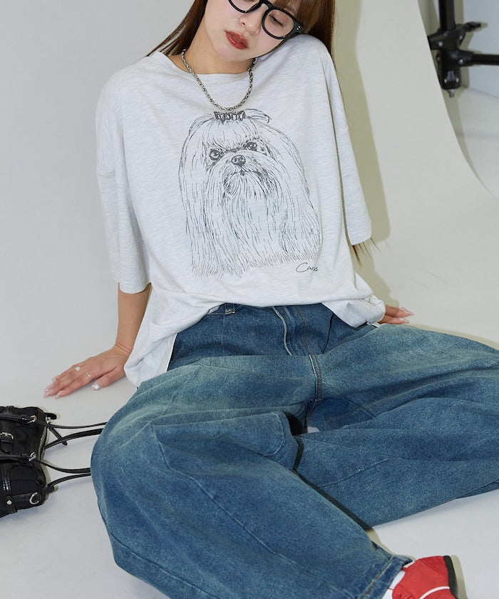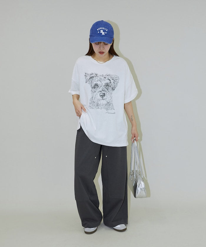 擁有強烈存在感的可愛動物圖案寬版T恤,胸前印有寫實風格的狗狗插畫,視覺效果搶眼,使用纖細線條描繪的插畫,帶有復古舊衣般的氛圍,遮住臀部的寬鬆版型,穿著舒適、休閒感十足,單穿也非常有型。