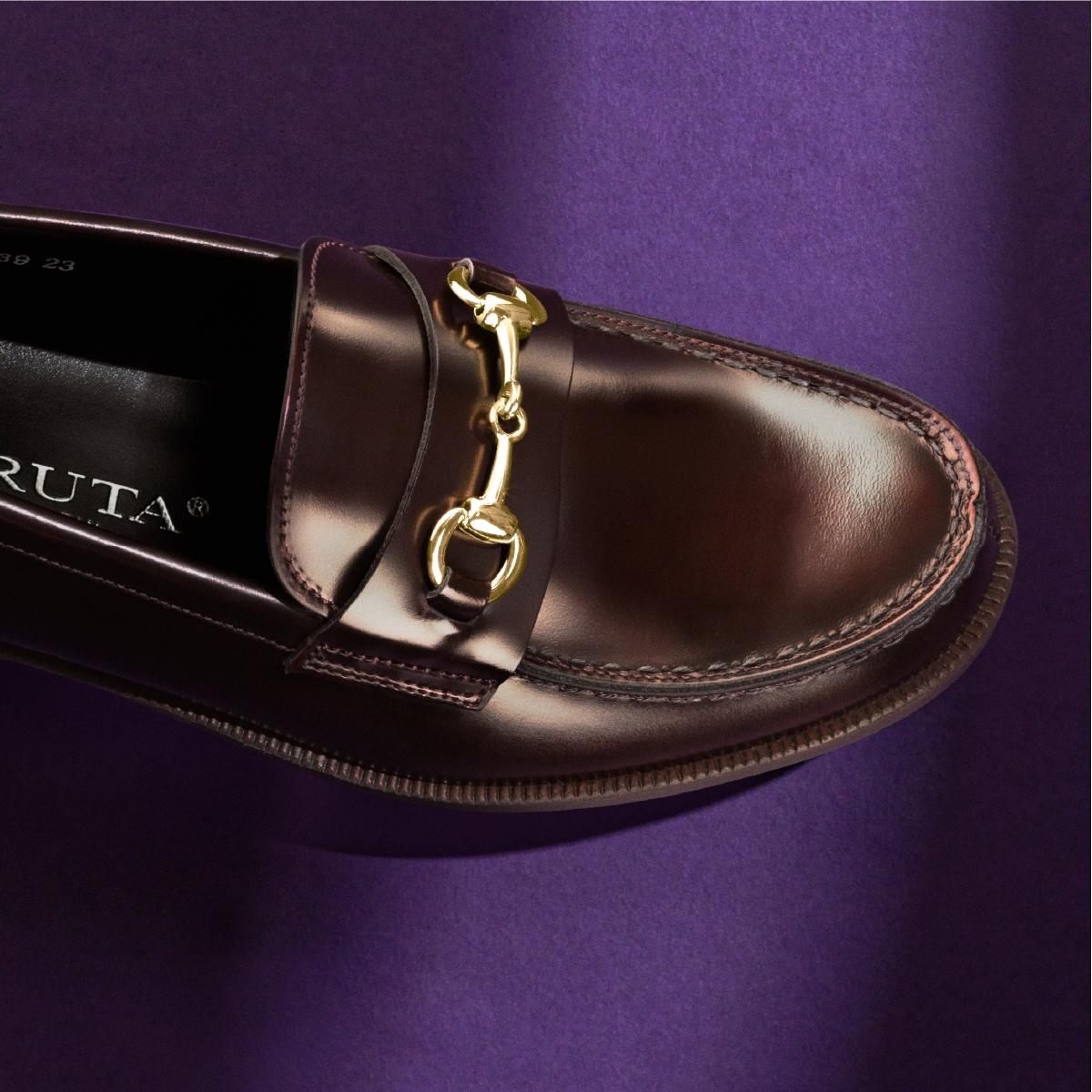 鞋面採用經塗層處理的亮面玻璃皮革,呈現出獨特的光澤感,搭配棕色鞋底成為低調卻精緻的點綴,從鞋面到鞋尖呈現俐落的線條,搭配色調柔和的淺金色飾扣裝飾,無論是牛仔褲造型或正式西裝風格,都能輕鬆駕馭。