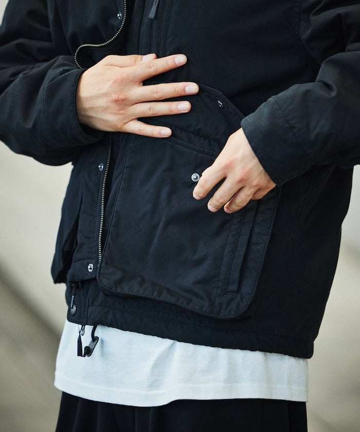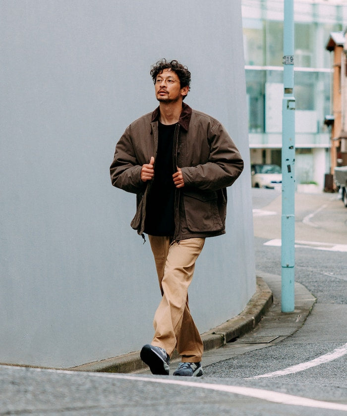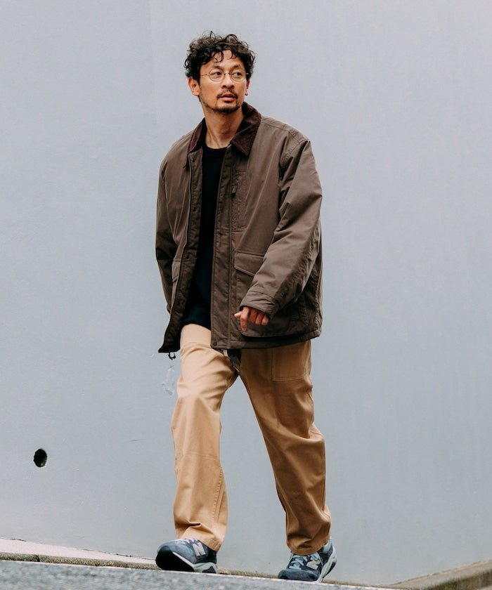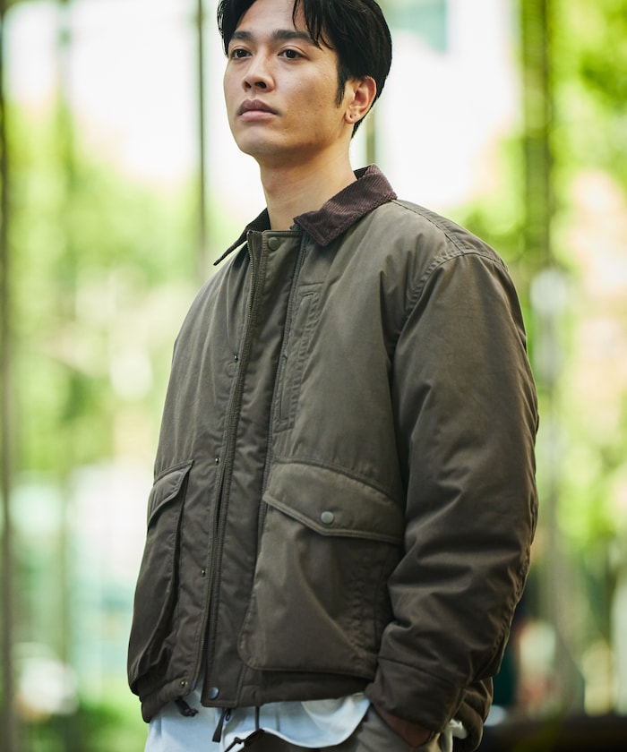 此款商品為標準的短版束腰外套,以釣魚夾克的版型設計為基礎,外層經紗棉與緯紗尼龍的交織面料,並經過防潑水處理,多口袋設計、出門不帶包包也可以。