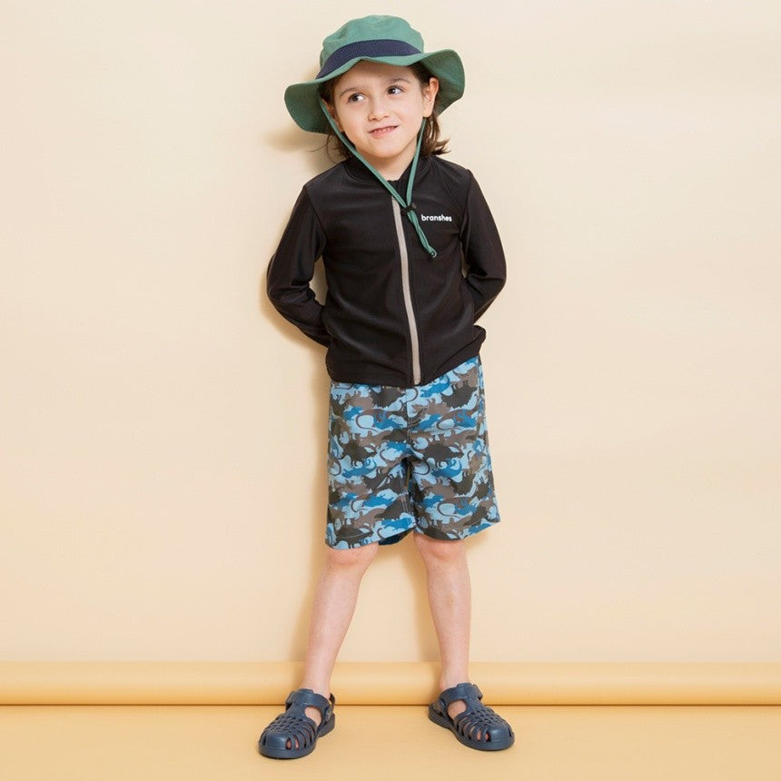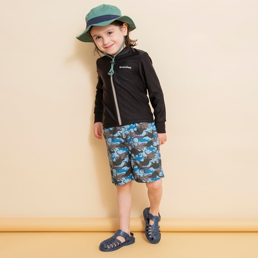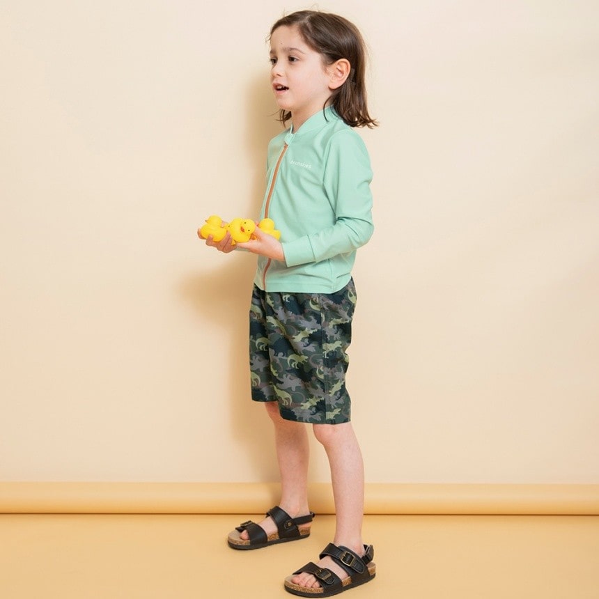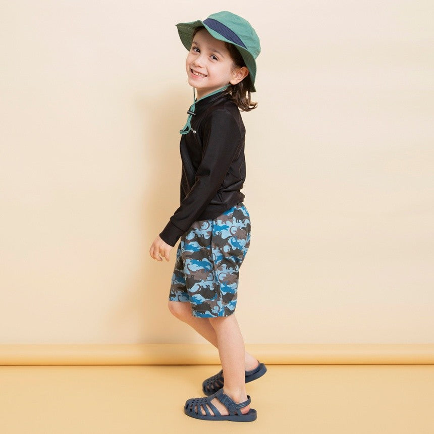 採用了酷炫的恐龍迷彩風印花設計,外型帥氣十足,是一款非常適合玩水的 UV 防曬機能商品,內側附有細緻布料製成的內裡,親膚舒適、穿著感佳,臀部口袋設有排水孔,設計貼心實用。