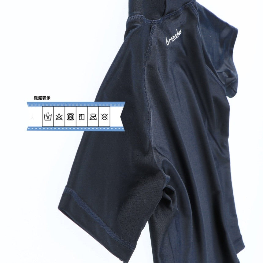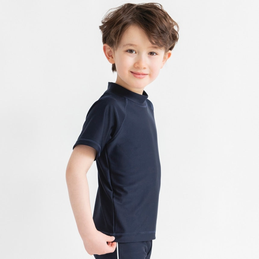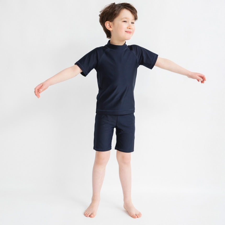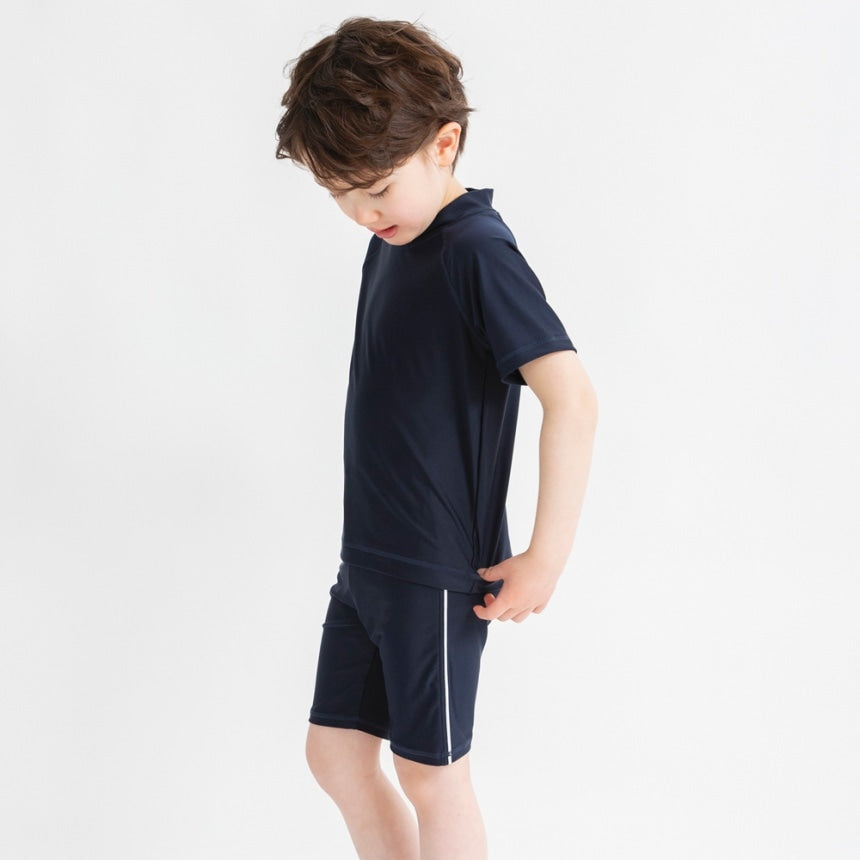 採用防紫外線材質,具有UV防曬功能,對抗紫外線傷害,有效阻擋日曬,是海邊、泳池等水域活動的理想選擇,採用高彈力布料方便活動,穿脫順暢,特別適合孩子進行水上活動。經典的素面海軍藍色設計,不論男孩或女孩都適合穿著。