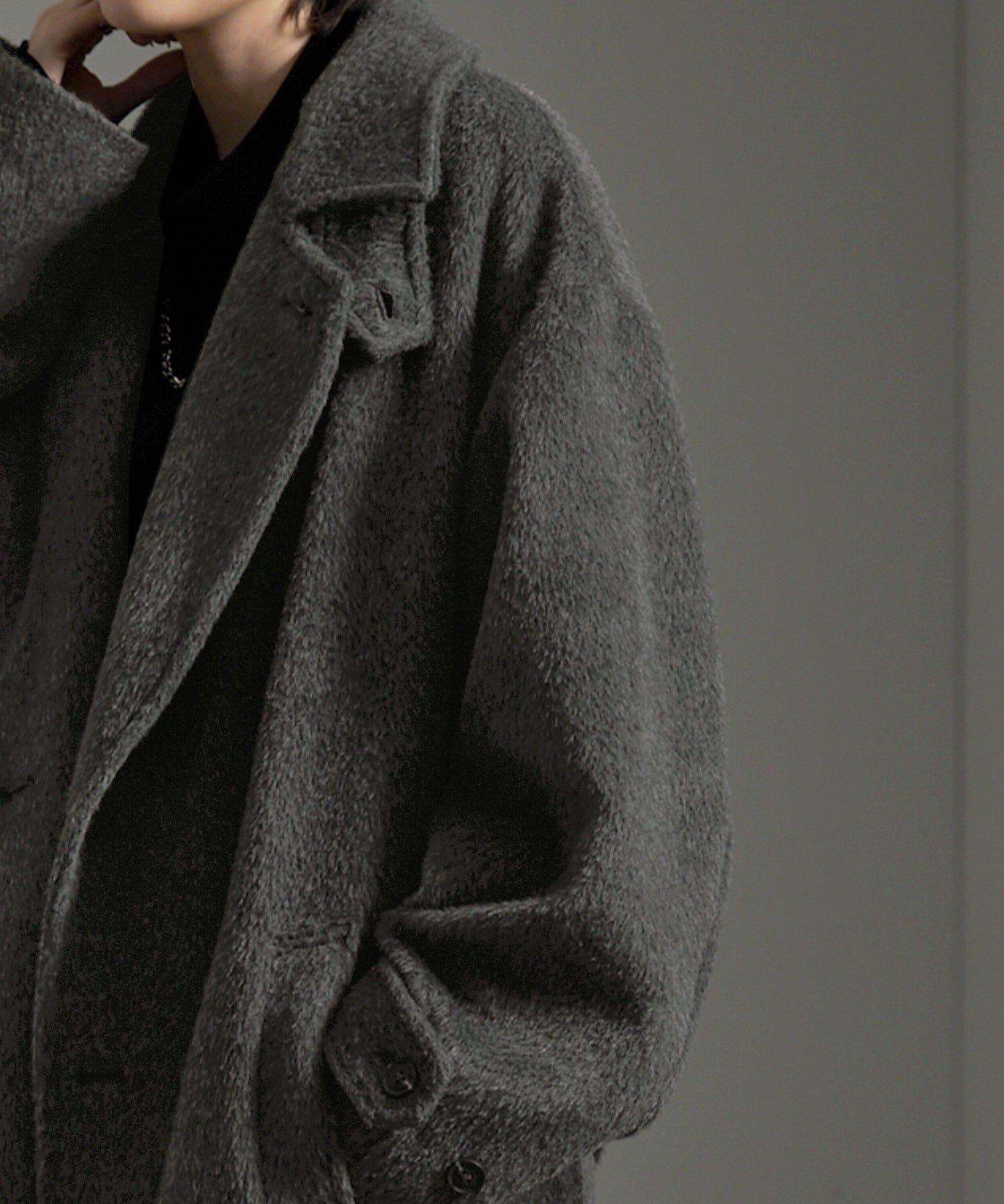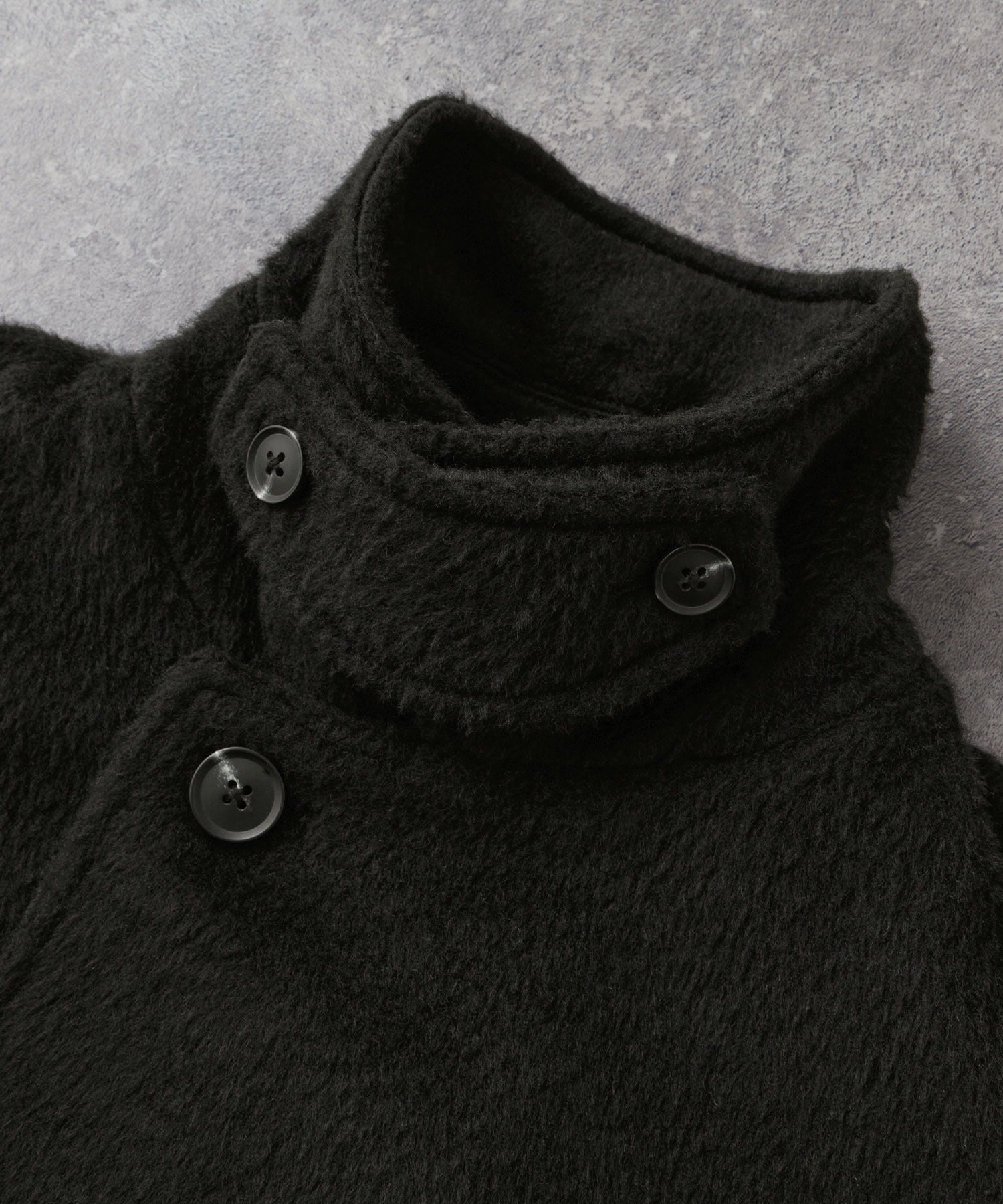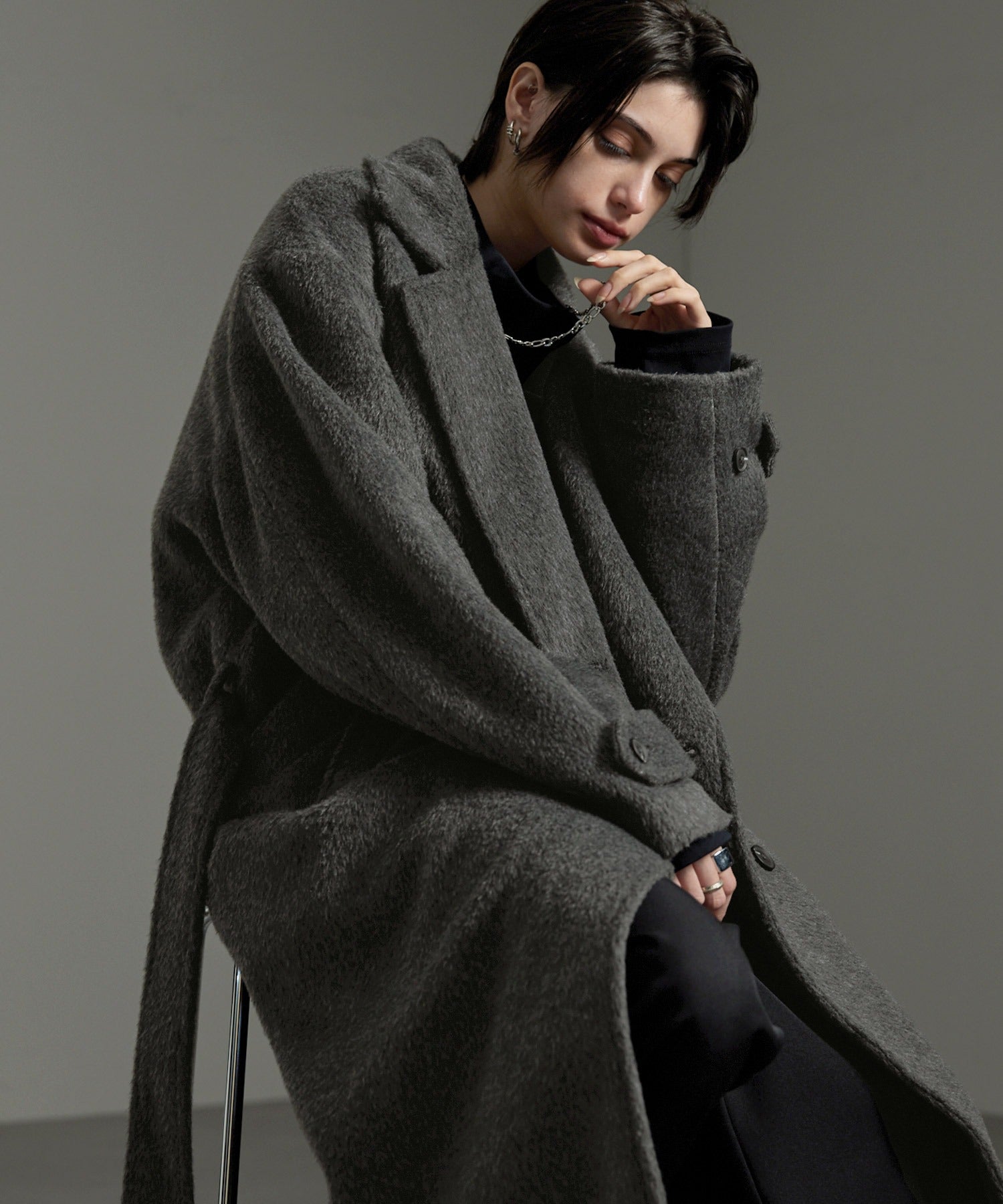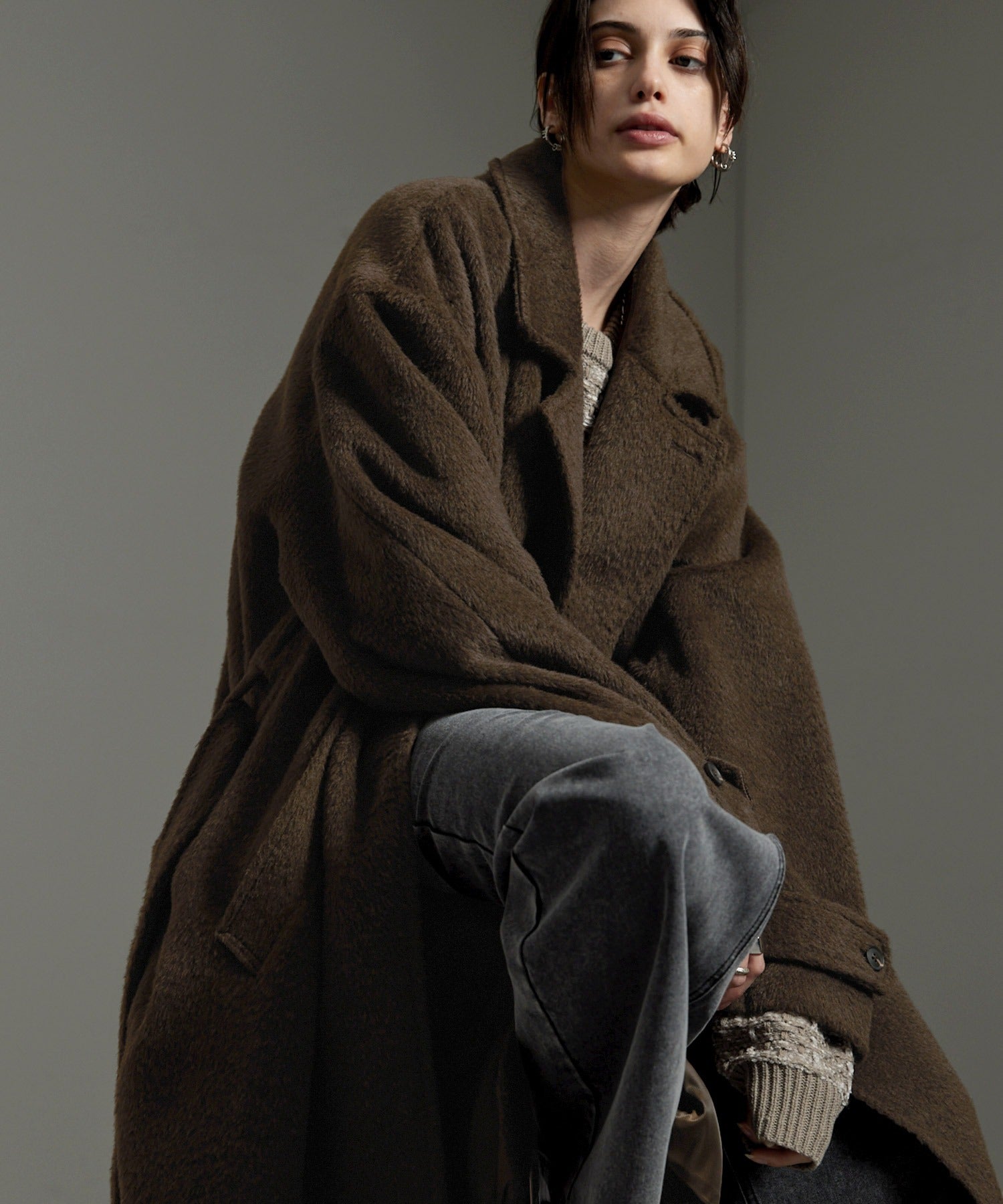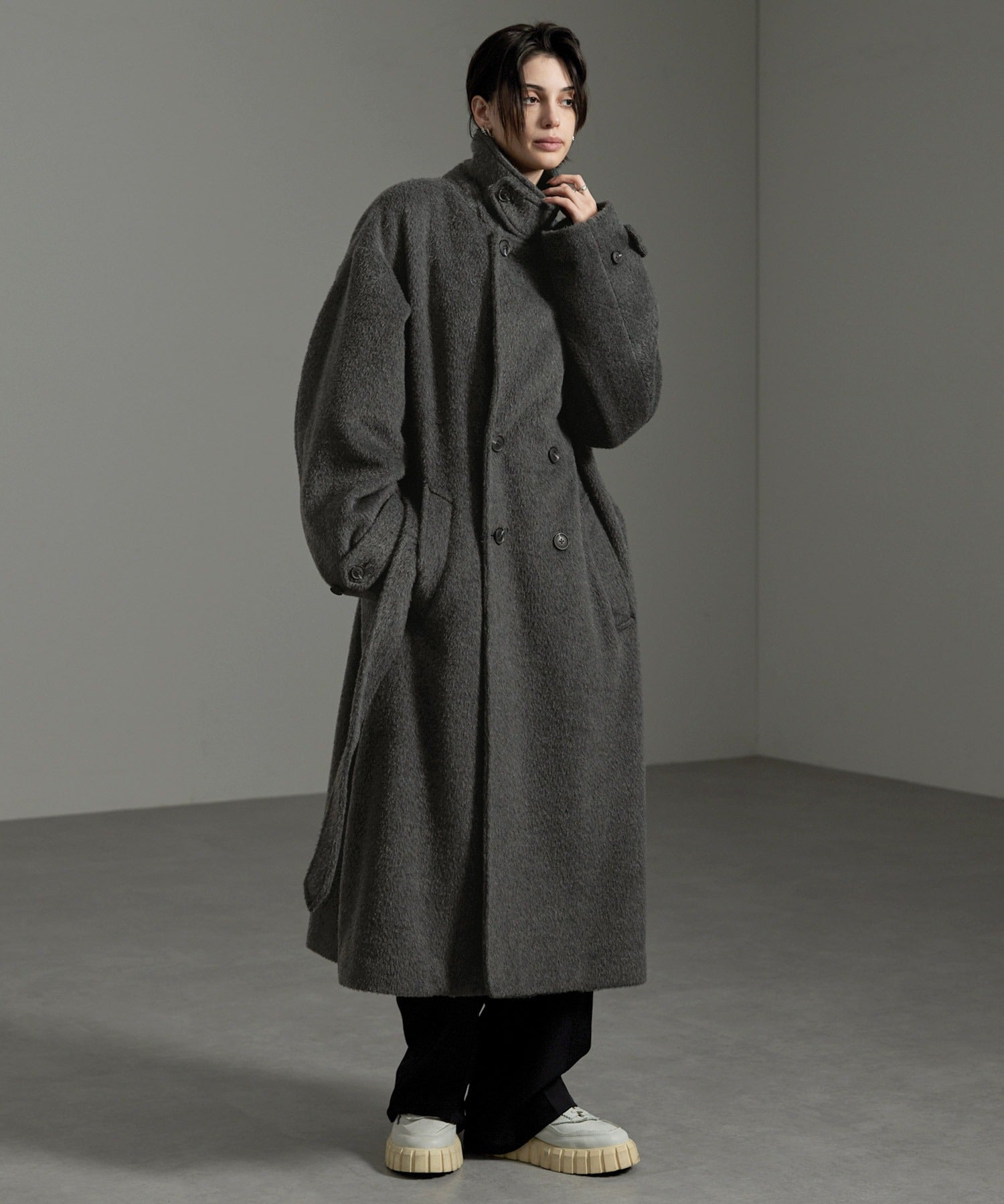 選用具備獨特起毛感的長毛呢面料,兼具羊毛般的挺度與層次豐富的色彩,營造出高級感及細膩質感,布料滑順親膚,提供舒適的穿著體驗,內襯設計提升保暖效果。雙排釦設計,呈現經典復古風格,領口也可調整為立領穿法變換造型,腰部設有可拆卸式腰帶,可依喜好調整造型,展現不同風格。寬鬆版型設計,袖口擁有充足空間,適合多層次穿搭。