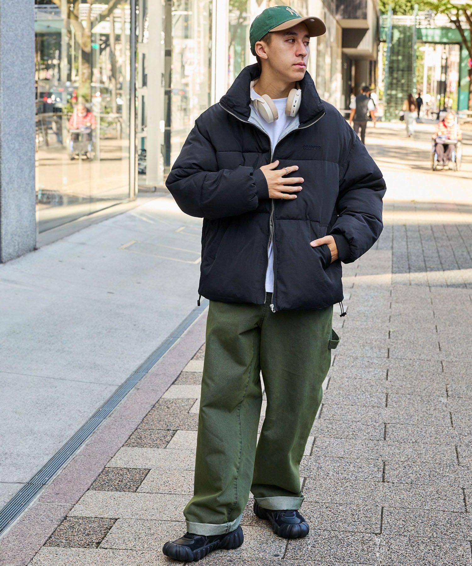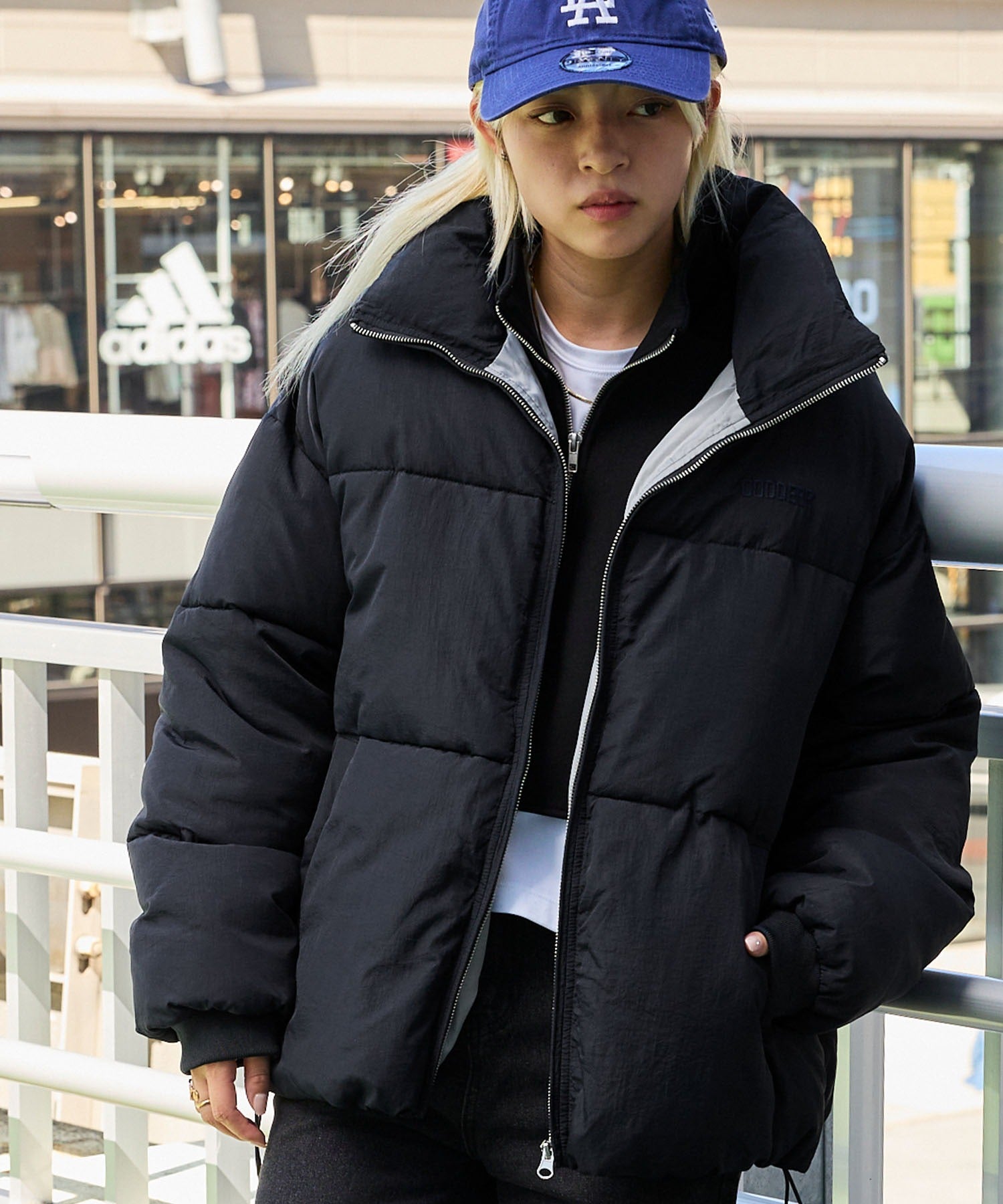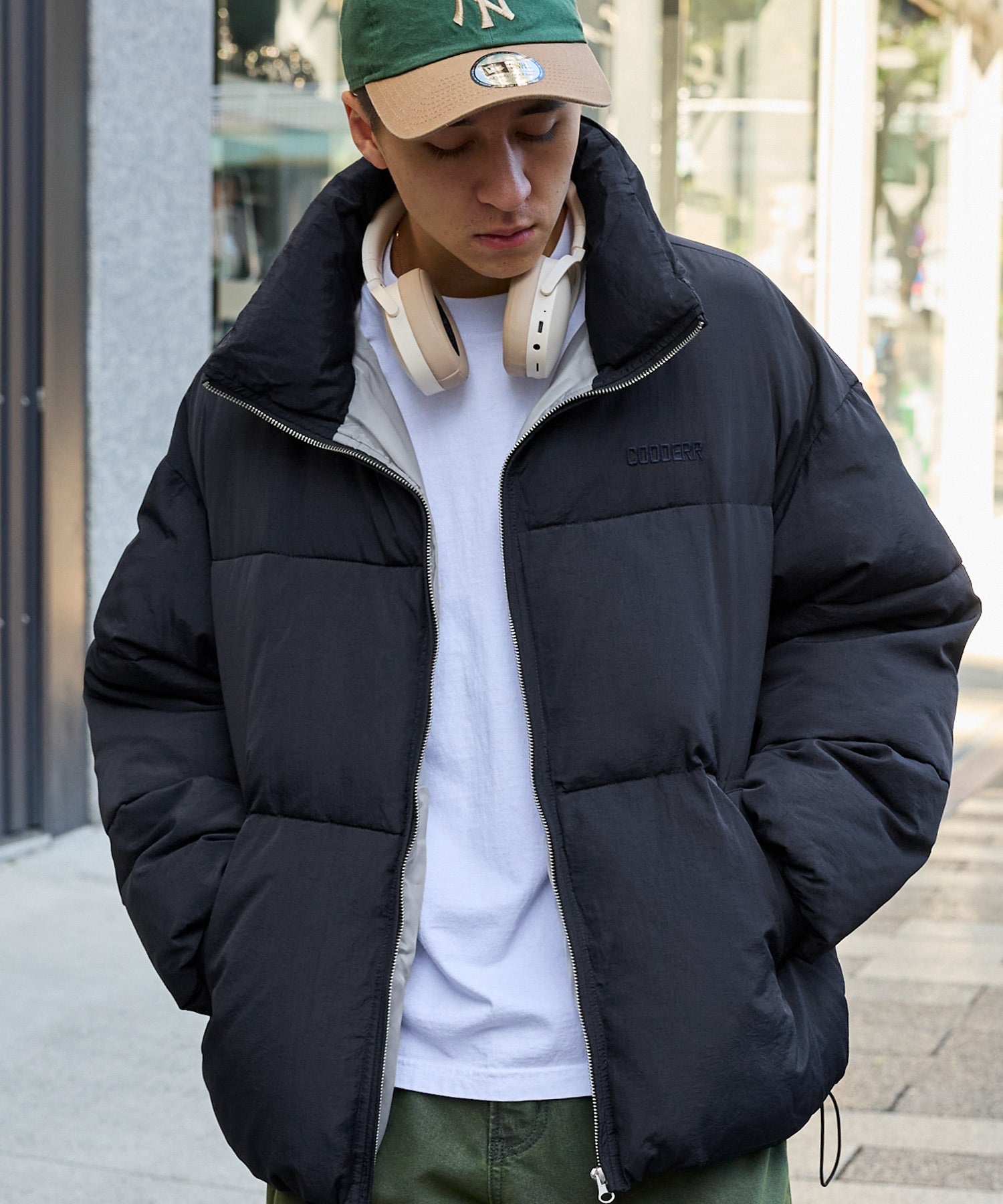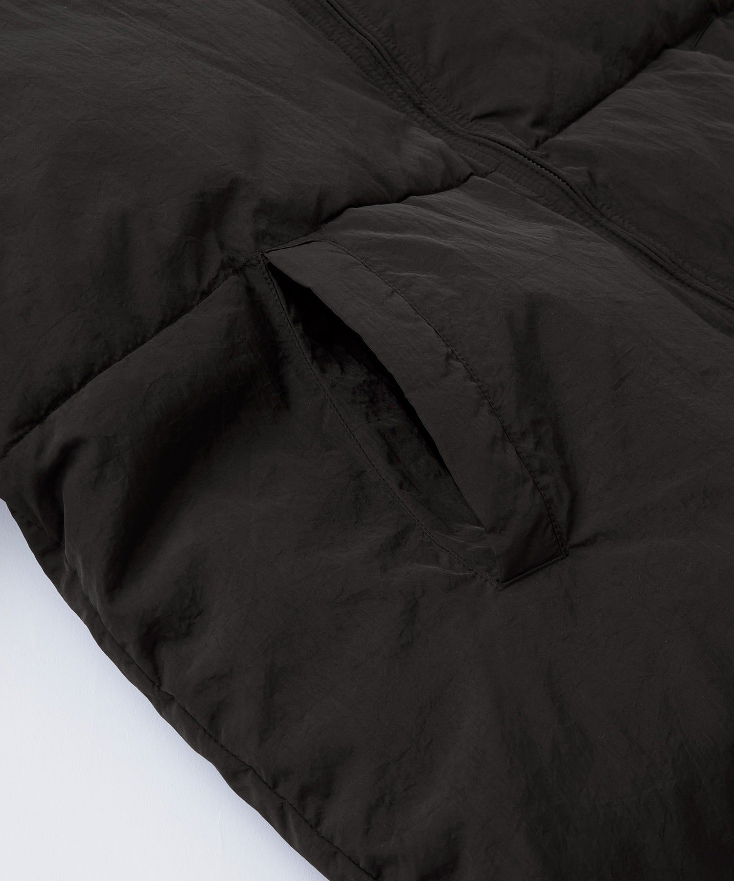 外層面料選用耐摩擦且具適度彈性的尼龍材質,高密度織造使其呈現沉穩的霧面質感,同時經過防潑水處理,可有效抵擋雨水與輕微污漬,讓清潔變得更加簡單,領口採用高領設計,內部填充如羽絨般溫暖且輕盈的中綿,保暖性極佳,領口柔軟舒適,提供舒適的穿著體驗與溫暖感。此外,兩側設有方便插手的口袋,衣擺則配有可調整輪廓的彈性抽繩,時尚的短版剪裁,搭配平衡感滿分,是一款男女皆可穿著的中性單品。