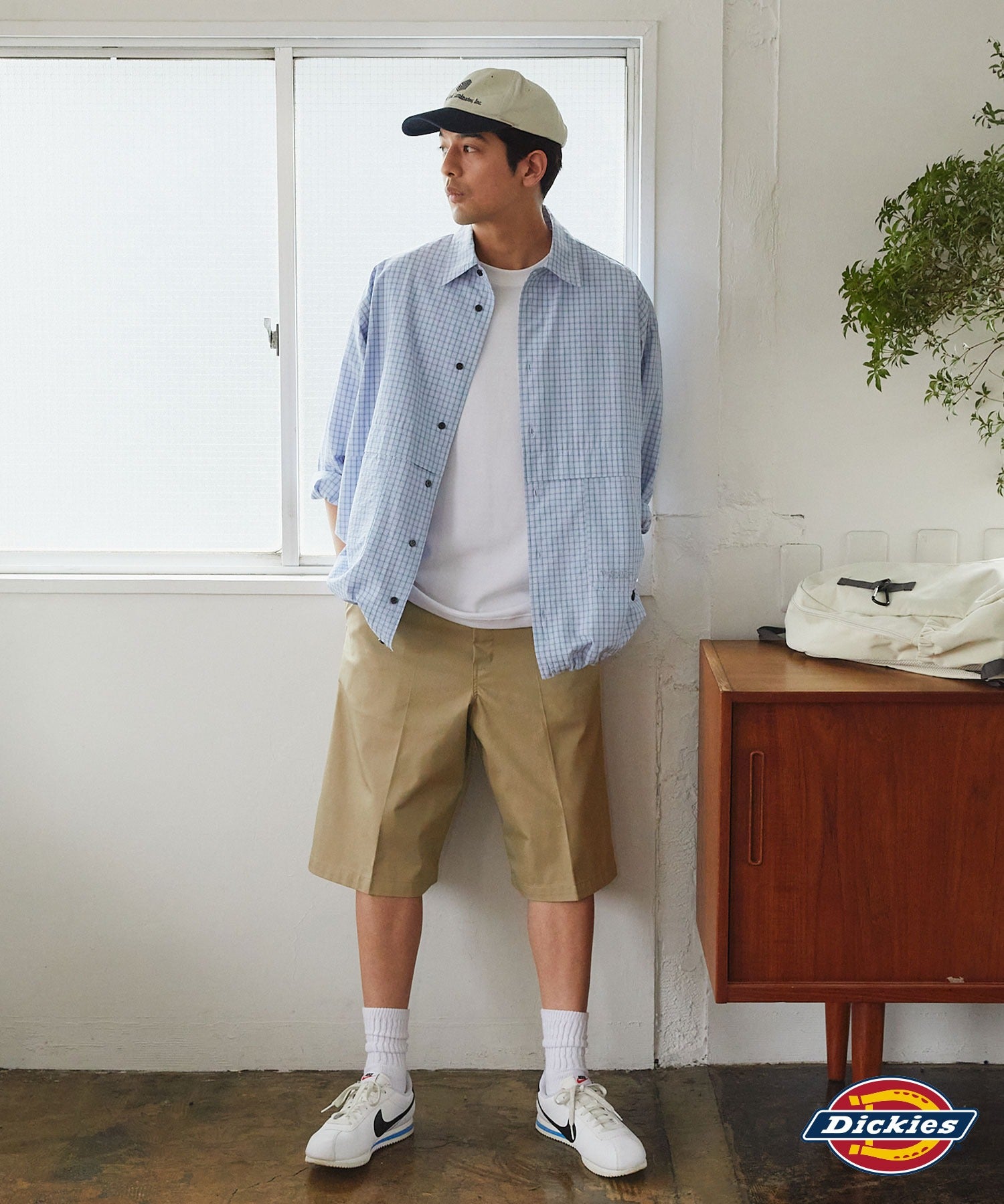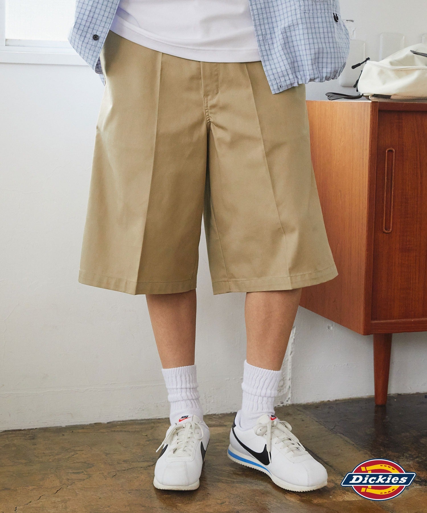 使用長年受到喜愛的 Dickies 經典布料,布料扎實有份量,能與各種單品取得良好平衡,穿起來既有挺度又舒適。適合春夏季節的五分褲長度設計,褲頭設有皮帶環,前襟為隱藏式壓釦設計,整體更具時尚感,褲管正中加入壓線設計,修飾腿型、增添俐落感,除了大容量的側邊口袋,後方亦設有實用口袋,男女皆可穿著的寬鬆版型,舒適又百搭。