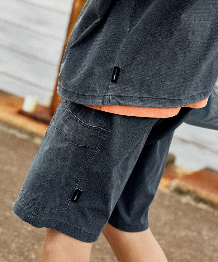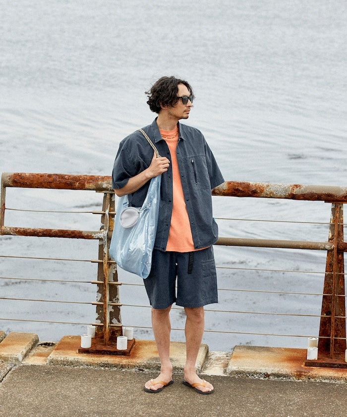為夏季開發的聚酯網眼素材,經過水洗加工處理,呈現出自然斑駁的復古仿舊風格,具備接觸涼感/UV防曬/彈性/防皺等多重機能,讓夏季穿著更舒適,採用寬鬆版型,稍短的衣長設計,即使敞開穿著也很好穿搭。