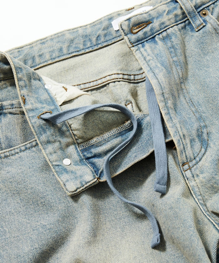 錐形牛仔褲 × 破壞風,融合街頭與復古元素,側邊延伸至褲腳的包縫細節,營造立體弧線與存在感,寬鬆版型 搭配彎曲剪裁,穿上立即顯腿細、修飾比例,腰部採用鬆緊抽繩設計,舒適好穿脫,採用特選丹寧布材質,質感扎實,搭配刷舊與破壞加工,風格滿分。