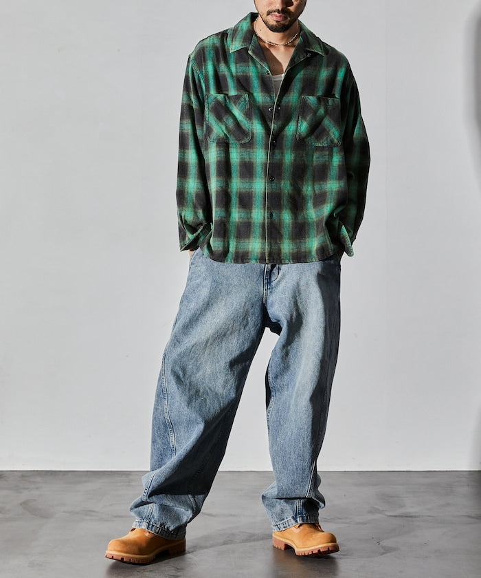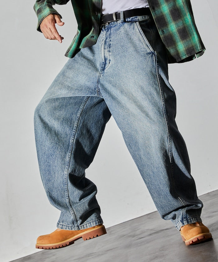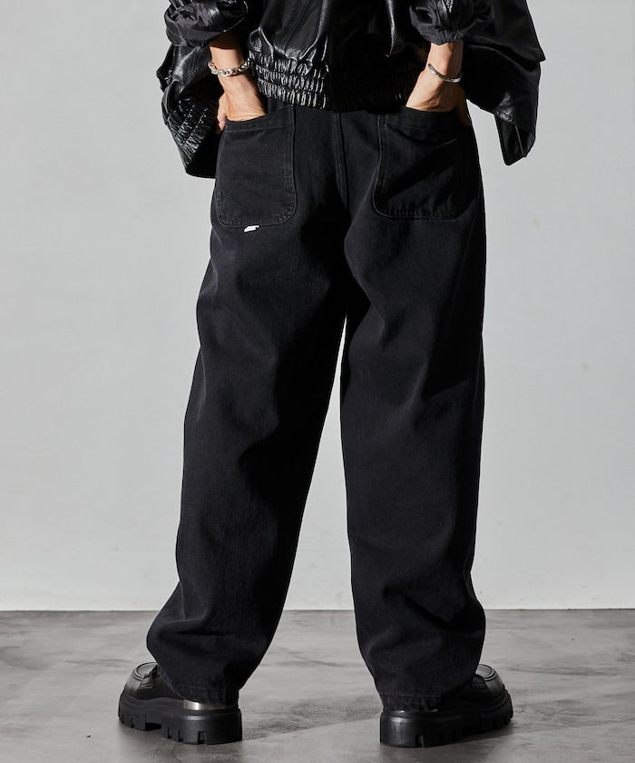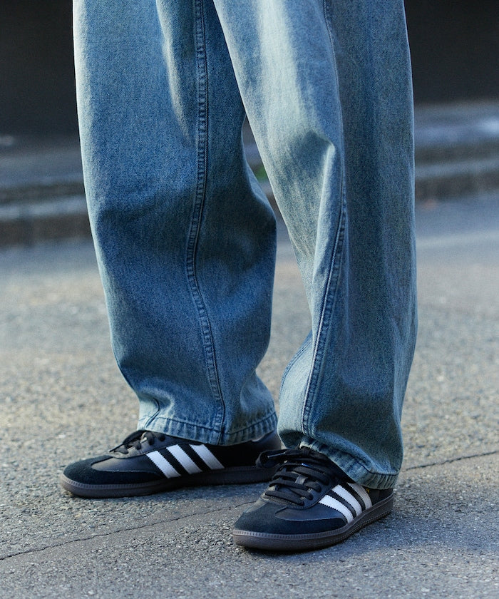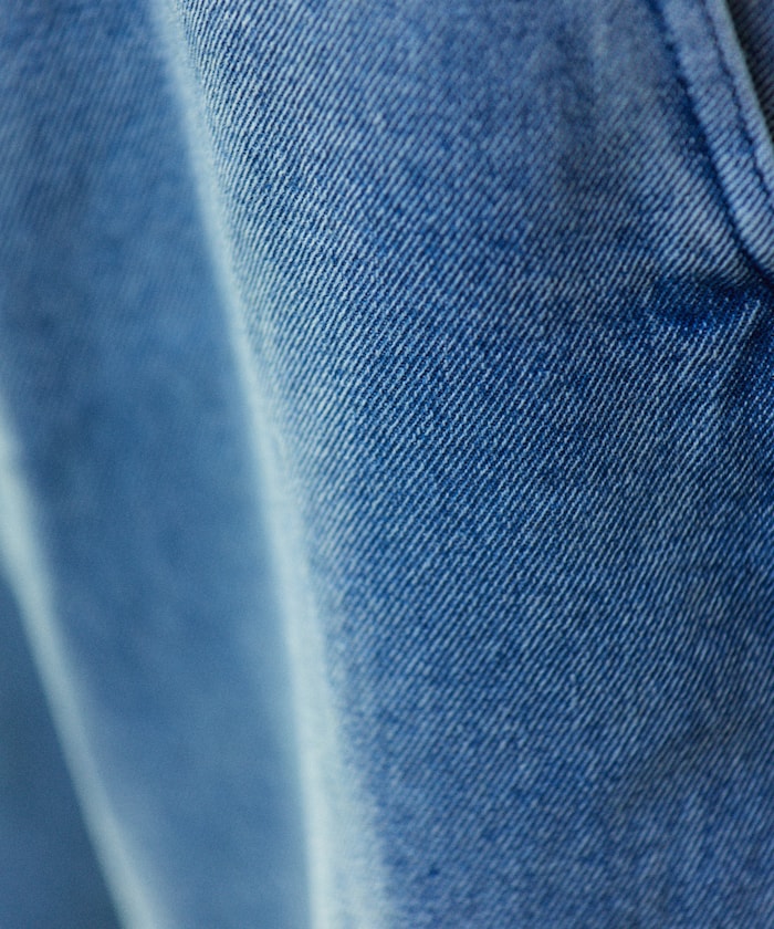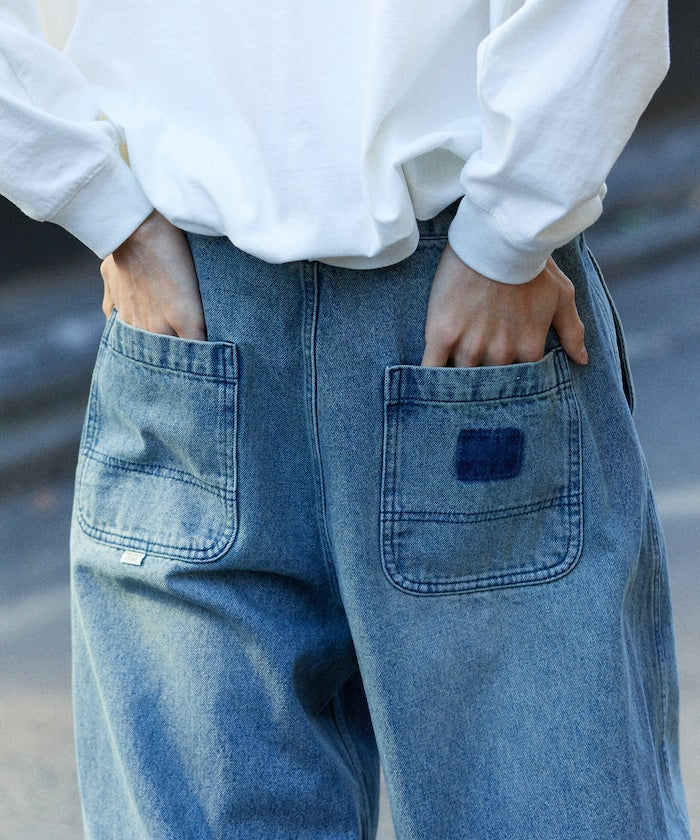 側邊延伸至褲腳的環繞式縫線,呈現立體輪廓感,腰部採用鬆緊設計,穿脫方便又舒適,背面口袋以特殊加工呈現仿舊的標籤痕跡,重現復古丹寧氛圍,精選素材搭配仿舊加工,展現濃厚的復古質感。