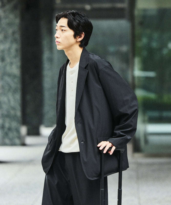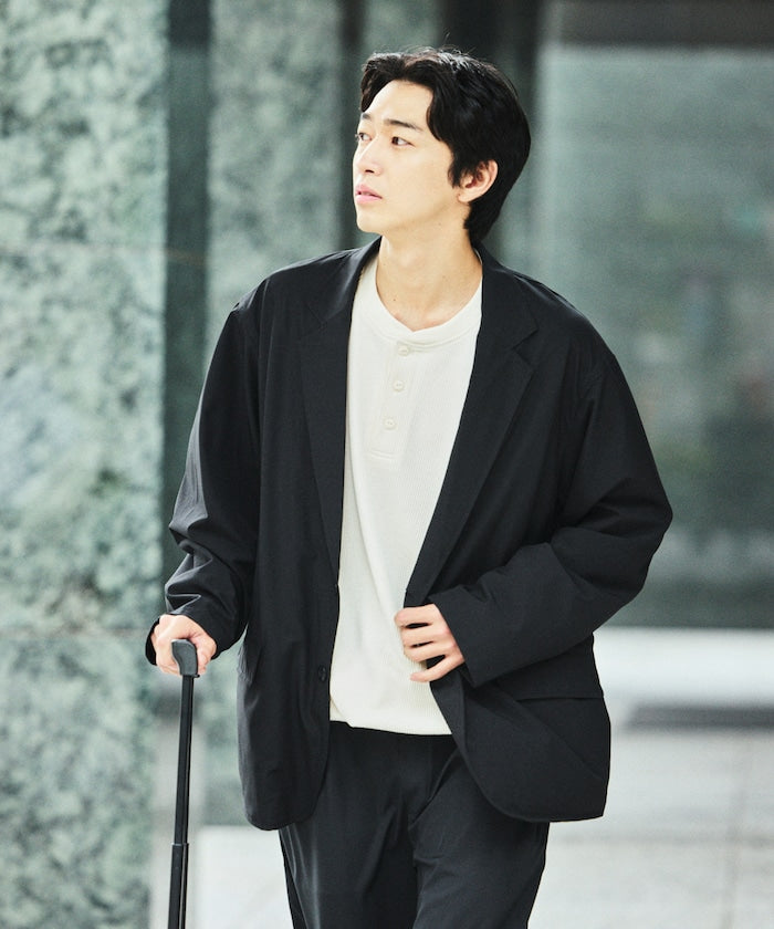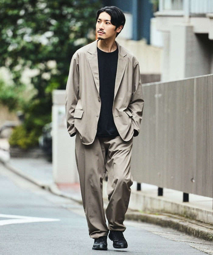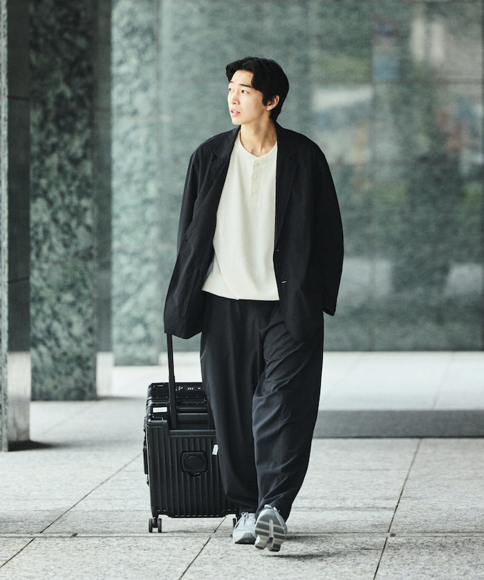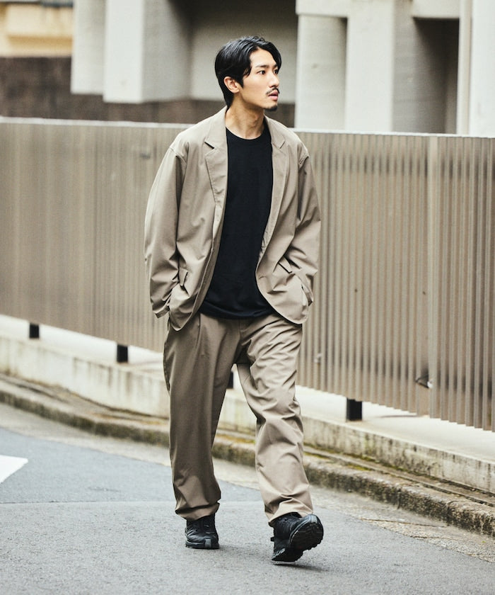 採用兼具優異防潑水性與高彈性的全新素材,高度機能設計,搭配多種巧思細節的套裝,外套內側設有多個口袋,下身為舒適的鬆緊腰設計,搭配寬版錐形輪廓的版型,不僅能成套著用,單品單穿也同樣實用,無論旅行、日常或各種場合,都能輕鬆穿搭。