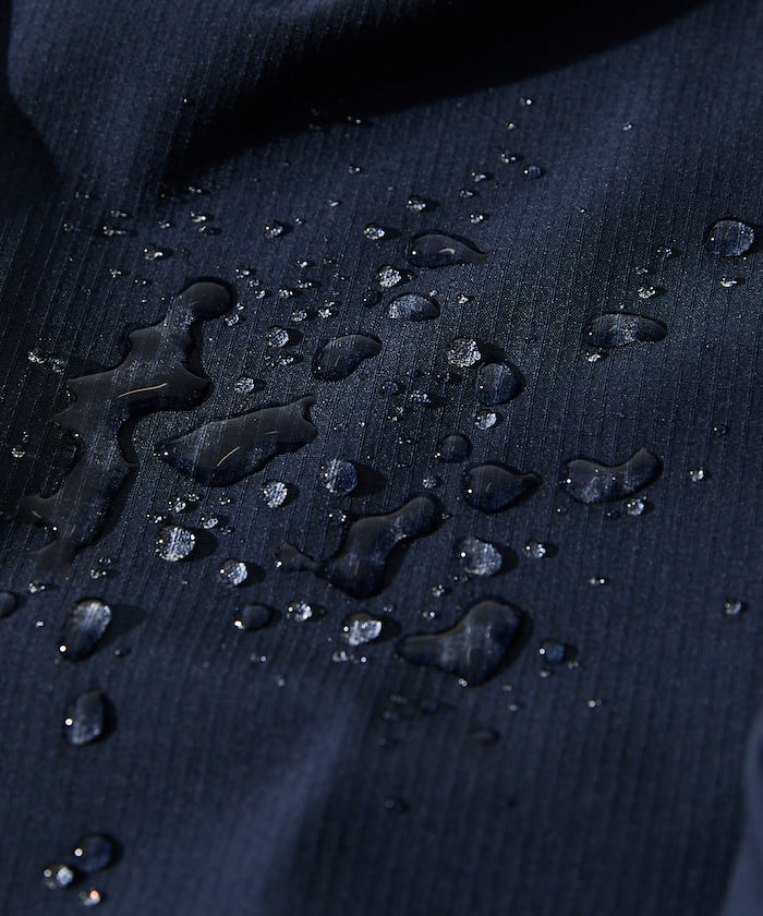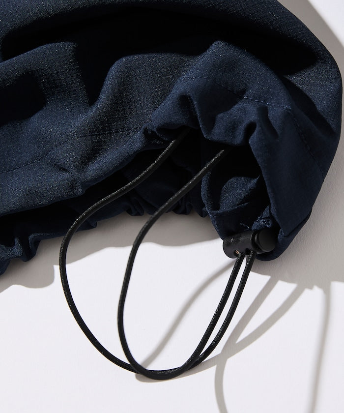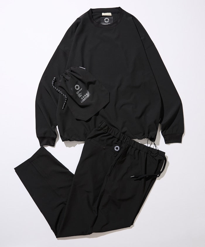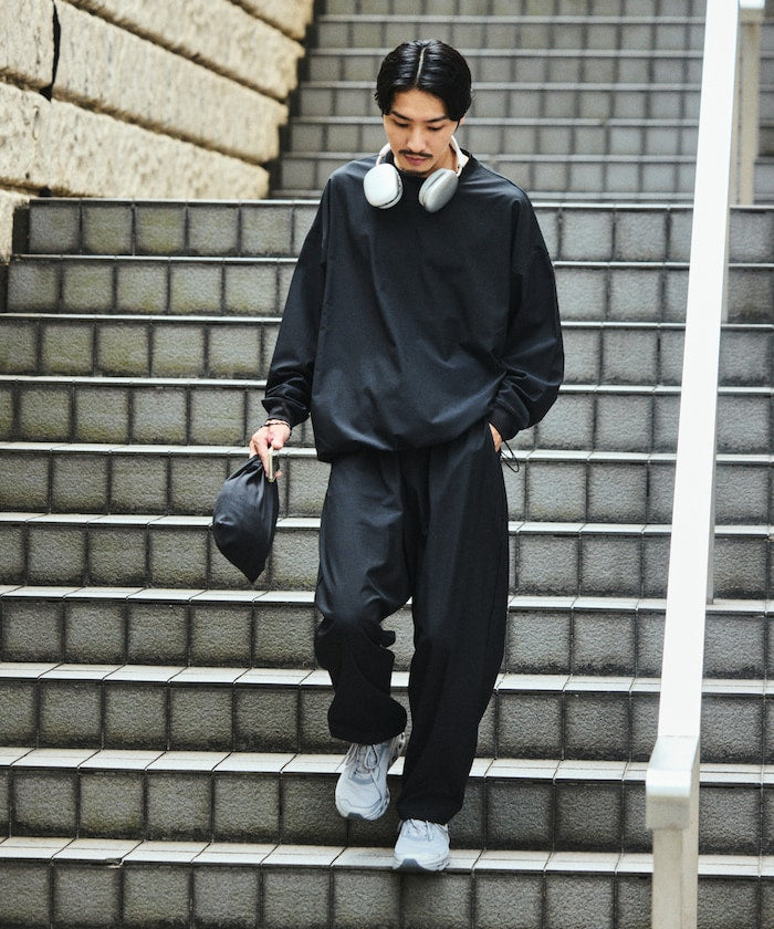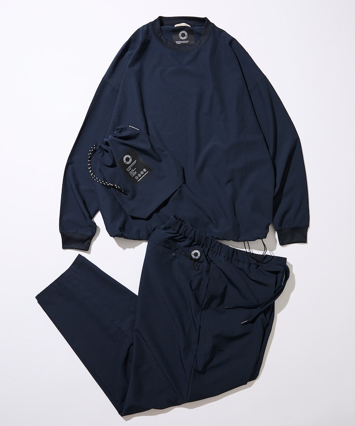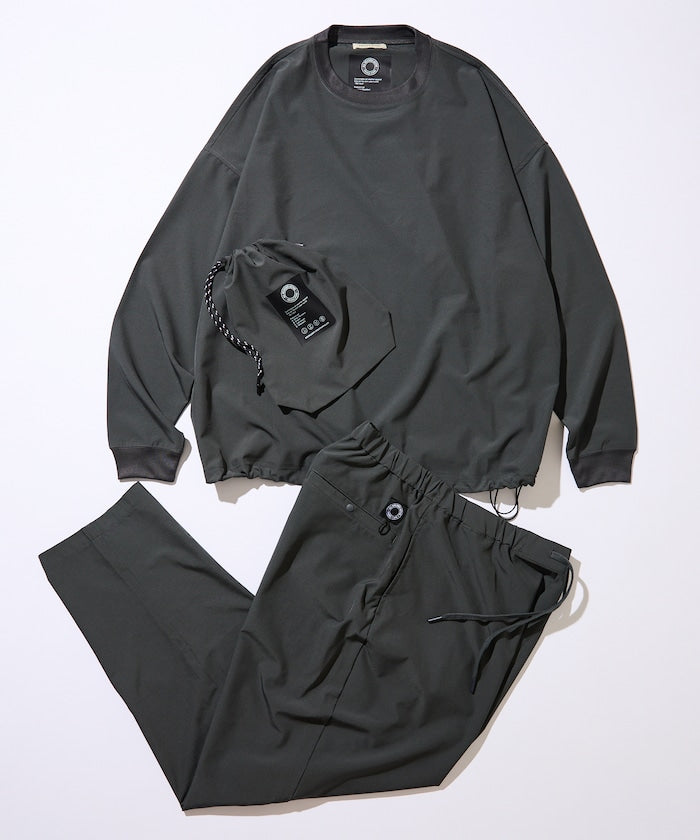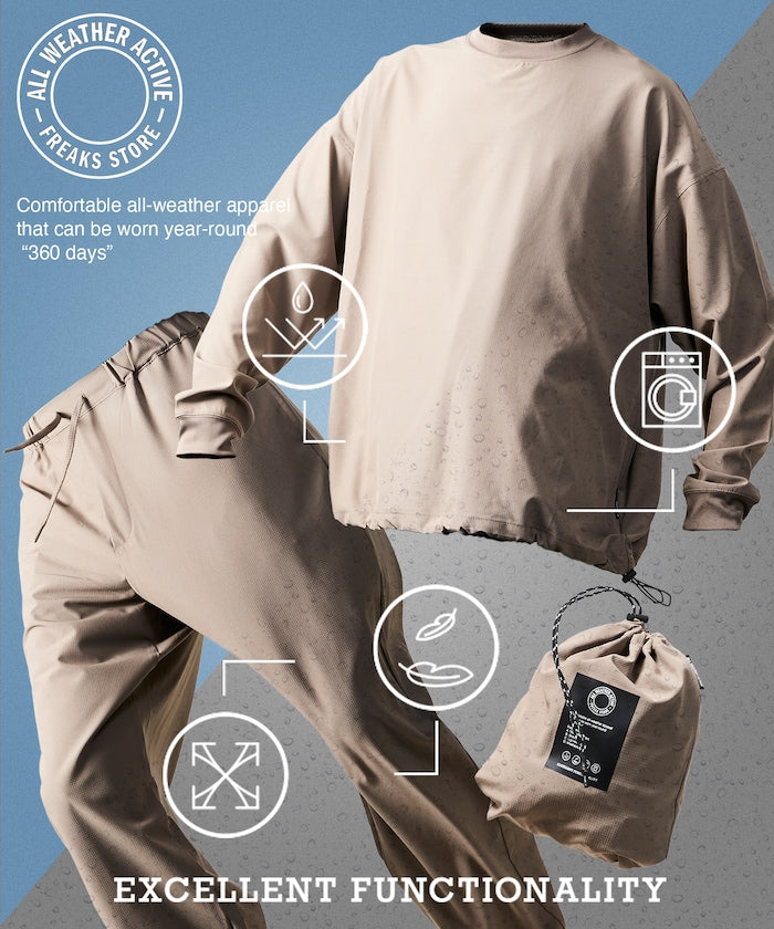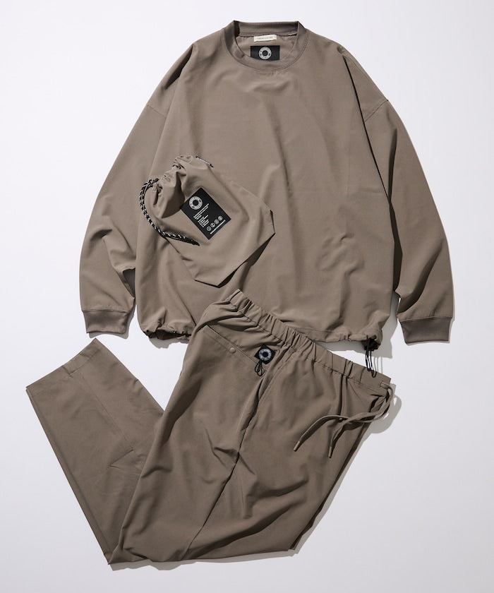 採用兼具優異防潑水性與高彈性的全新素材,高度機能設計,搭配多種巧思細節的一件單品,剪裁為適度寬鬆的版型,展現輕鬆舒適的氛圍。上衣為圓領套頭款式,下擺處設有抽繩,可依喜好調整輪廓,褲款則為勾勒柔和曲線的寬版錐形剪裁,可收納的設計,旅行或外出攜帶十分便利。