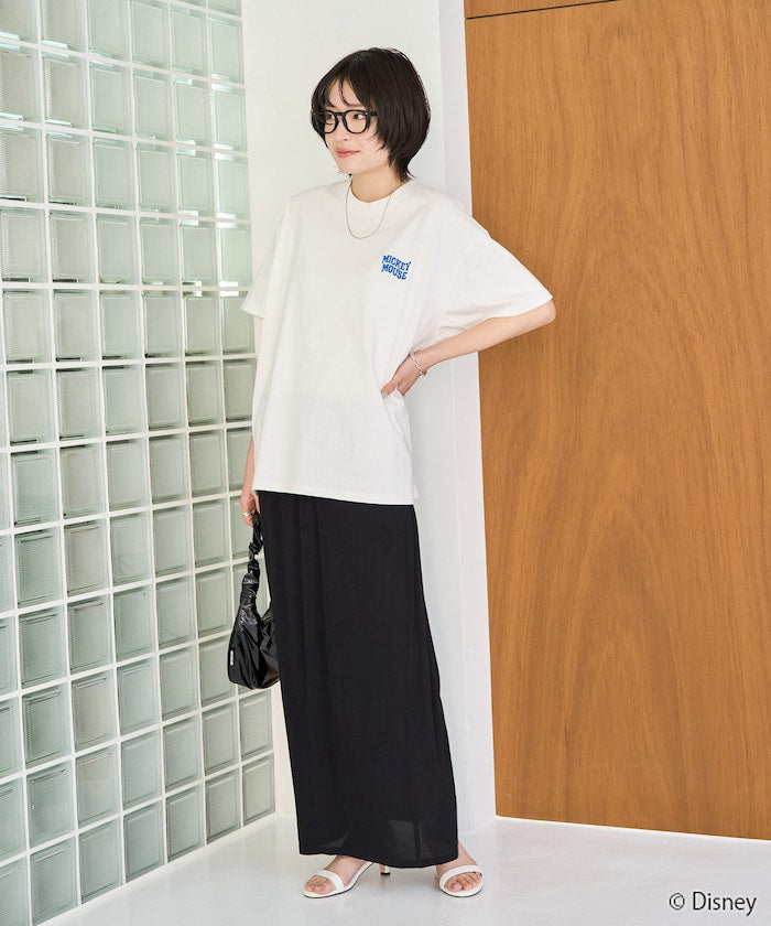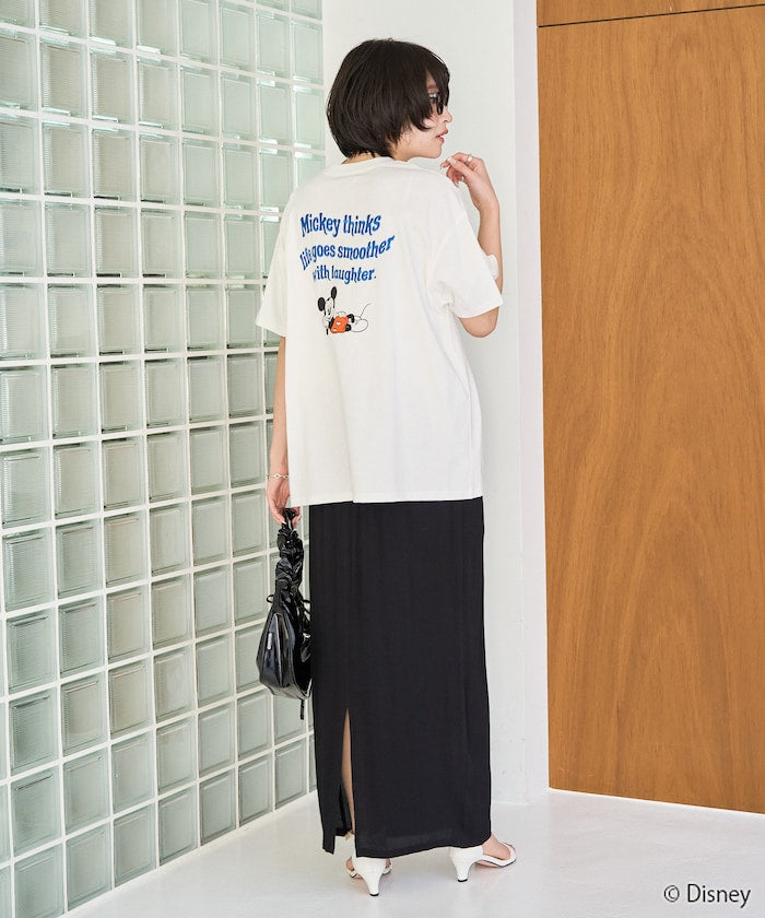 背面為 Mickey Mouse 印花圖案搭配精緻刺繡字樣,增添立體感,胸前則以簡約品牌標誌呈現,營造清爽設計感,採用具彈性的舒適面料,穿著舒適自在,加長版衣長與寬鬆剪裁,可自然遮蓋臀部,安心又修身,是一件結合舒適與可愛、設計感與實用性的春夏必備單品。