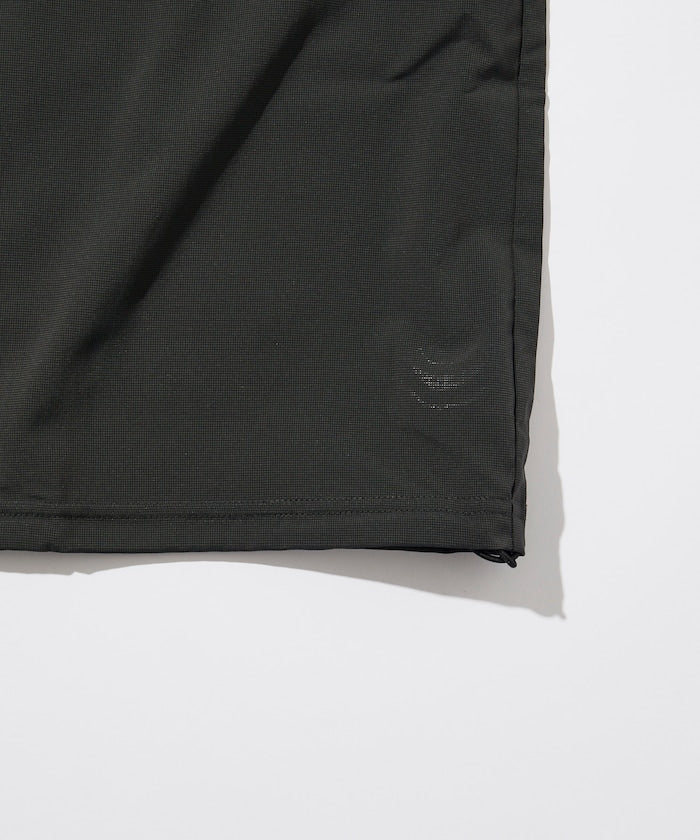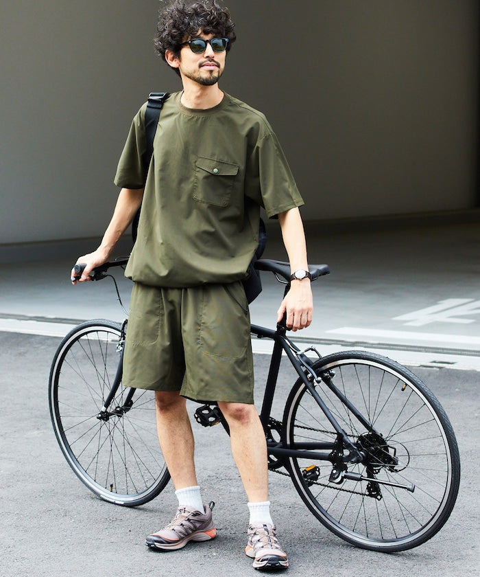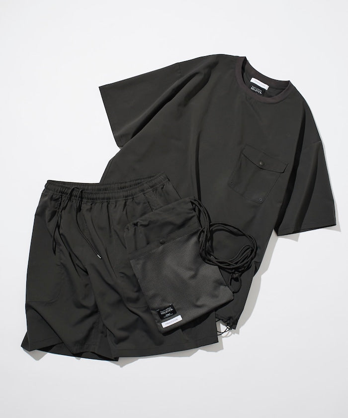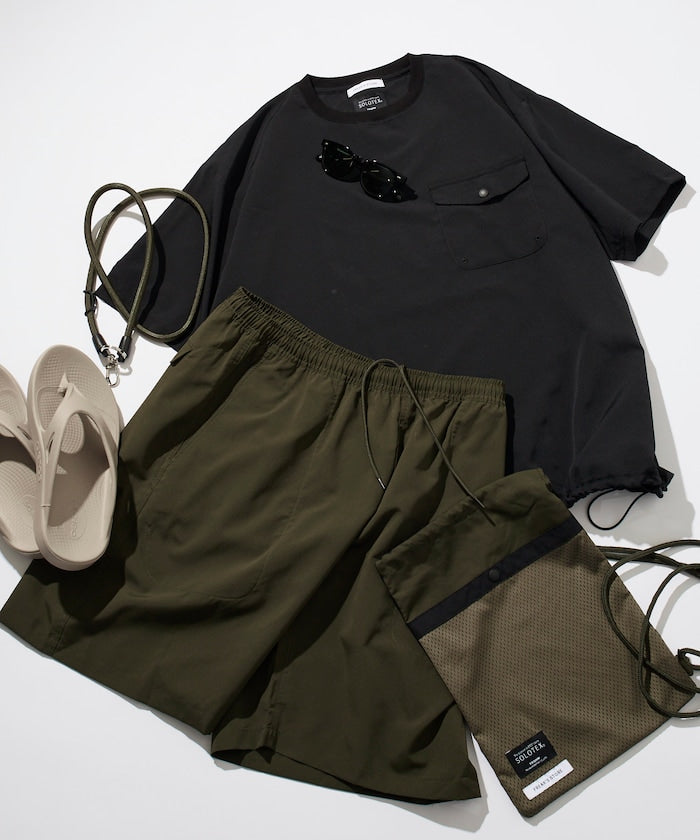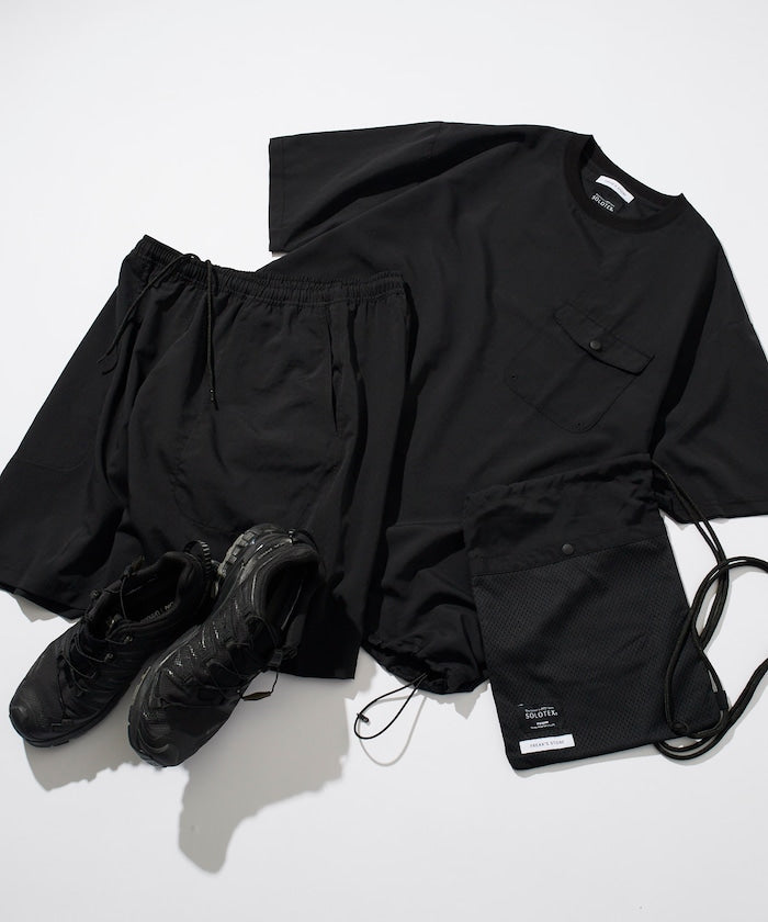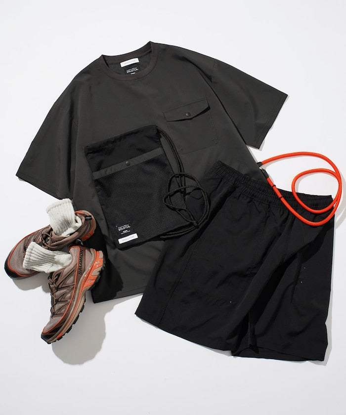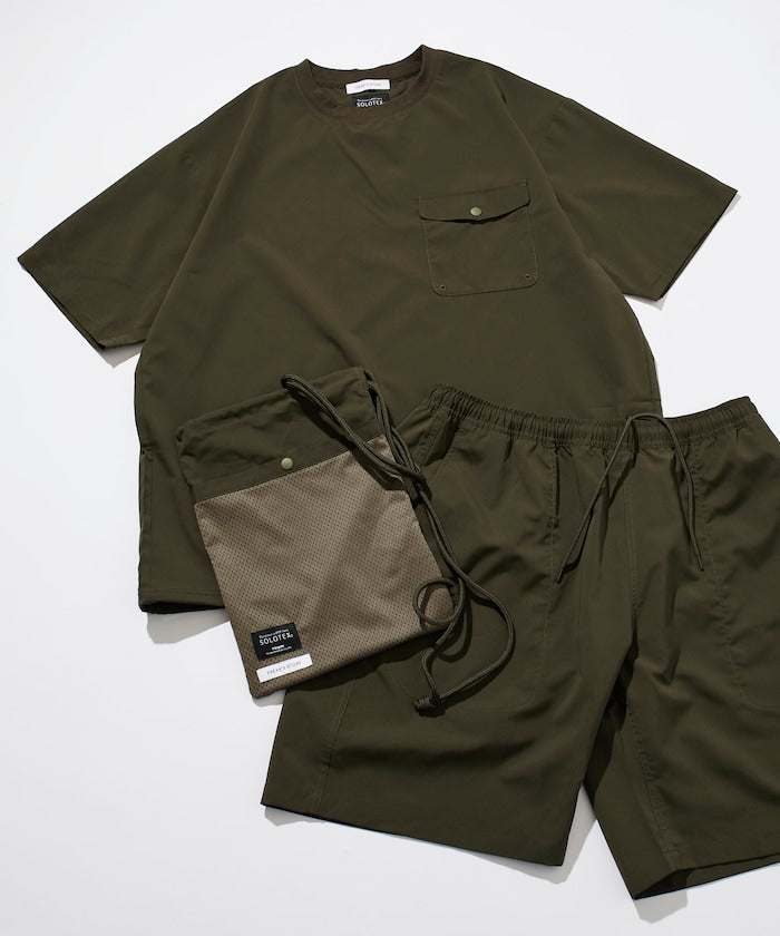 採用細密網眼面料,高透氣性與吸水速乾機能兼具,即使是炎熱盛夏或長時間旅行穿著也不悶熱,布料使用由帝人富瑞特株式會社開發的SOLOTEX® 科技纖維,具有天然彈性,穿起來輕盈舒適、活動自如,T恤為休閒寬鬆版型,下擺有可調節束口設計,方便依需求變化造型,短褲為不過短的膝上長度,同樣為寬鬆版型,附有一個可收納整套衣物的迷你收納袋,可當作隨身小包使用,還附有網袋隔層,方便又實用。