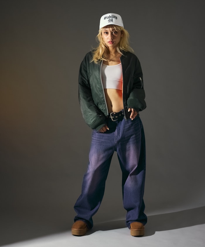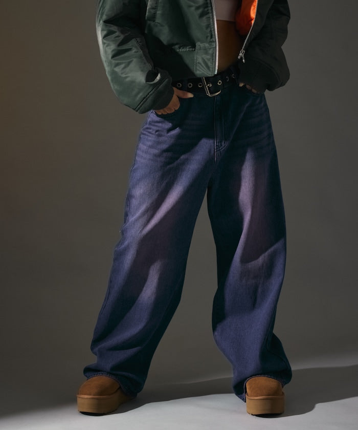 採用純棉牛仔布,提供舒適穿著感,如復古牛仔褲般的仿舊加工效果,打造獨特的褪色感與質感色澤,自然垂墜的寬直筒版型,展現俐落又有份量感的現代剪裁,腰部採無摺設計,打造乾淨俐落的腰部線條,亦適合將上衣紮入的造型風格。