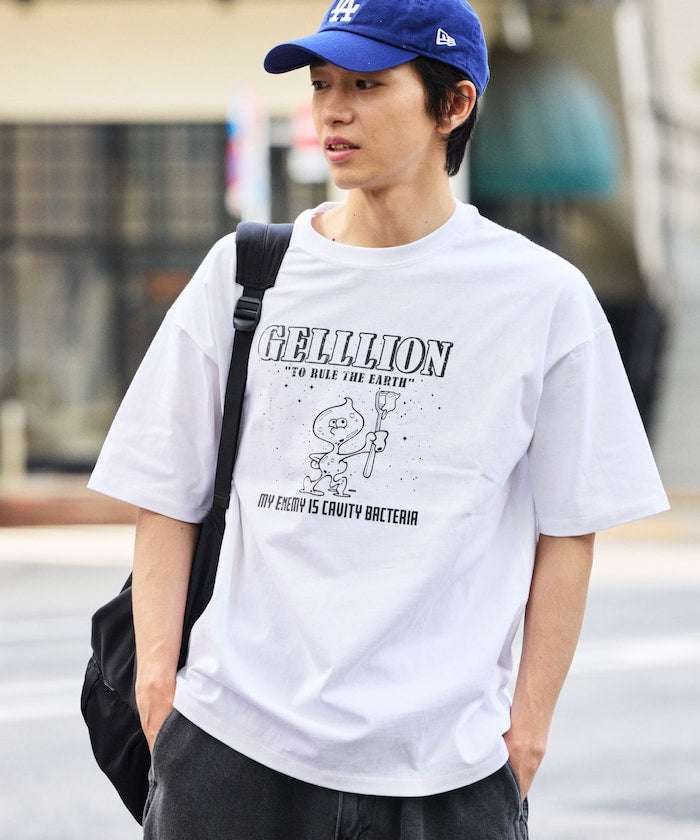 以 GELLION(ゲルリオン)為主題設計的印花短袖T恤,GELLION(ゲルリオン)是FREAK'S STORE 原創設計的新角色,是一位前來征服地球的外星人,這個角色延伸出一系列原創服飾,展現出幽默與復古風格的結合。T 恤正面印有企圖征服地球的 GELLION 以及趣味性十足的圖案,採用單色印刷,呈現出良好的色澤與復古風質感。設計為寬鬆的休閒剪裁,男女皆可穿著,適合各種穿搭風格。