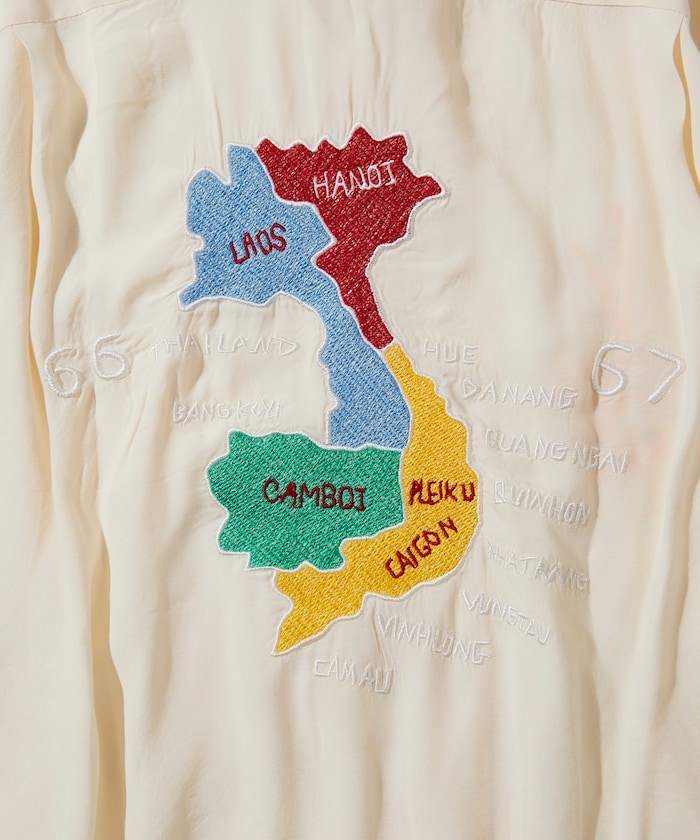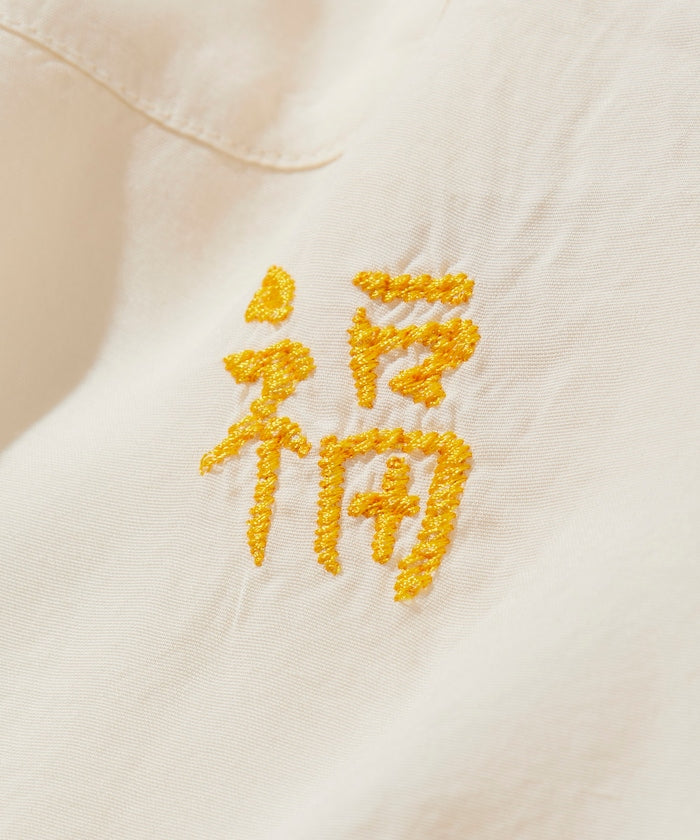 布料擁有自然光澤與垂墜感,觸感清爽、不易黏膚,穿著舒適,搭配吸睛刺繡設計,成為春夏造型中的亮眼單品,繡有「福」字、地圖等充滿復古氛圍的圖案,營造出懷舊感十足的藝術風格,寬鬆的版型,前襟選用高級質感的貝殼鈕扣,細節處亦不馬虎。