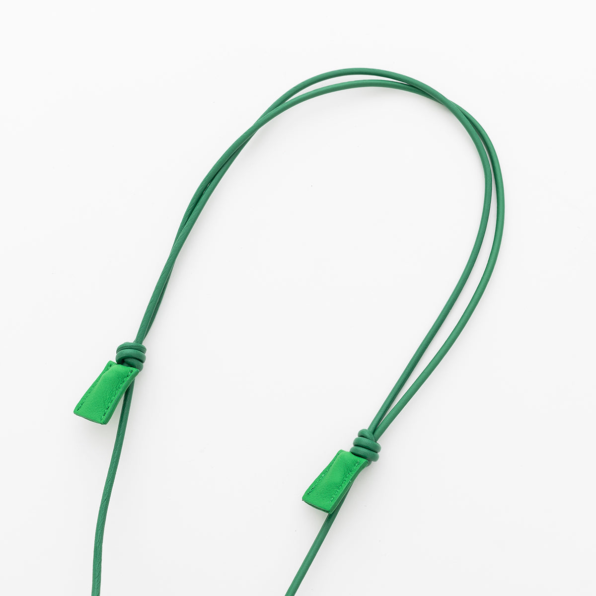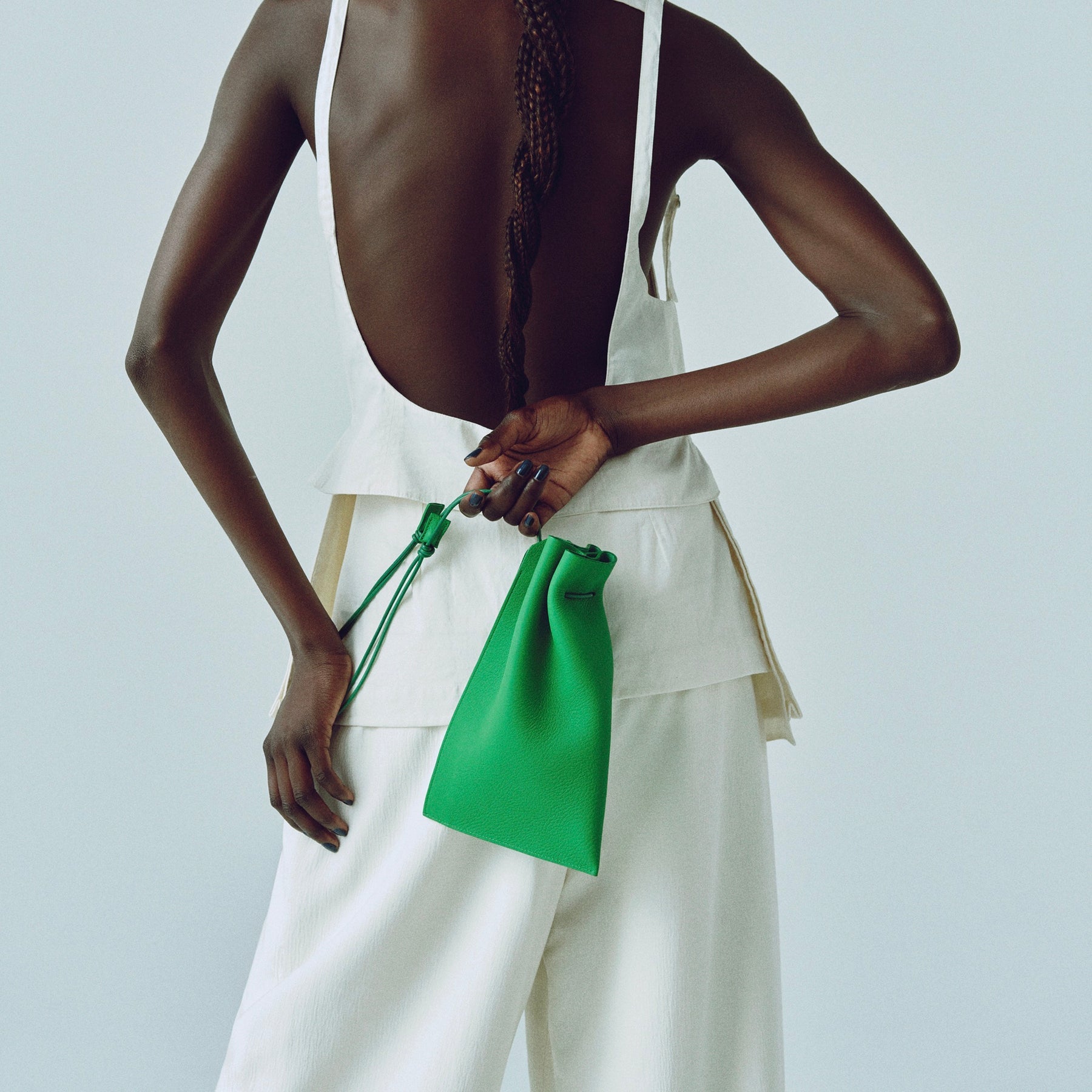 這款束口斜背包以美洲原住民的傳統包款為設計靈感,獨特的綠色款為 ICHI GALLERY 與 ITTI Online Shop 的限定配色。包款的縫製工藝、邊緣處理及五金配件的形狀均為極簡且精緻的設計,使其呈現出不同於以往的新穎風格。包包能夠輕鬆收納錢包、手機、記事本等必要隨身物品,同時仍保持輕巧便利。肩背帶採用可調節結繩設計,可根據個人需求調整長度,實現手提、肩背、頸掛或斜背等多種背法。