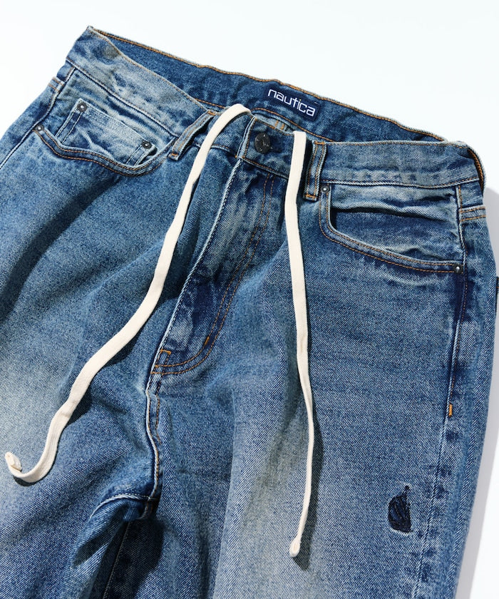 採用經過水洗處理,展現獨特復古質感的牛仔布料,寬鬆的剪裁、腰部配有抽繩設計,穿著更舒適自在,適度的刷色、呈現立體層次感,左側有 NAUTICA 經典的刺繡標誌,是從休閒到街頭風格都能輕鬆駕馭的一款單品