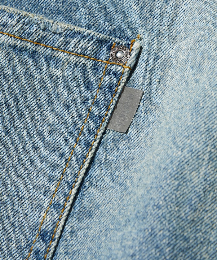 採用12.5oz牛仔布,工裝褲設計,加入工具口袋等工裝褲的細節,後側口袋有品牌刺繡設計。