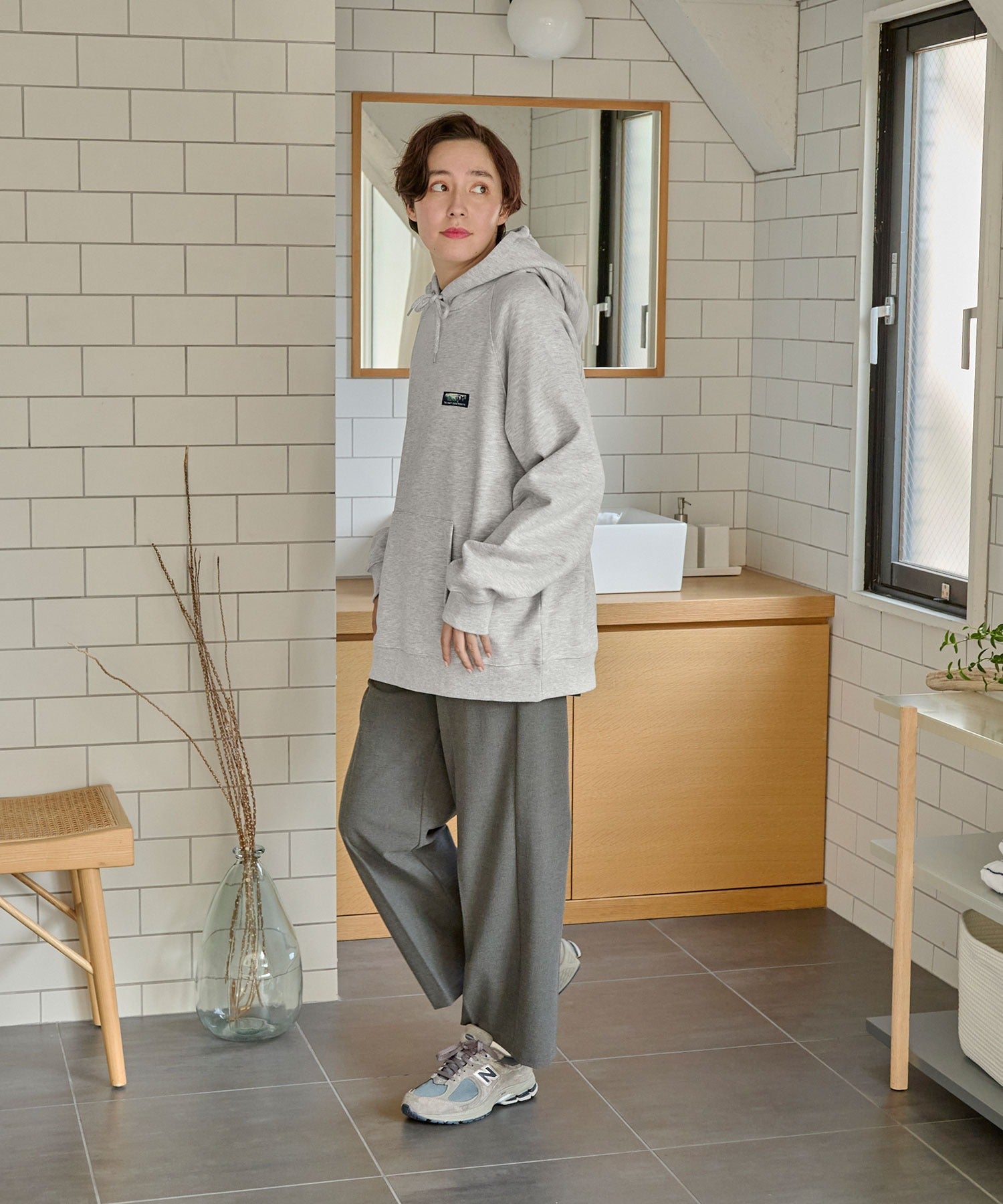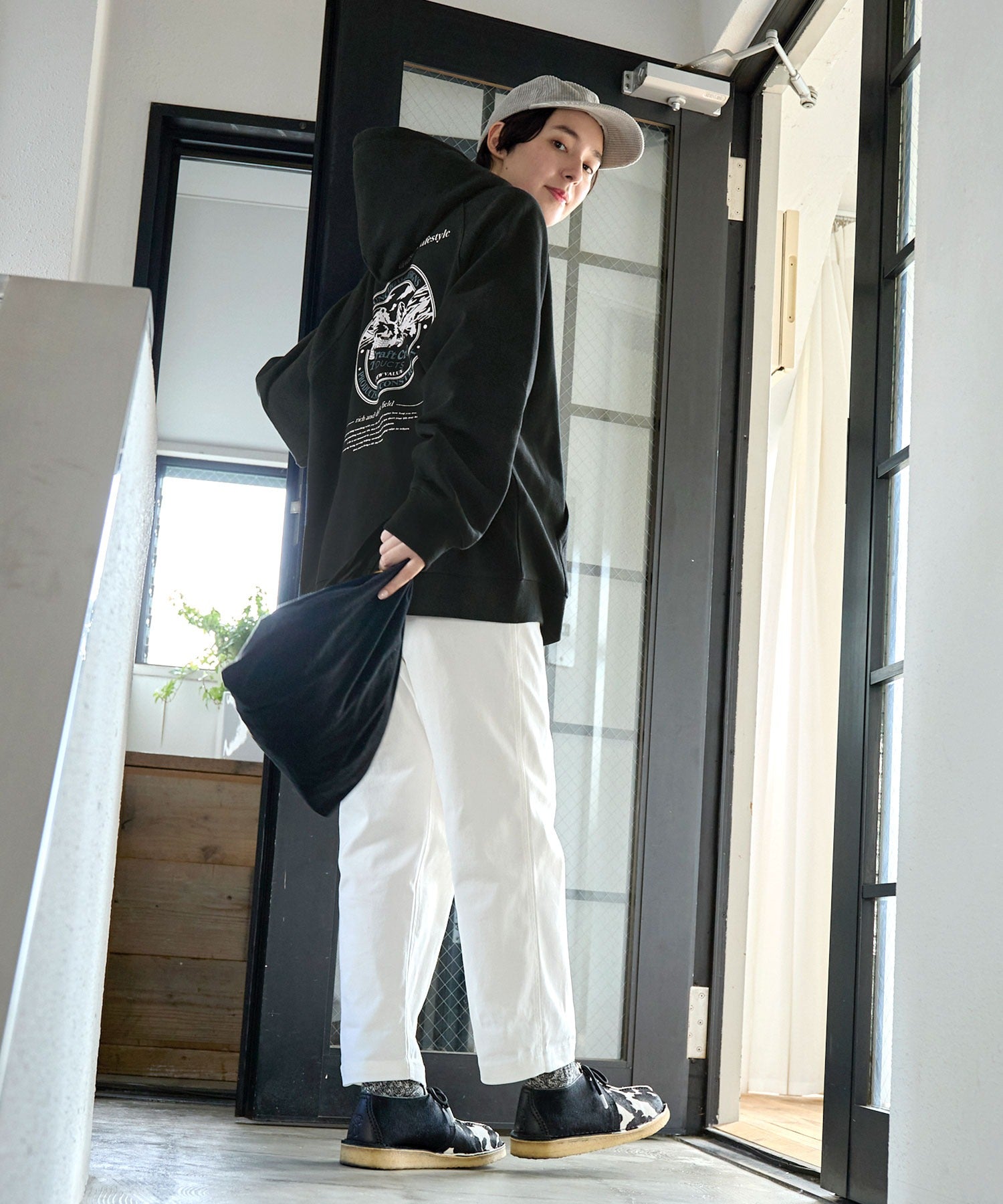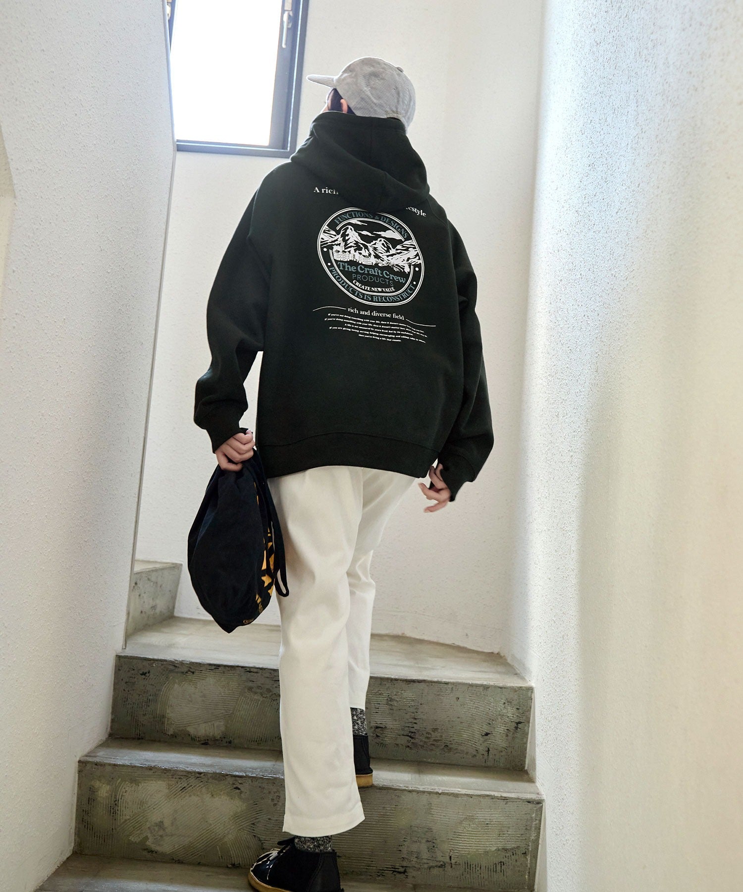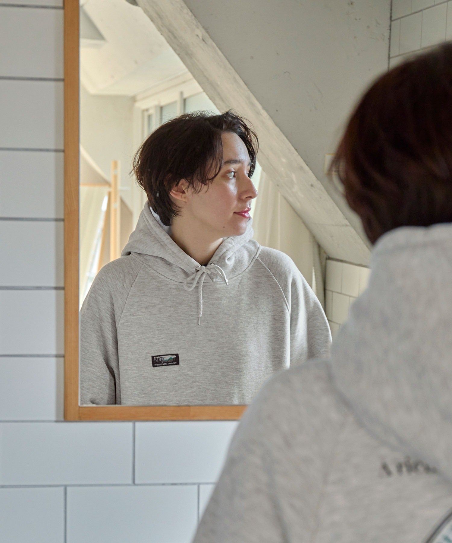 選用12盎司的美國棉質面料,質地厚實,擁有乾爽的手感,並且肌膚觸感舒適,此面料具備吸水速乾功能,有效減少悶熱感,提供舒適的穿著感,日常穿搭無負擔。背部印有以瑞士的市區風景為靈感的圖案,並以圓形Logo設計,展現獨特的視覺效果,左胸處則有簡約品牌的標籤,與整體設計呼應。寬鬆的剪、袖口與下擺的羅紋設計則為整體輪廓增添了層次感,帽子處設有抽繩可作調節,無論男女都可以輕鬆穿著,為日常穿搭增添更多選擇。