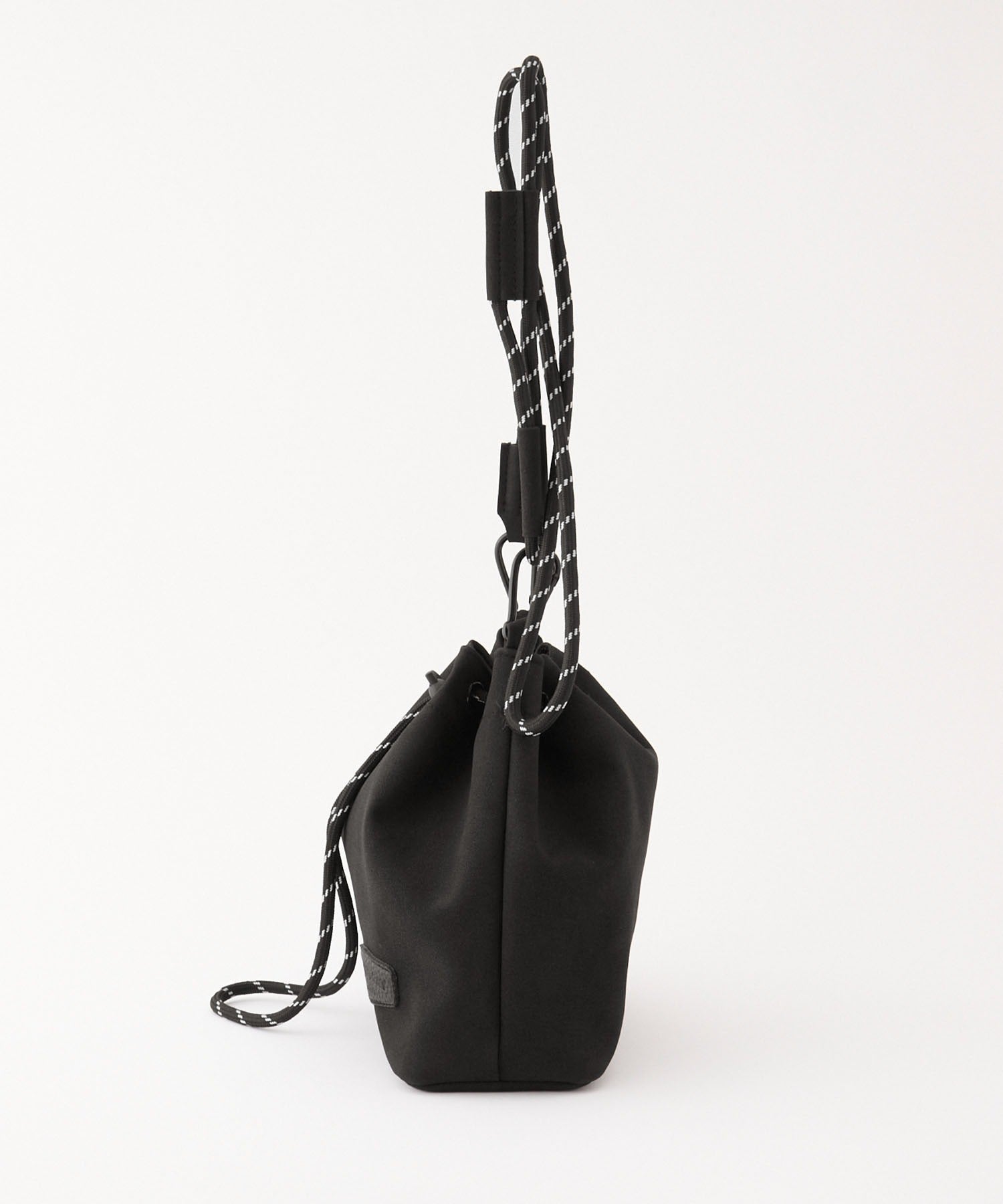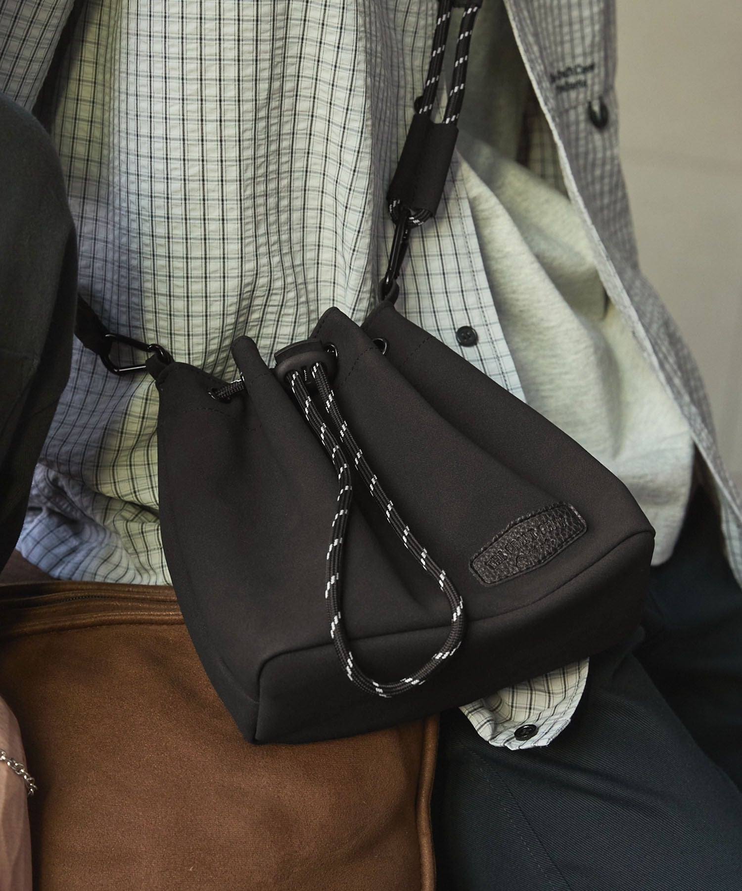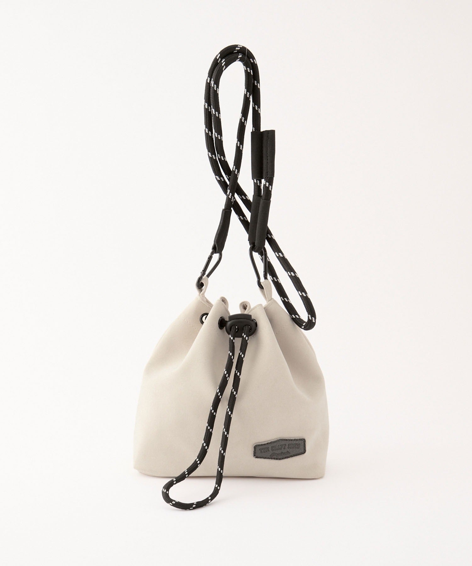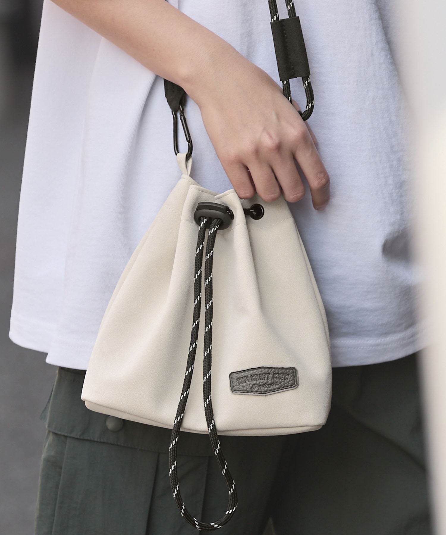 包身使用麂皮質感的合成皮革搭配品牌皮革品牌標誌,經過防潑水加工處理,不易沾染污漬,就算下雨天也能安心使用。不僅可作為肩背包使用,拆下背帶後也能作為巾著袋使用,肩帶採用耐用性高、同時也是設計亮點的傘繩材質,並使用方便拆卸的登山扣設計,內側設有拉鍊口袋,能安心收納鑰匙、耳機等小物,包款尺寸專為「只想帶手機和錢包等少量物品」的外出需求所設計,大小剛剛好,是一款男女皆可使用的中性單品。