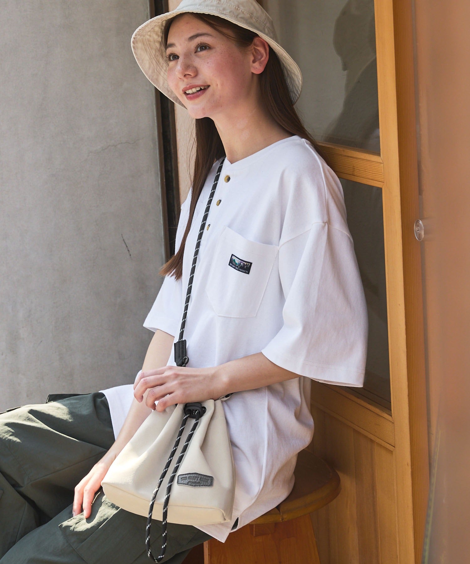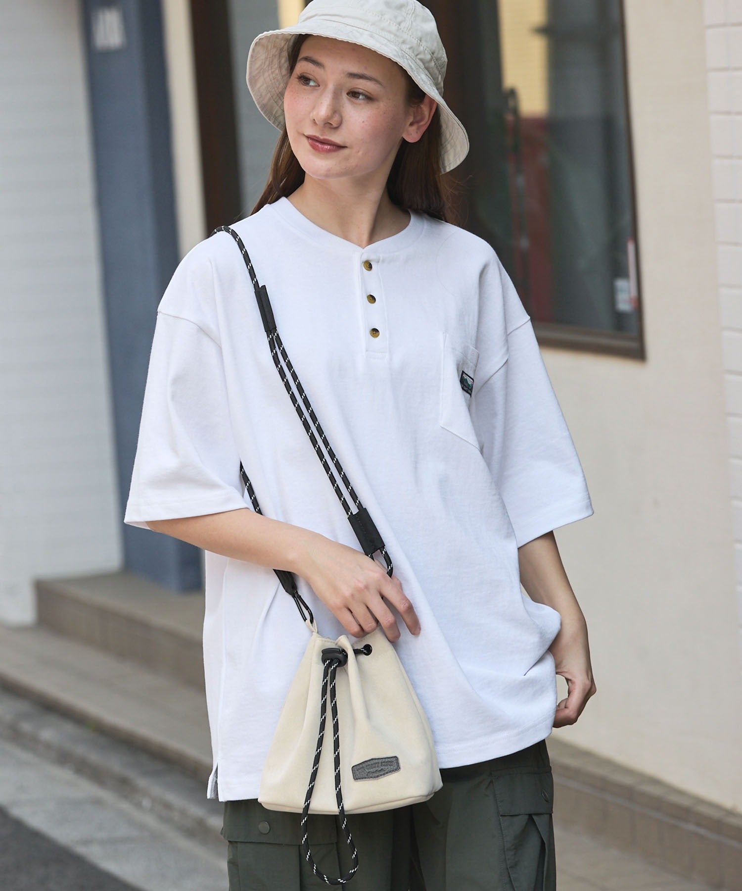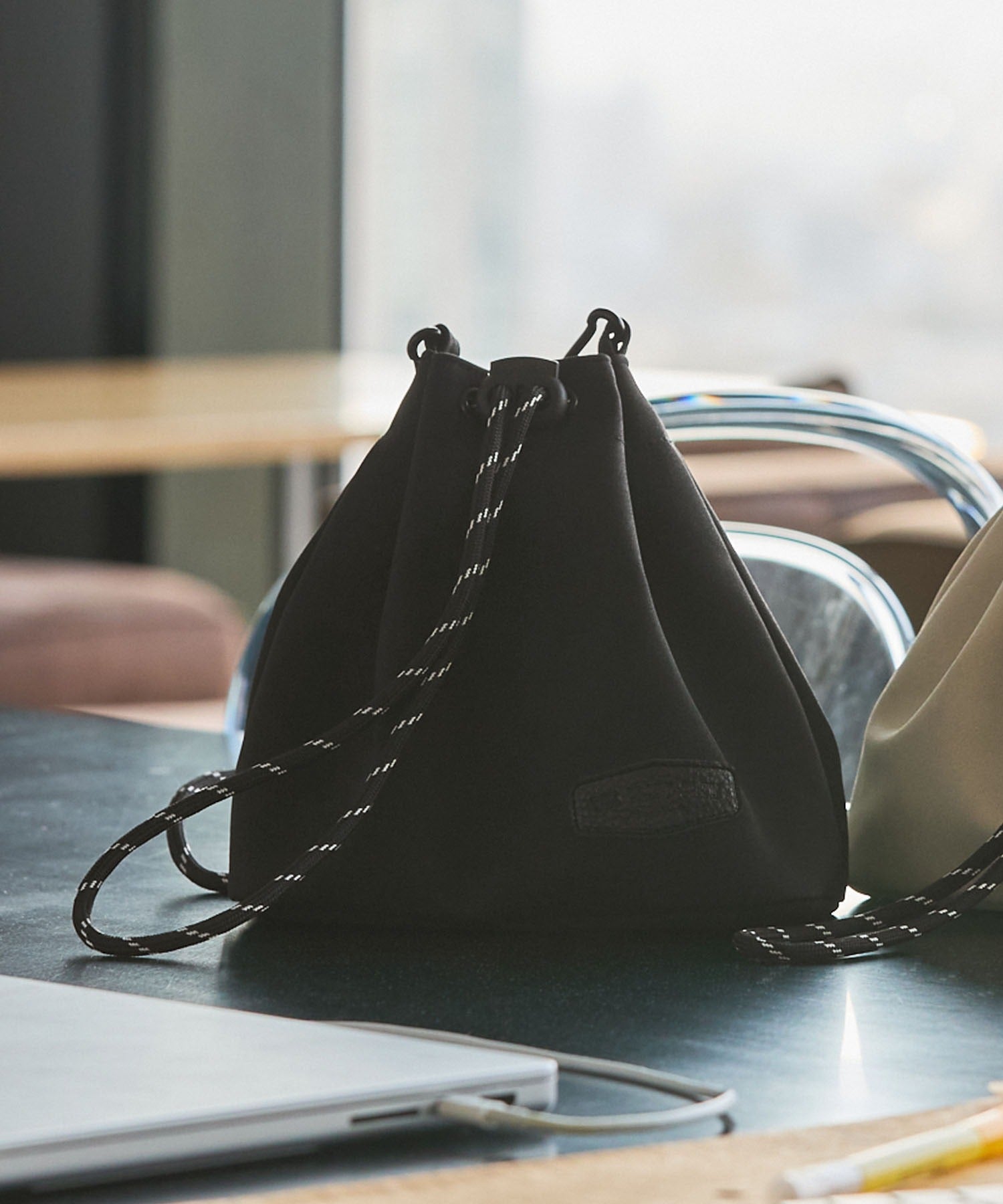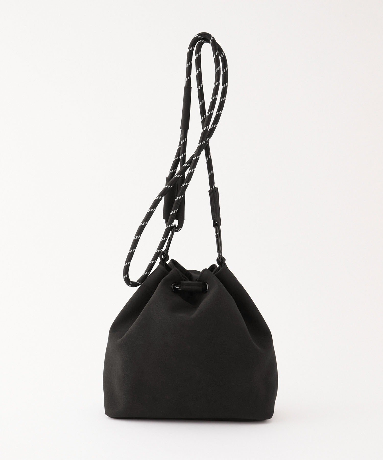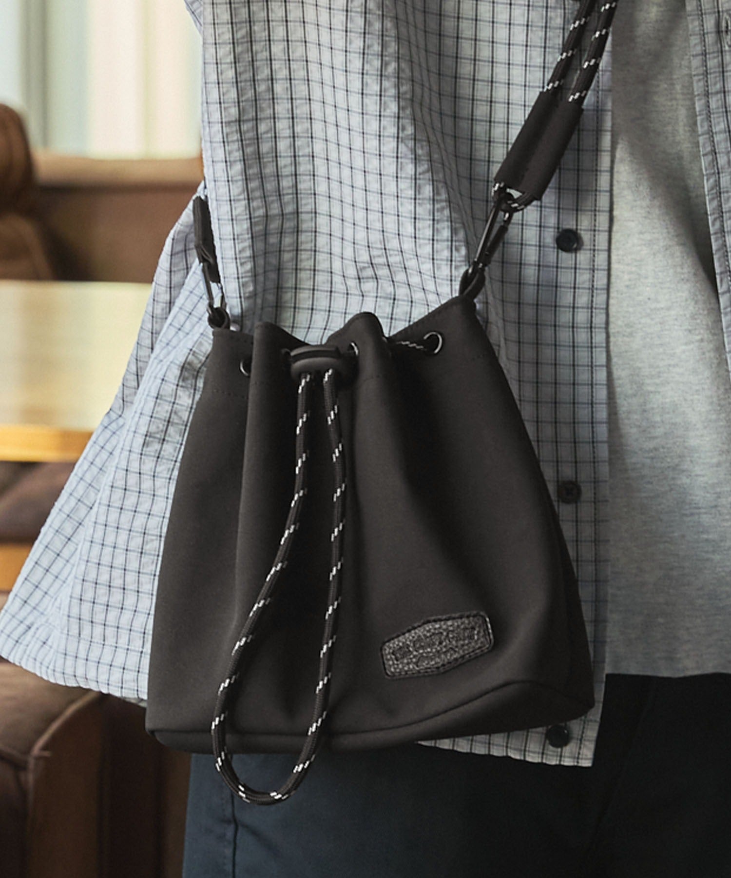 包身使用麂皮質感的合成皮革搭配品牌皮革品牌標誌,經過防潑水加工處理,不易沾染污漬,就算下雨天也能安心使用。不僅可作為肩背包使用,拆下背帶後也能作為巾著袋使用,肩帶採用耐用性高、同時也是設計亮點的傘繩材質,並使用方便拆卸的登山扣設計,內側設有拉鍊口袋,能安心收納鑰匙、耳機等小物,包款尺寸專為「只想帶手機和錢包等少量物品」的外出需求所設計,大小剛剛好,是一款男女皆可使用的中性單品。