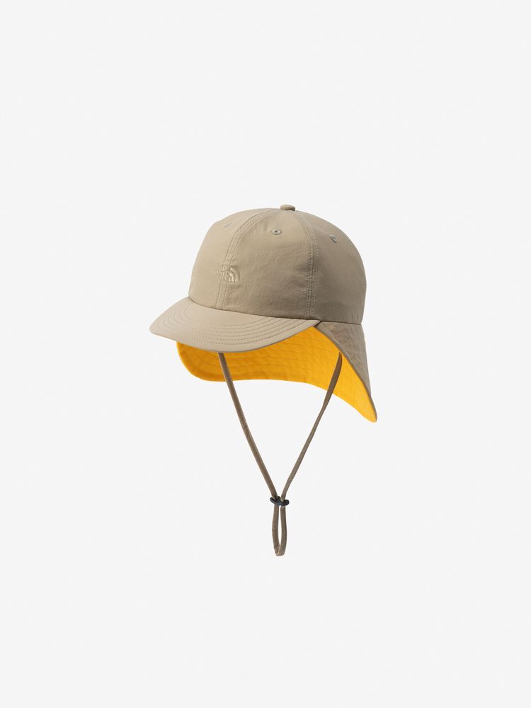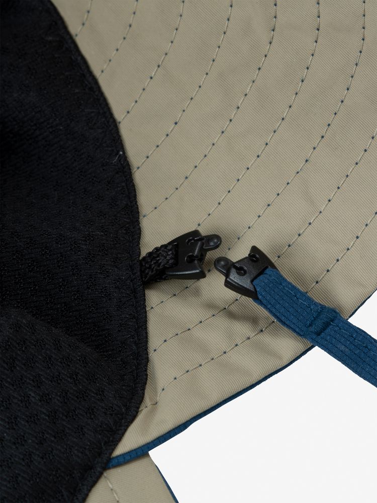採用輕盈柔滑的面料,表面的透氣孔能有效減少悶熱感,具備優異的透氣性,能有效釋放頭部的悶熱與濕氣,具備UV防護(UPF30–50+,紫外線遮蔽率達90%以上)性能,採用對肌膚溫和的防蟲加工技術,能在戶外活動中保護孩子的肌膚免受蚊蟲叮咬,垂布部分可遮蓋後頸及耳朵周圍,另附可拆式下巴繩。撞色的設計為整體造型增添亮點,無論是夏季露營或是日常在公園玩耍時,都非常實用。