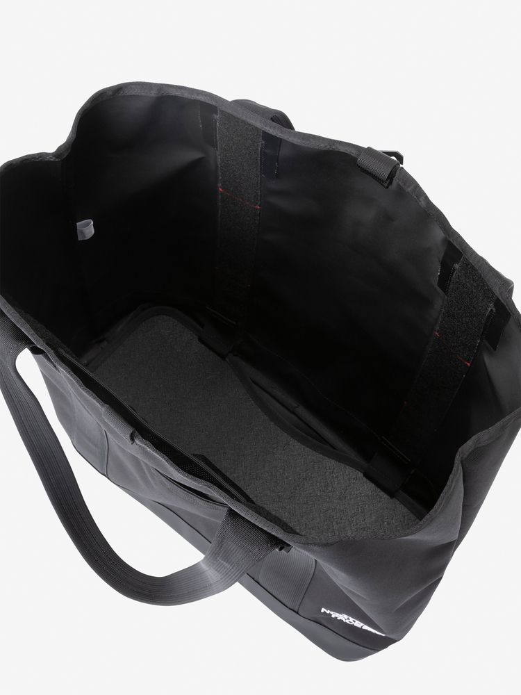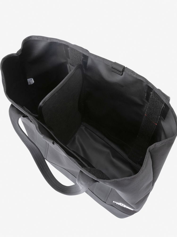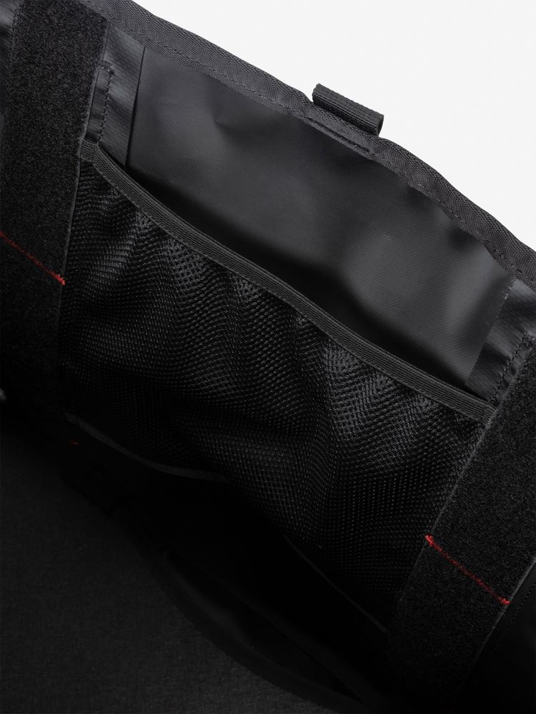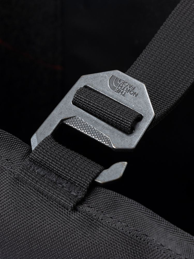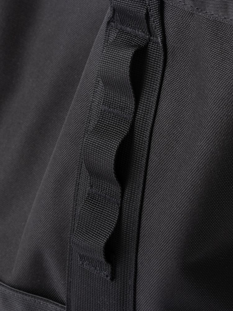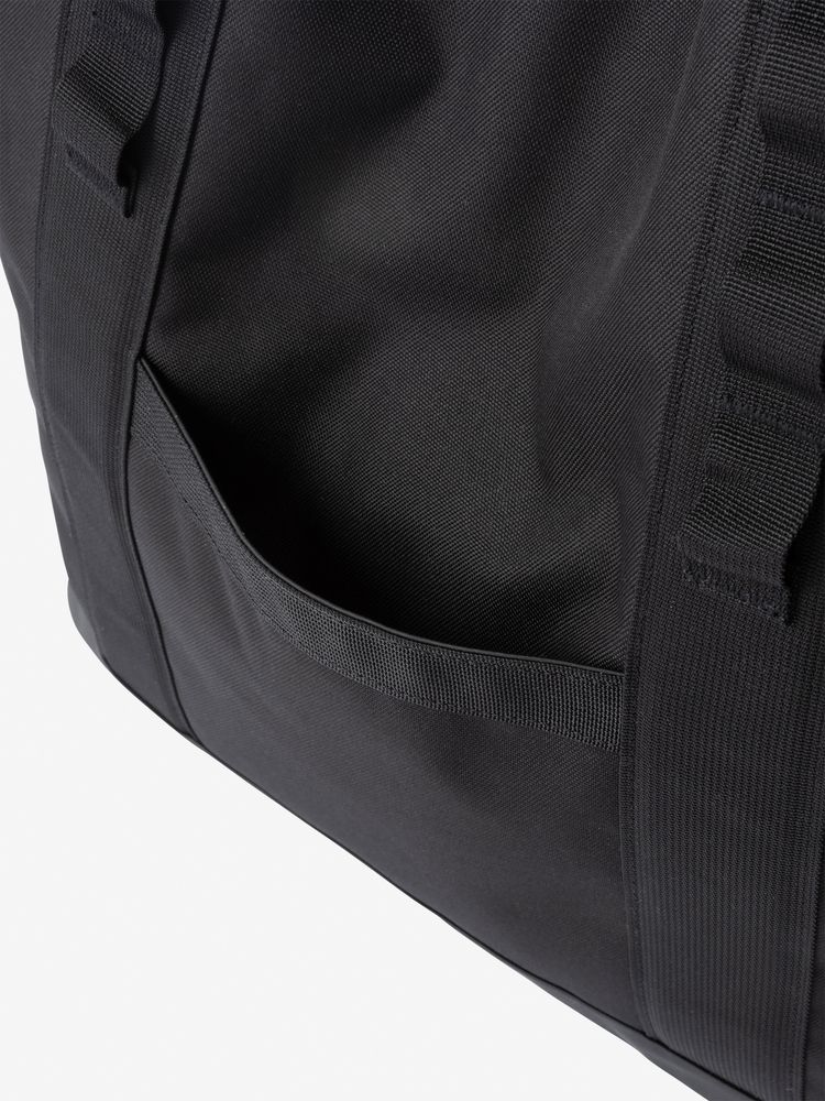 材質採用具有優異防潑水性與耐用性的 600D再生聚酯纖維布料製成,可依據行李多寡進行壓縮調整,織帶上的扣具為鋁製掛勾,可兼作開瓶器使用,包內配有分隔板,可根據行李的種類選擇水平或垂直方向來調整空間配置,方便收納,是一款容量37L,能有效收納露營時小型裝備的托特包。